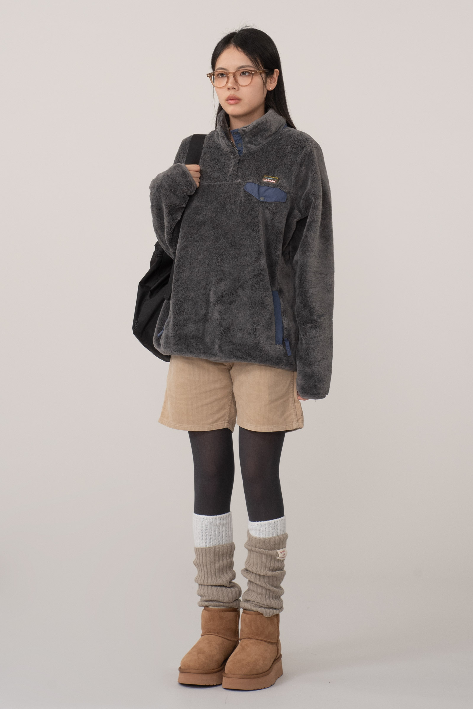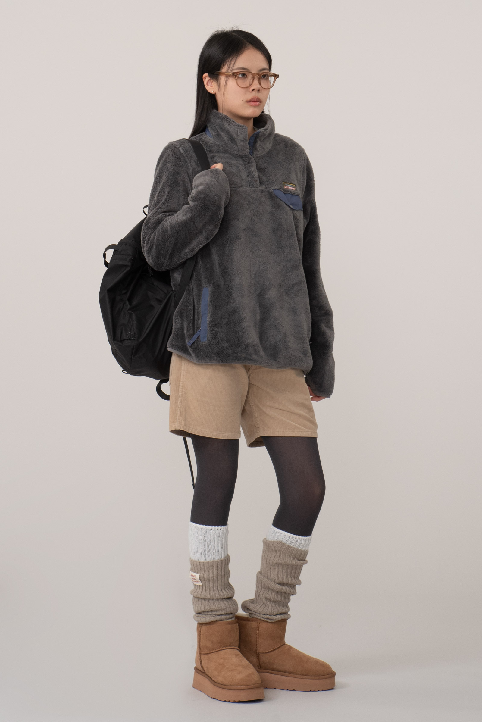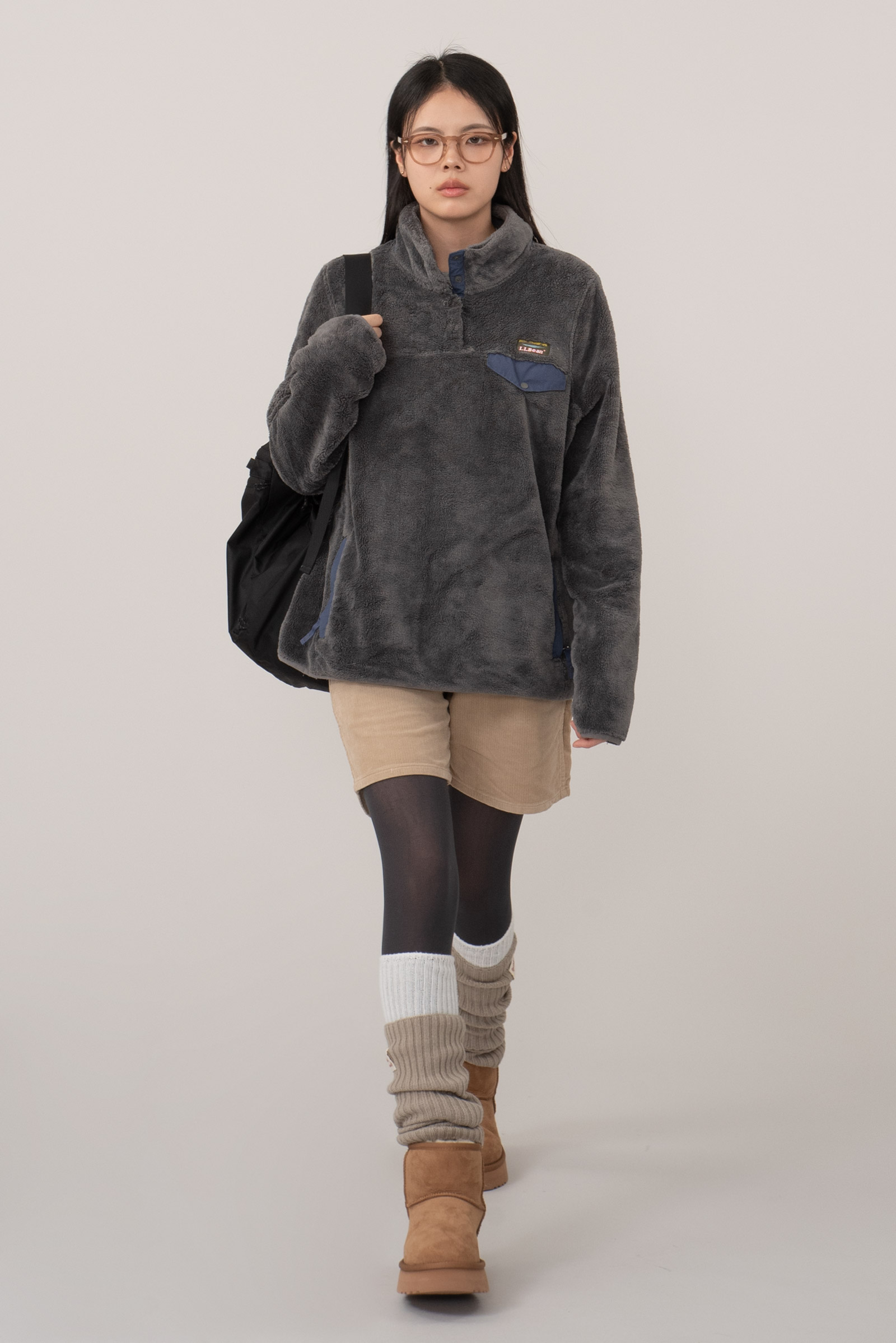 추운 계절이면 빼놓을 수 없는 플리스 소재에 풀오버 스냅 버튼, 가슴의 작은 포켓이 있는 반가운 모델이에요.