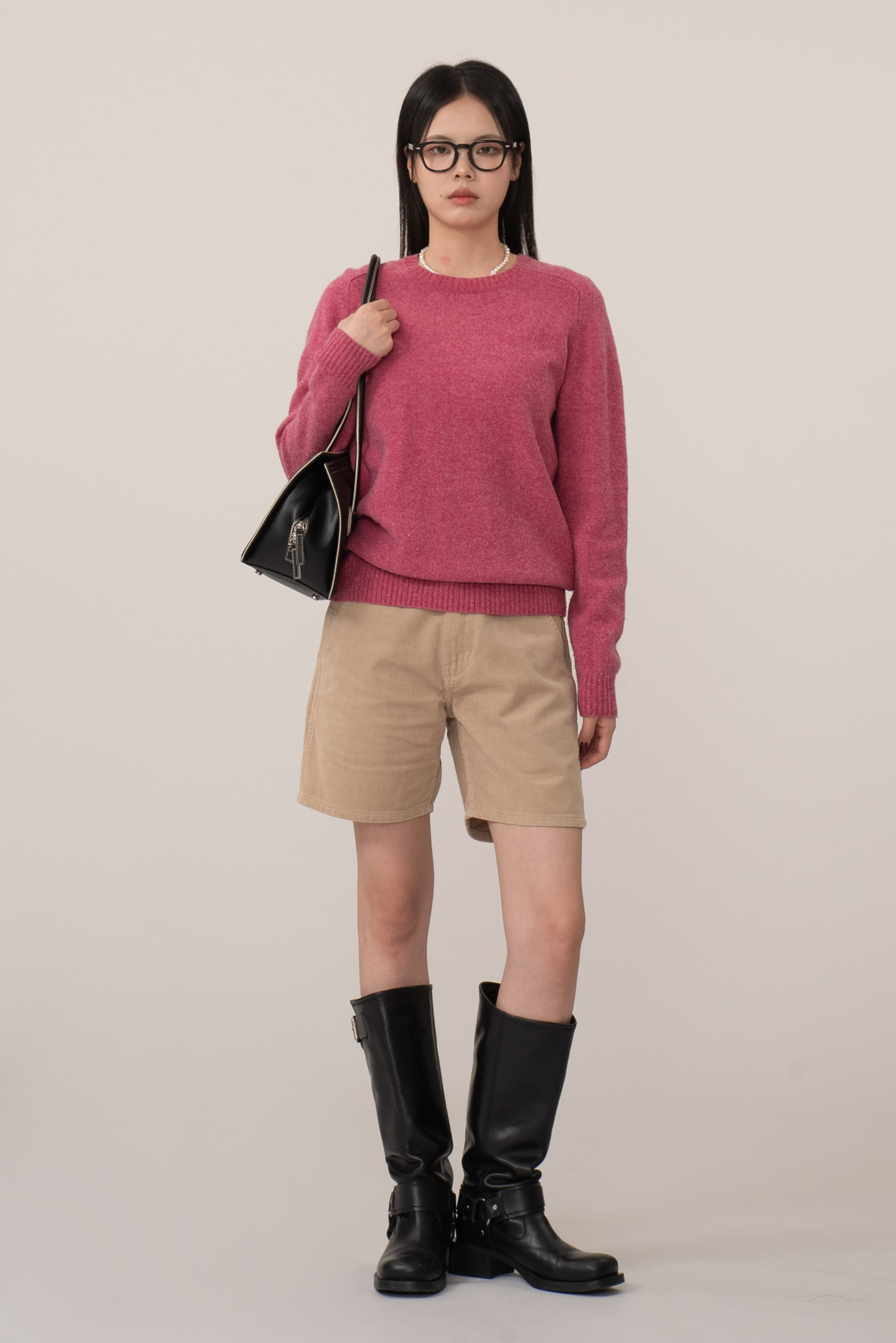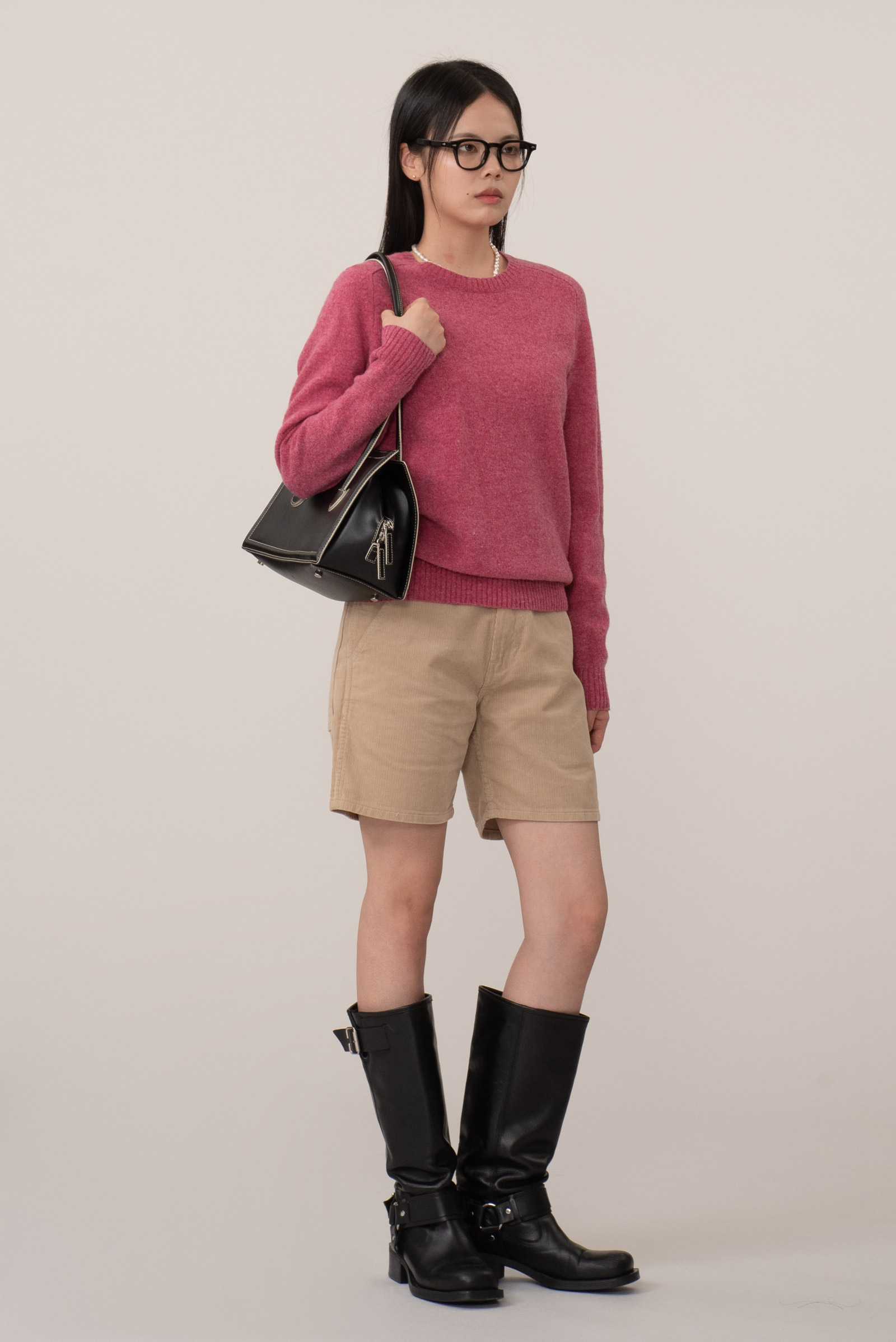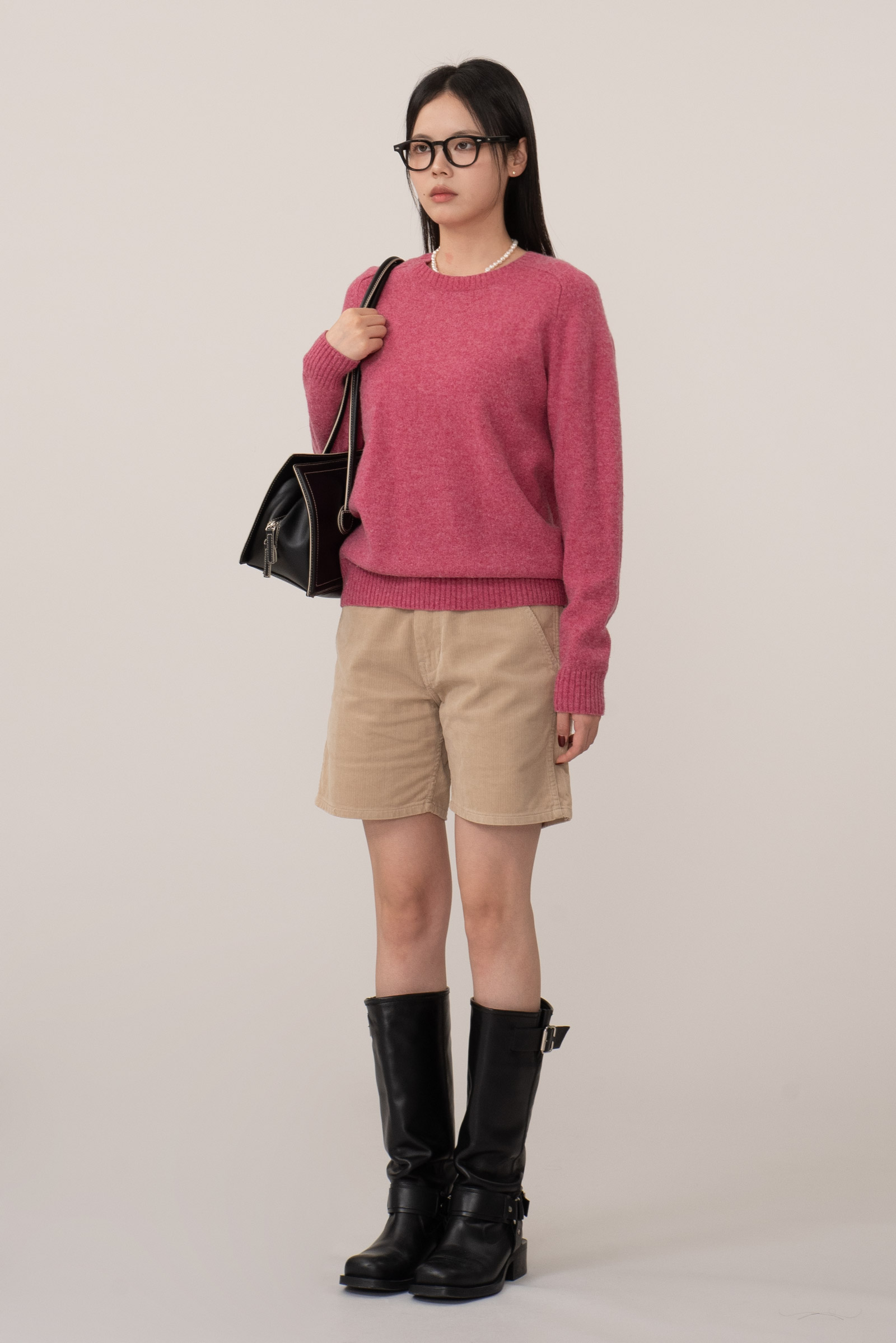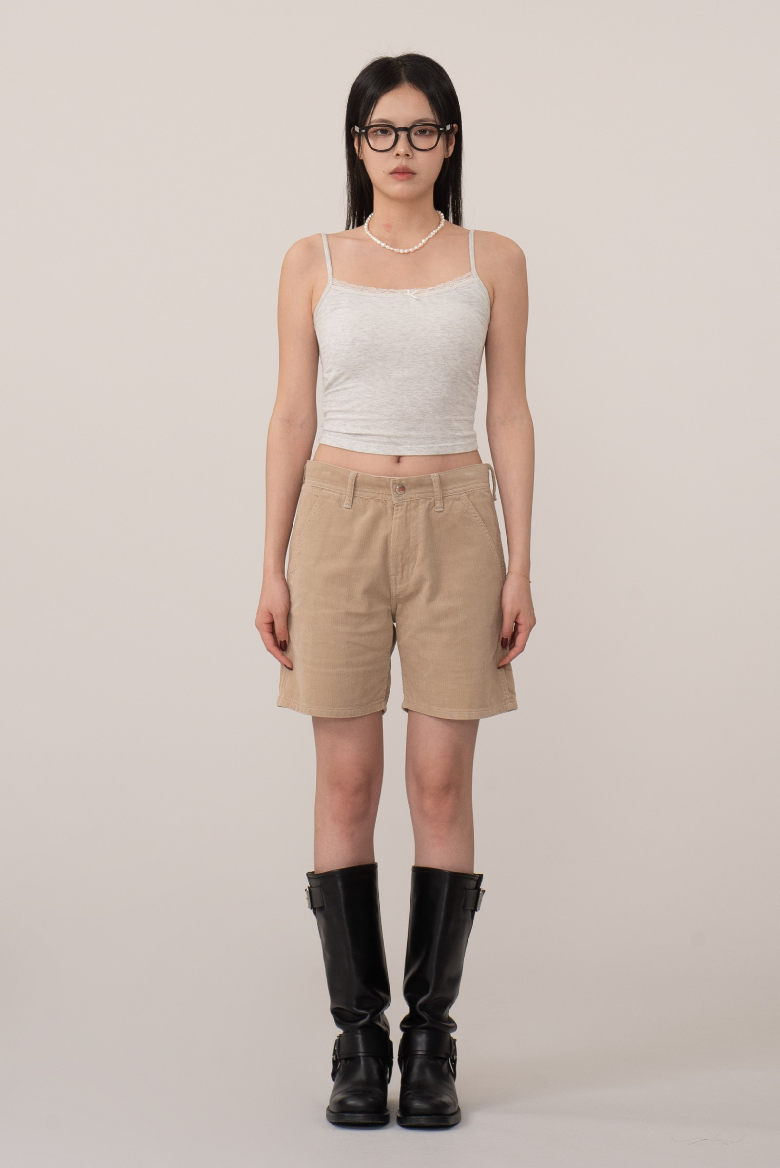 허벅지 절반 정도 떨어지는 미니멀한 기장과 여유 있는 핏은 전체적인 실루엣을 담백하게 잡아주어요.