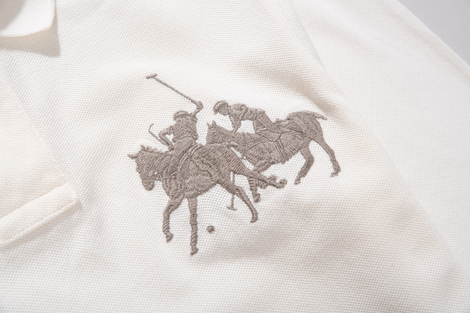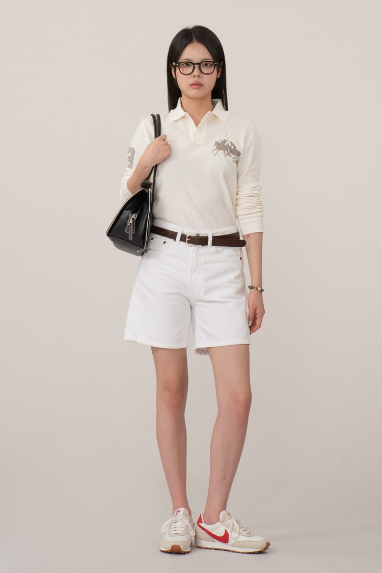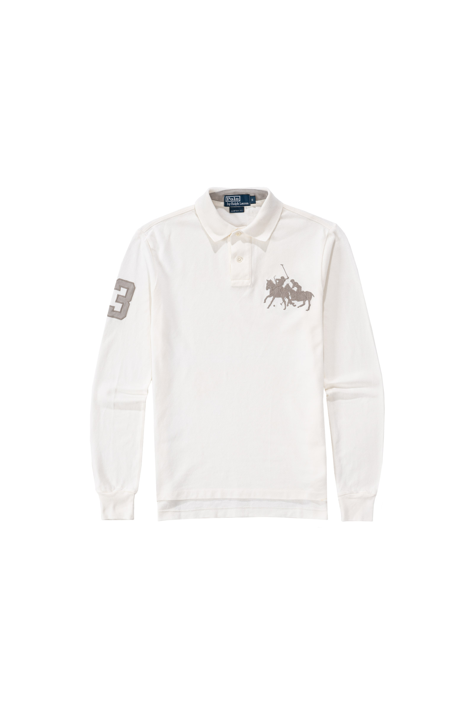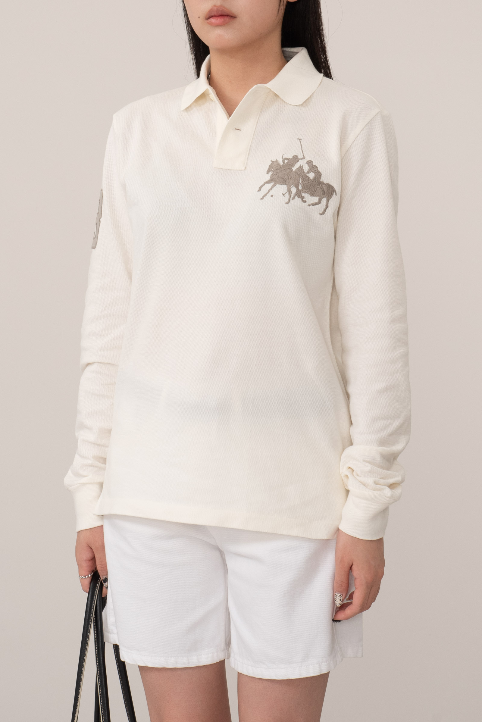좋은 컨디션으로 입고되었으며 부드럽고 따뜻한 아이보리 컬러, 전면 커다란 폴로 게임 자수가 눈에 띄네요.
