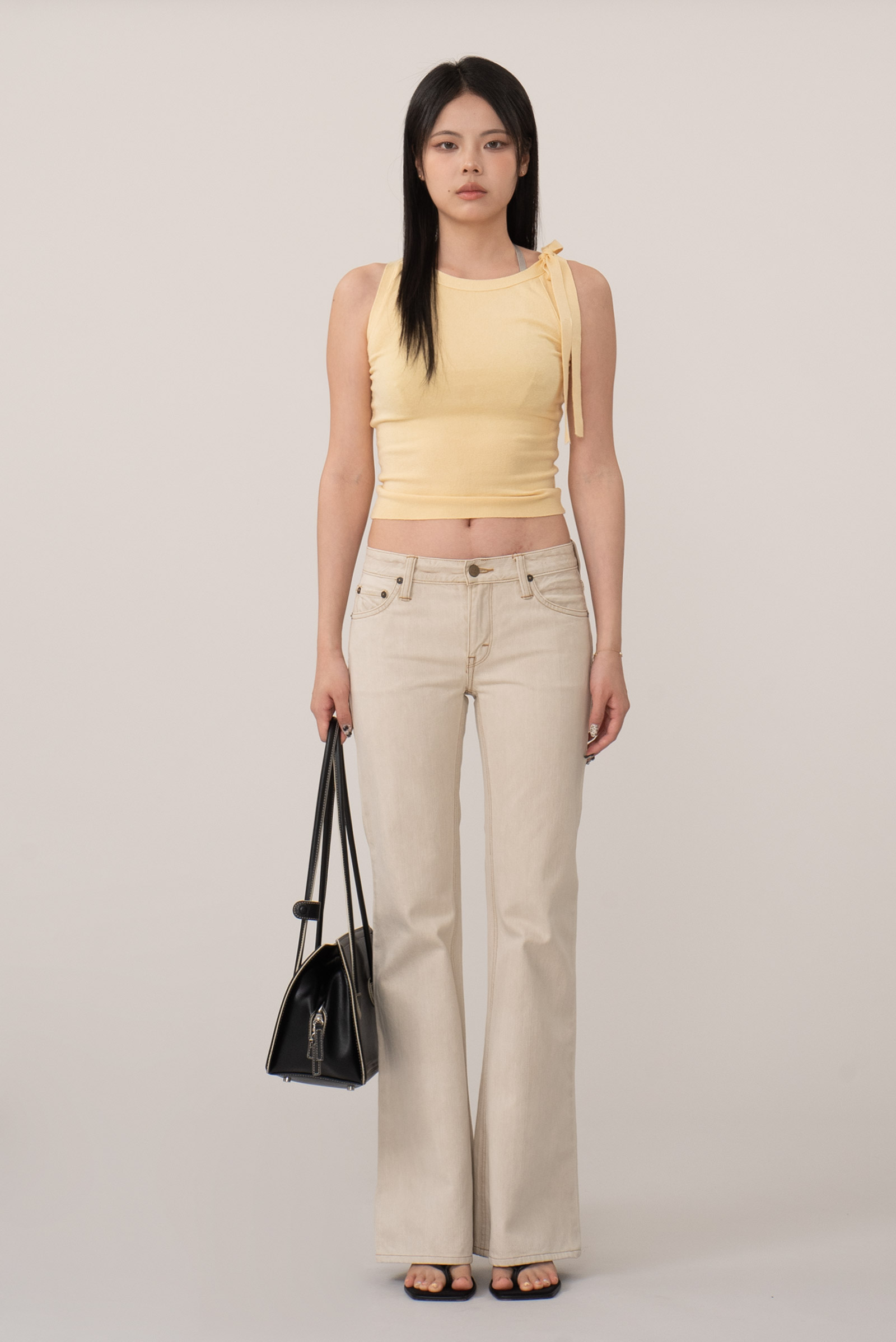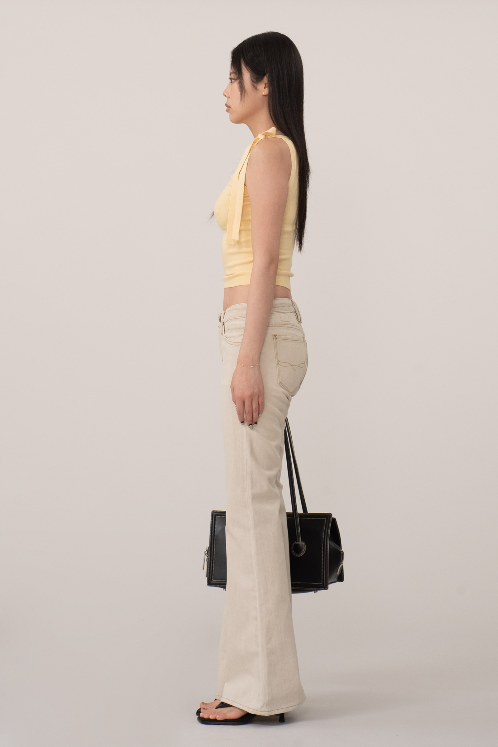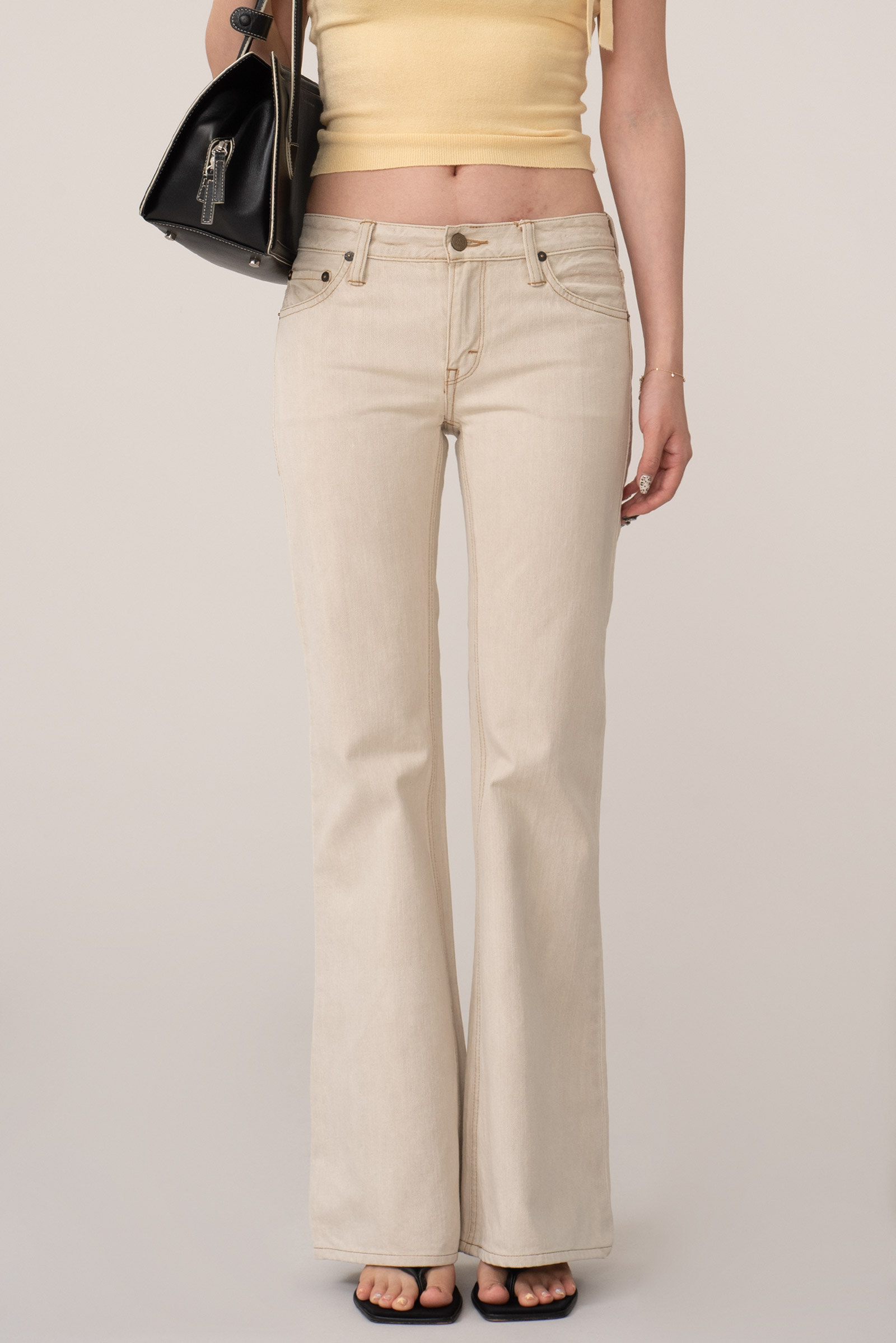 능직 데님 소재의 크림 컬러가 주는 부드럽고 고급스러운 무드와 허벅지부터 자연스럽게 퍼지는 벨바텀 실루엣이 특징인데요.