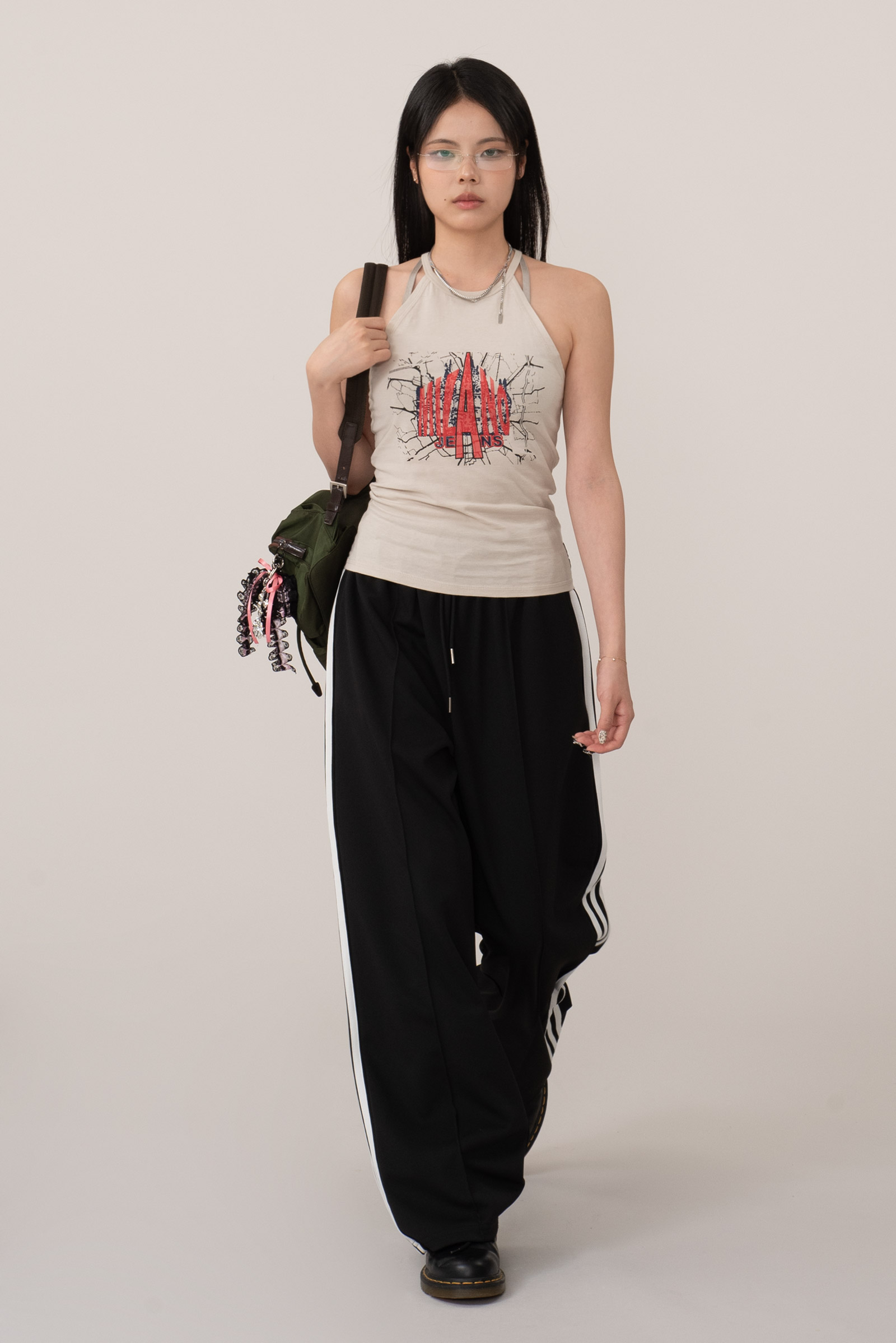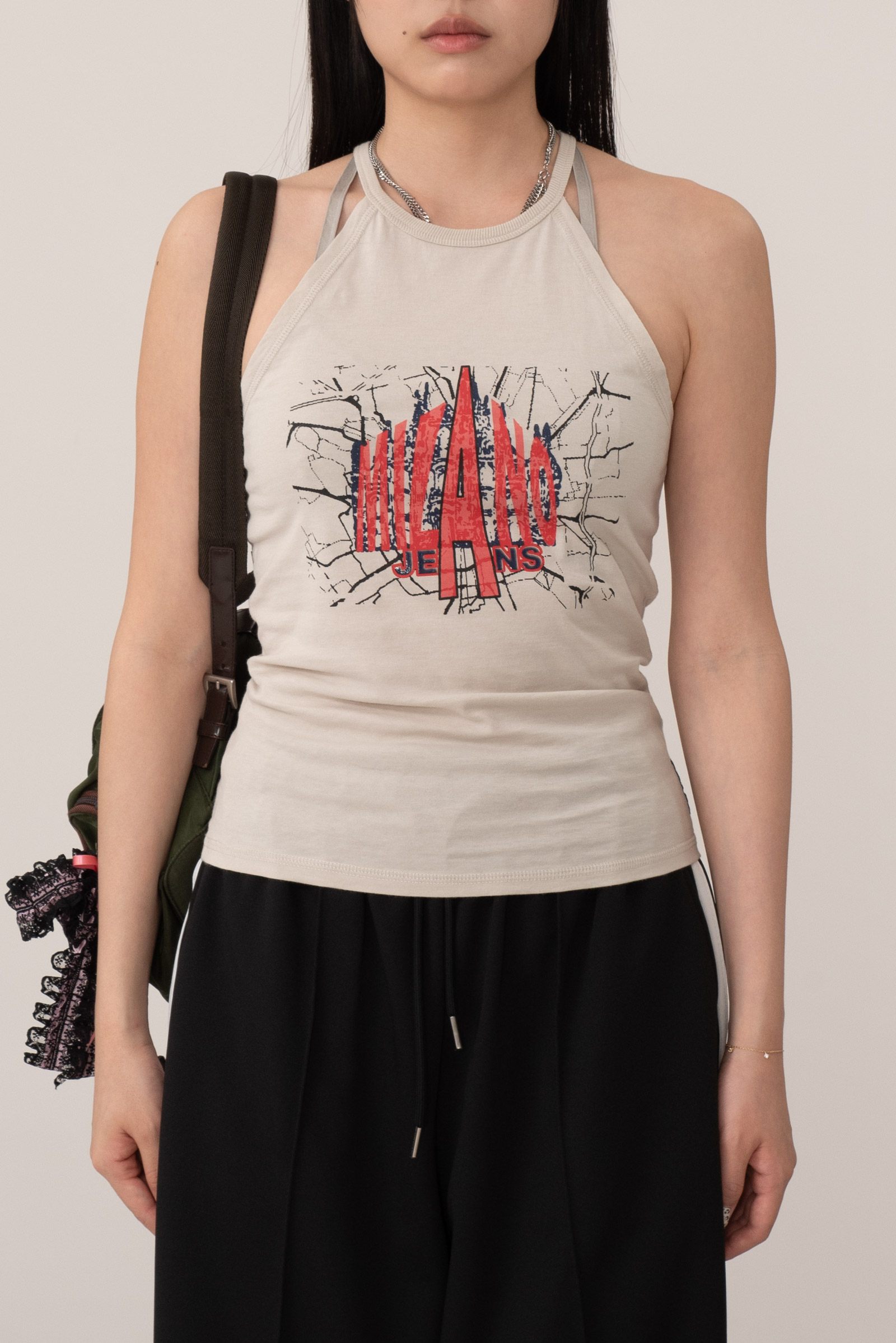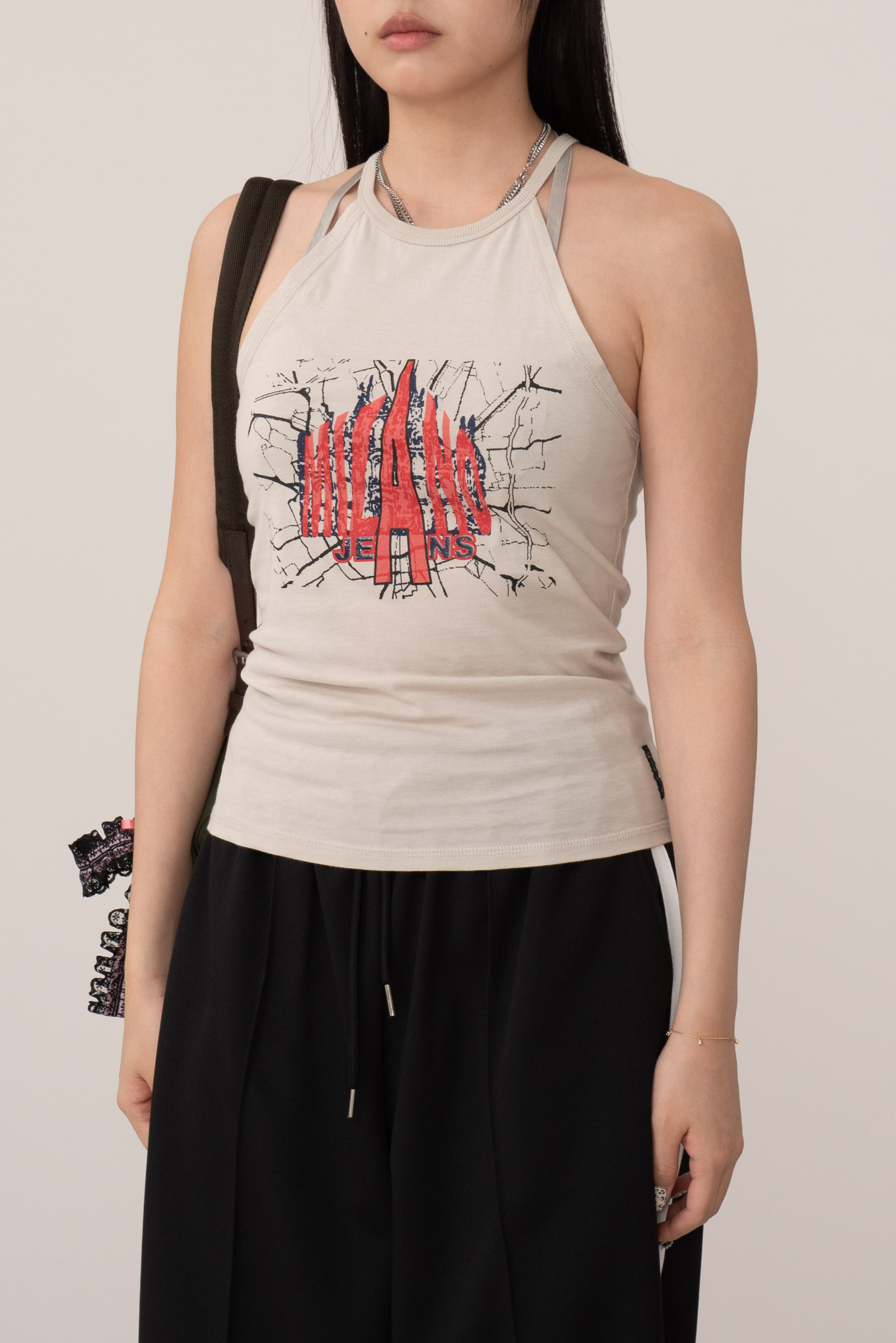 홀터넥 느낌의 넥 디테일과 전, 후면 프린팅 돋보이는 제품이에요.