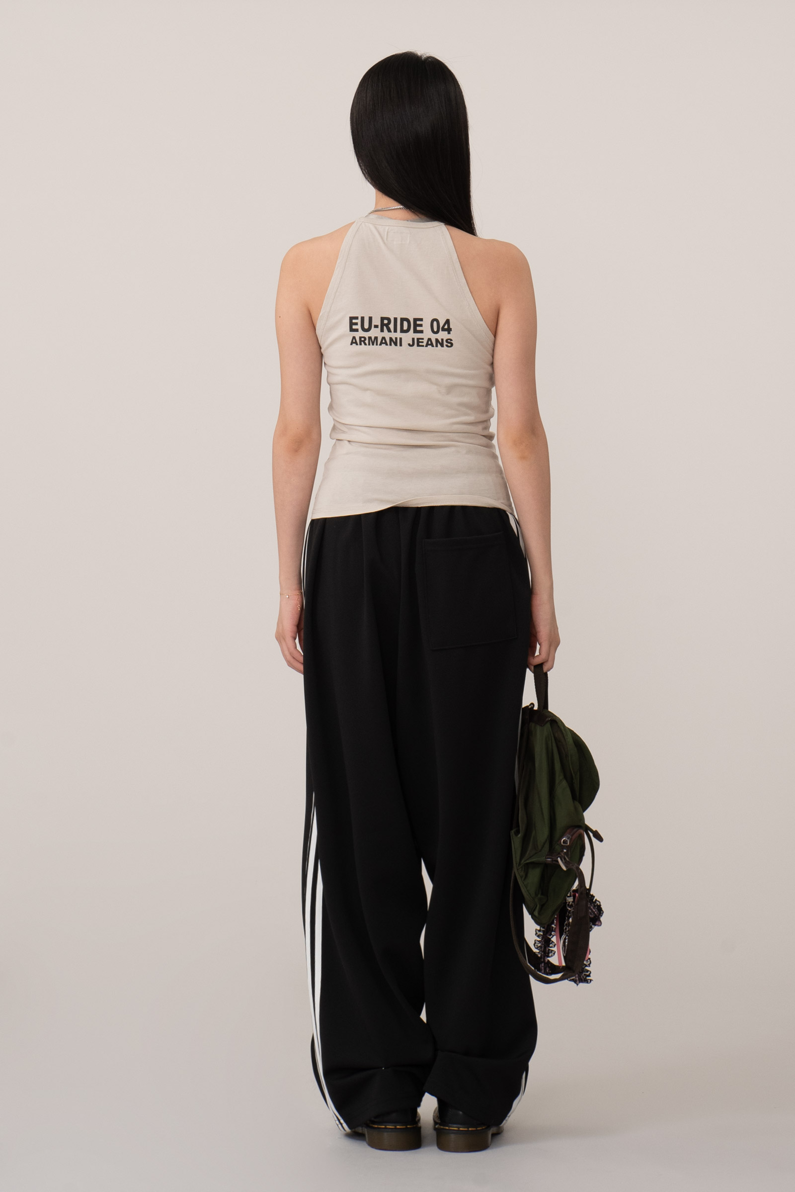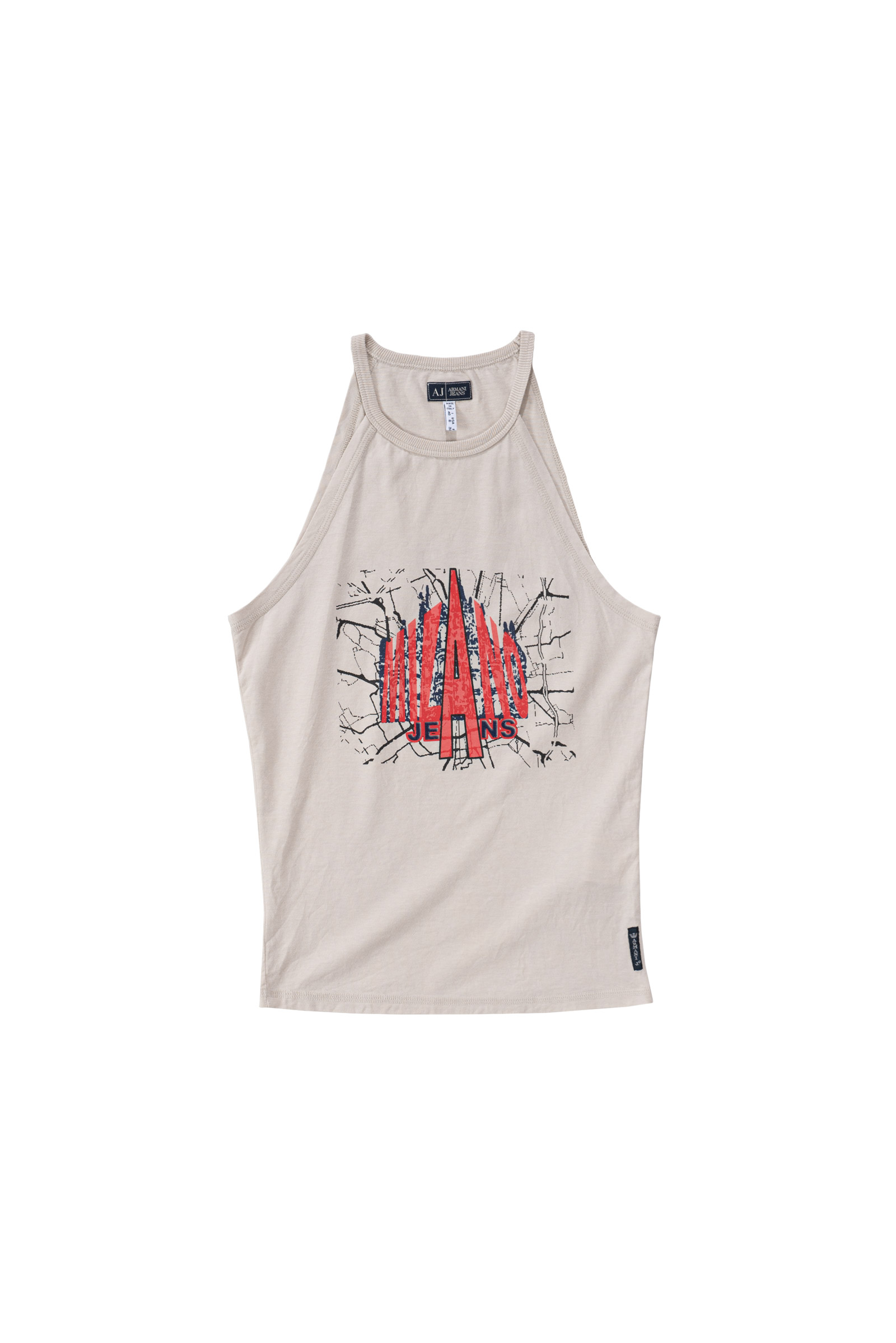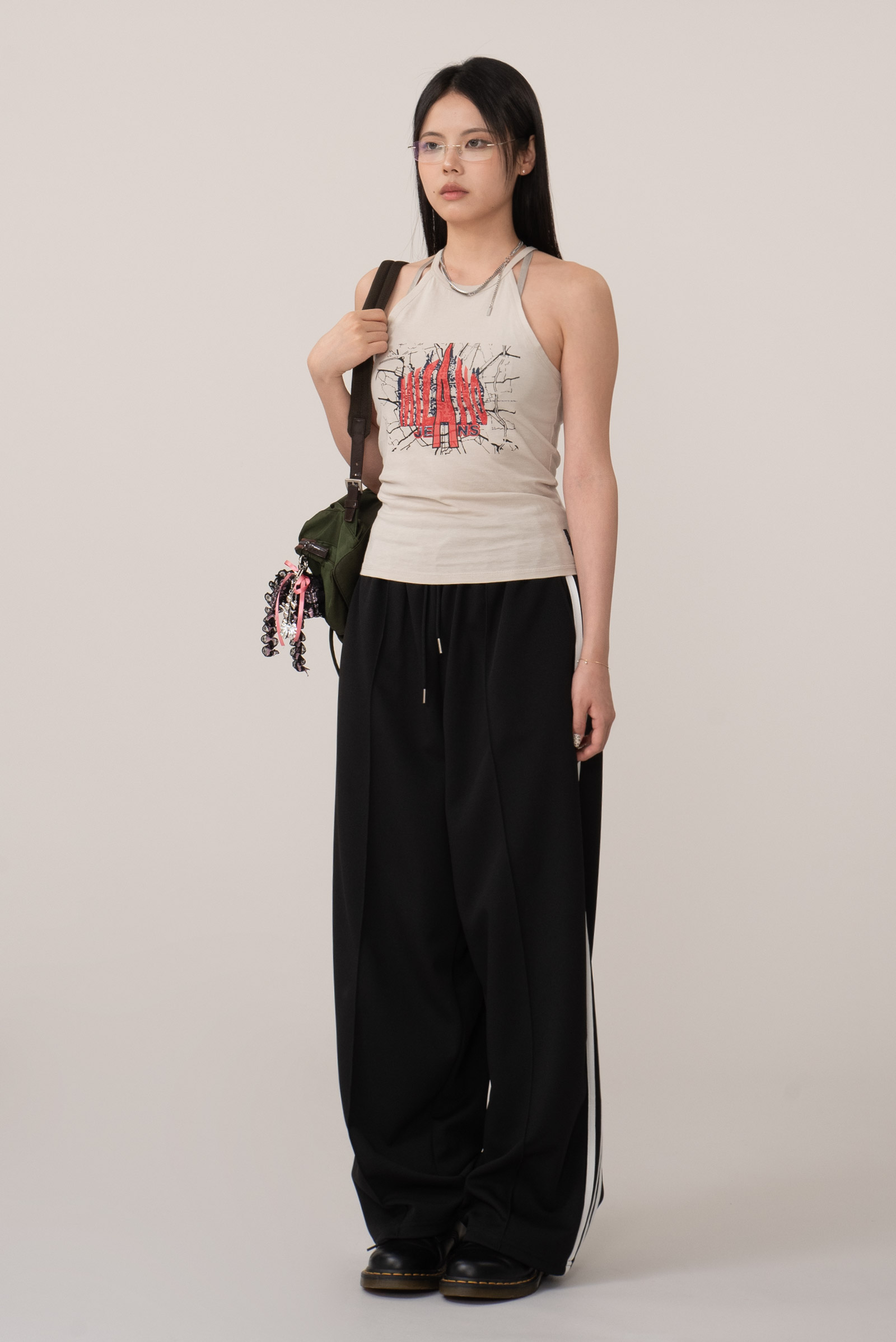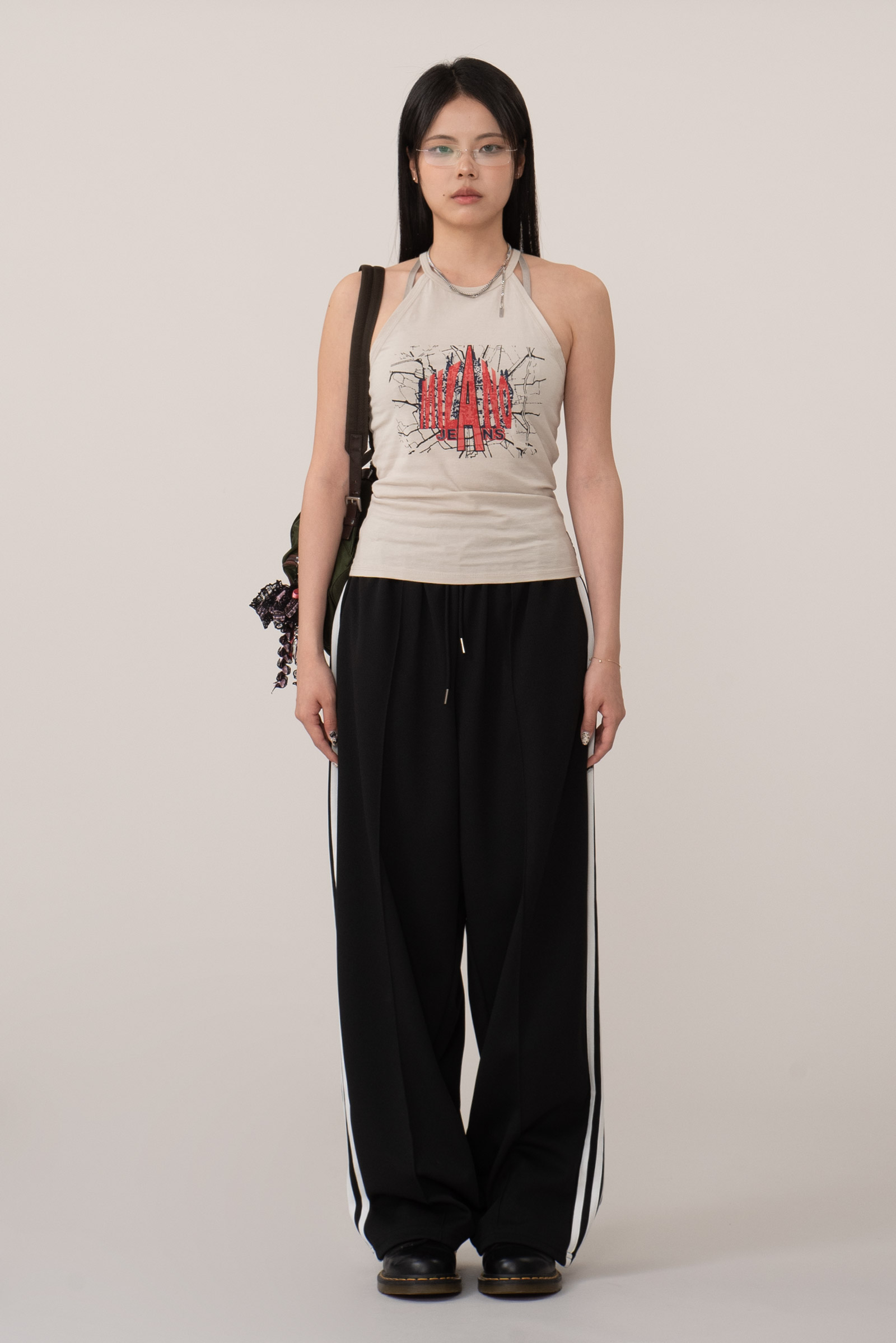 홀터넥 느낌의 넥 디테일과 전, 후면 프린팅 돋보이는 제품이에요.