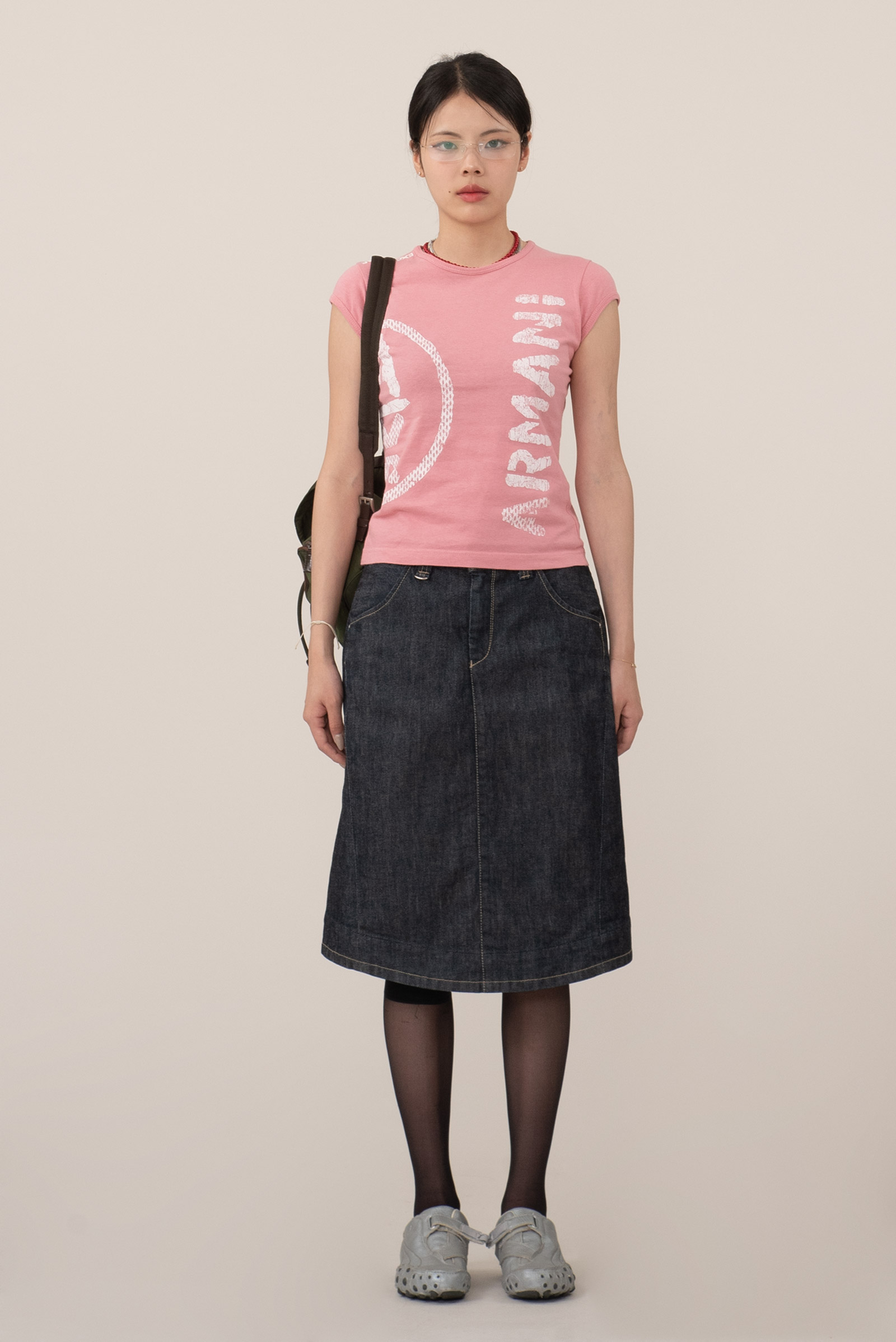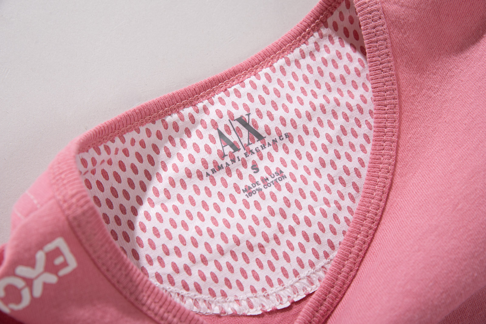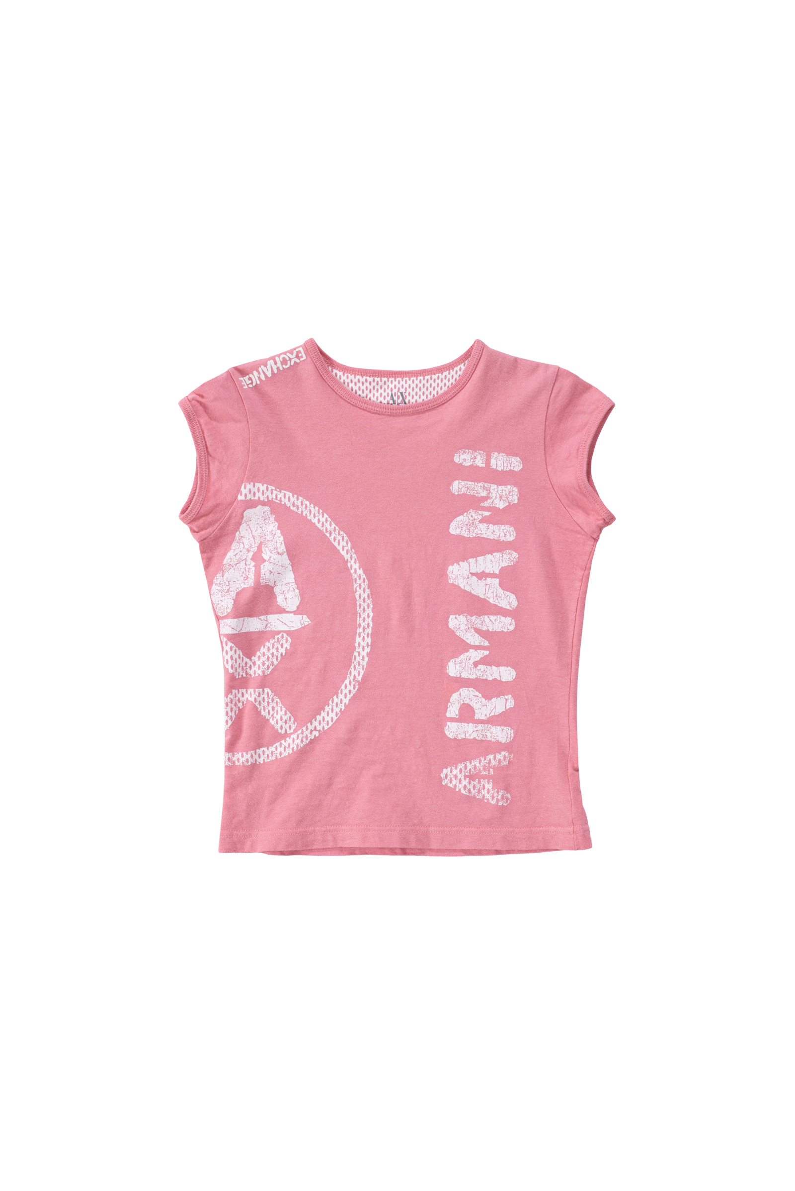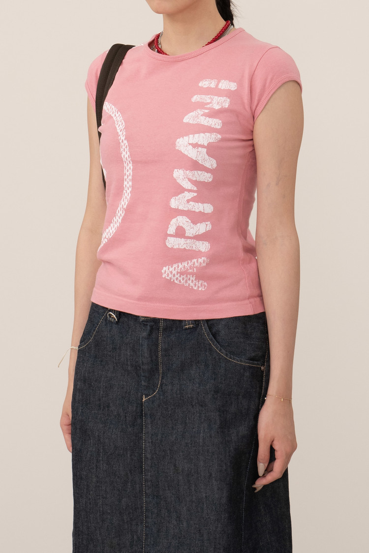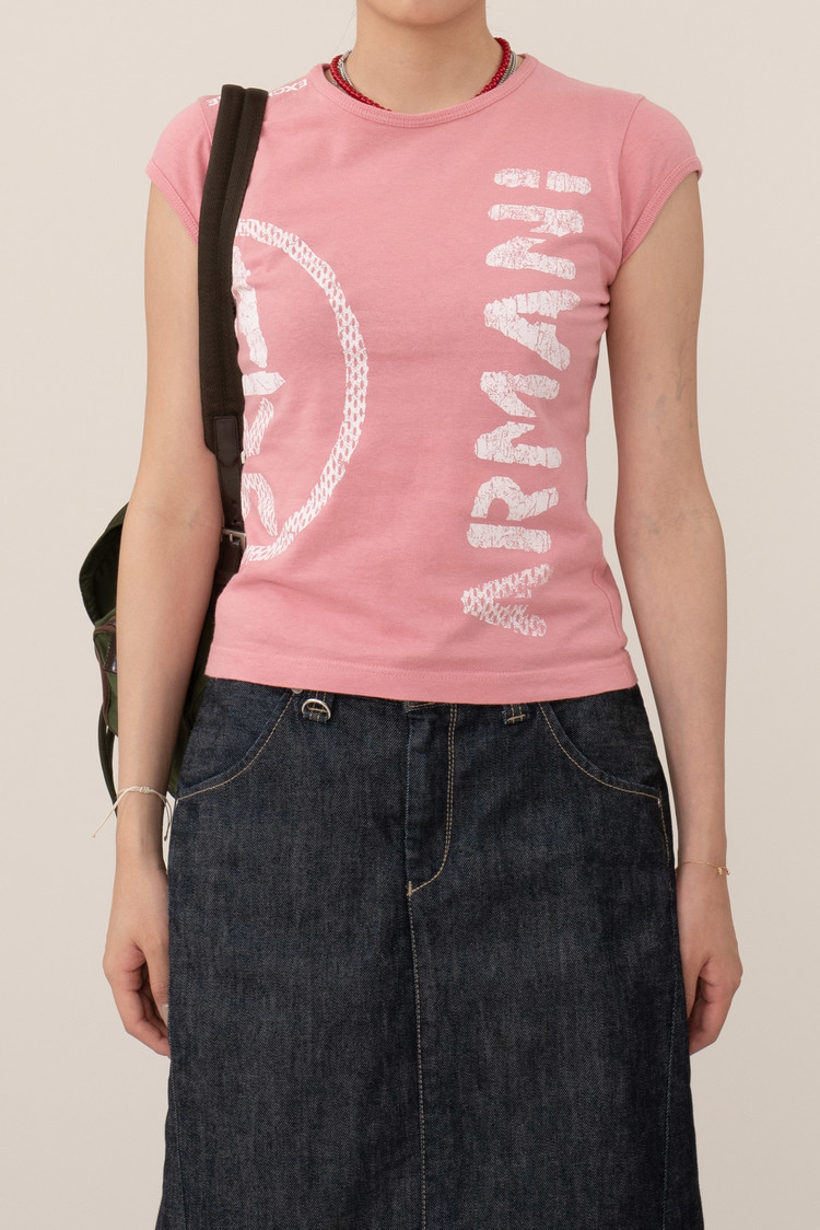 귀엽고 부드러운 핑크 컬러에 전면의 아르마니 프린팅이 눈에 띄며 소매가 짧은 캡슬리브 타입으로 디테일에 신경을 쓴 제품이네요.