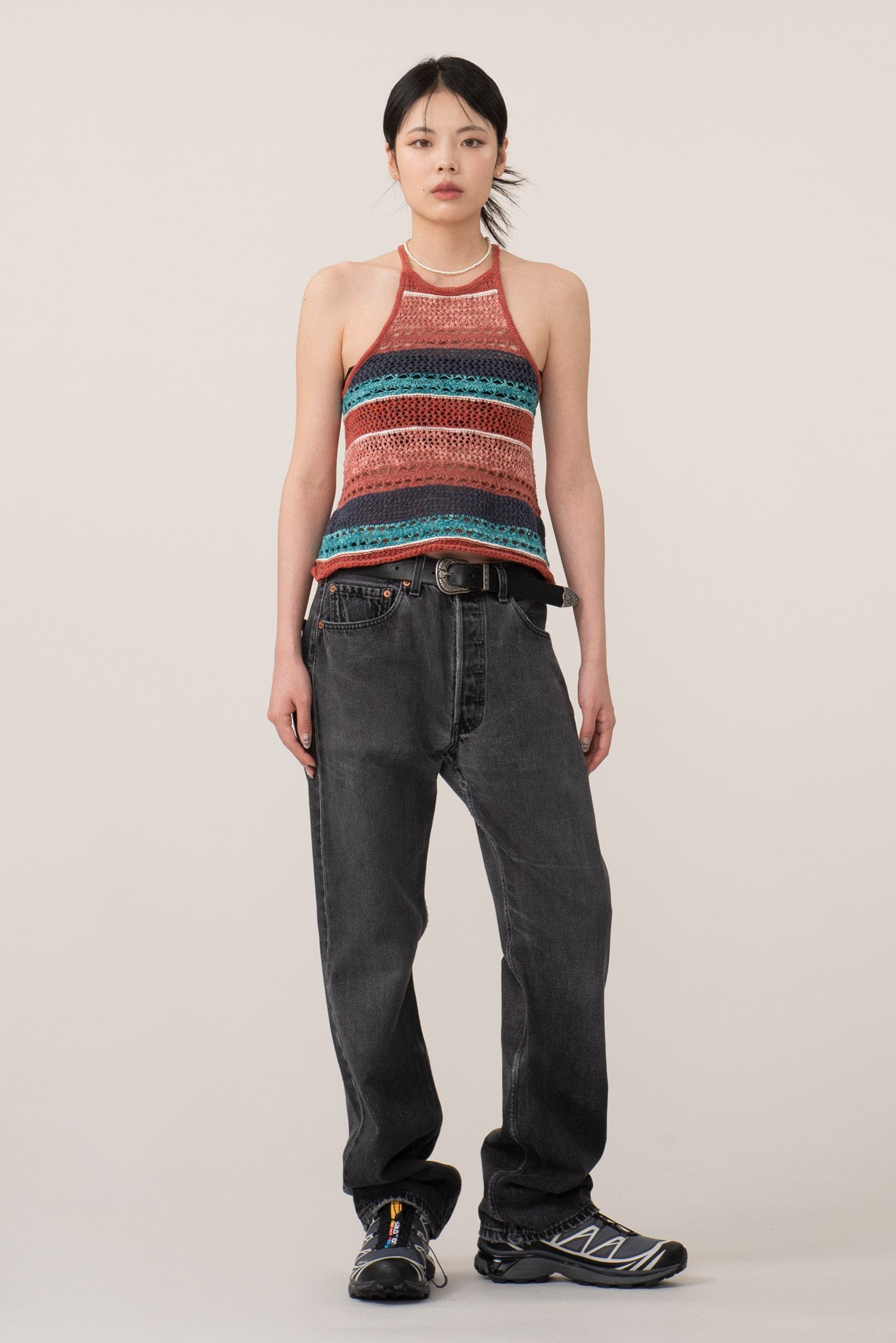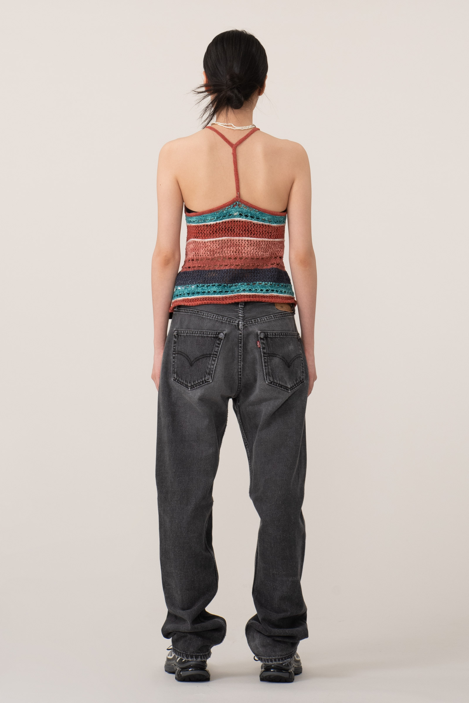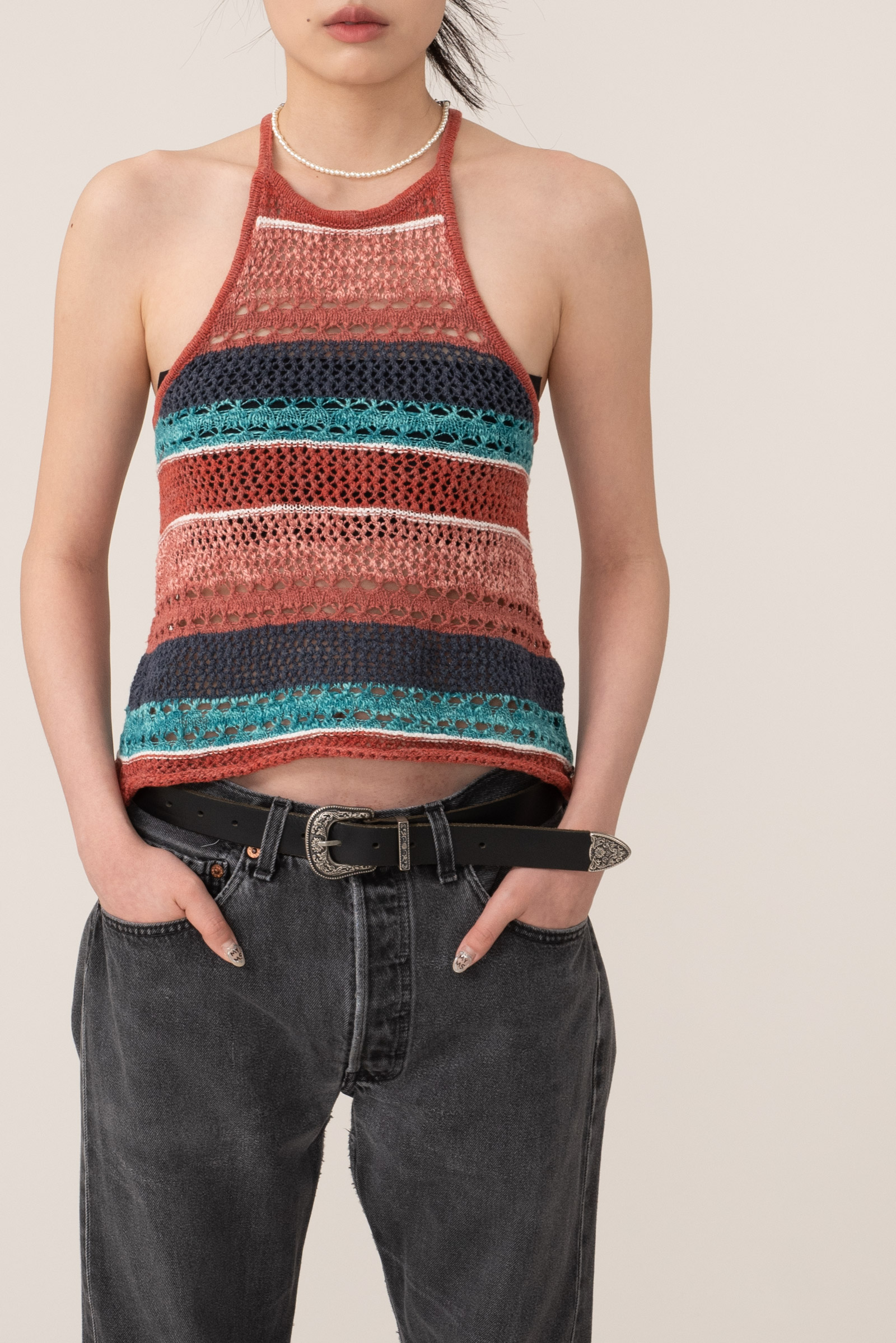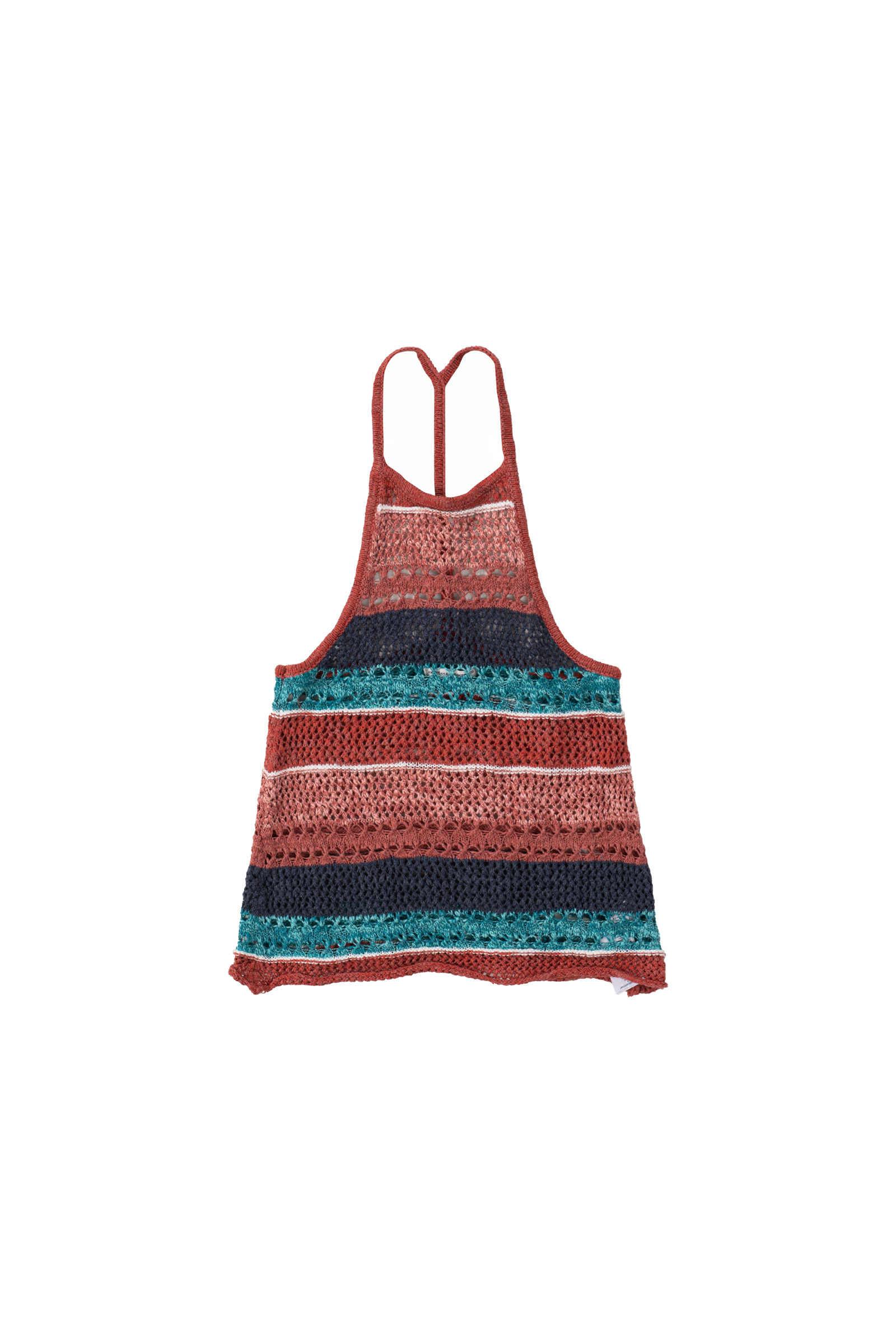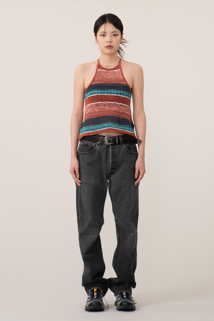 마찬가지로 여러가지 색이 섞인 코튼으로 그물 짜임의 시원한 슬리브리스 제품이에요.