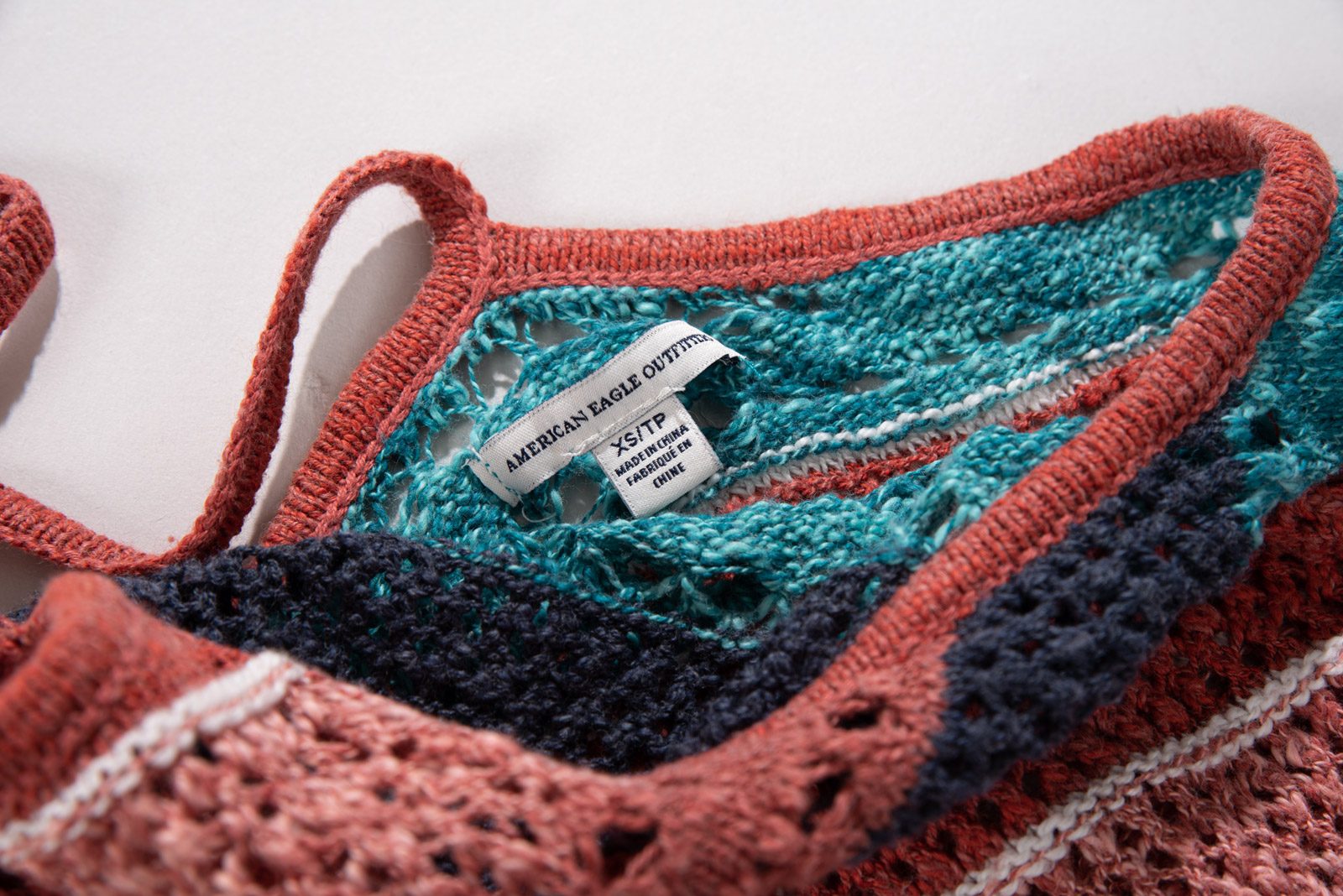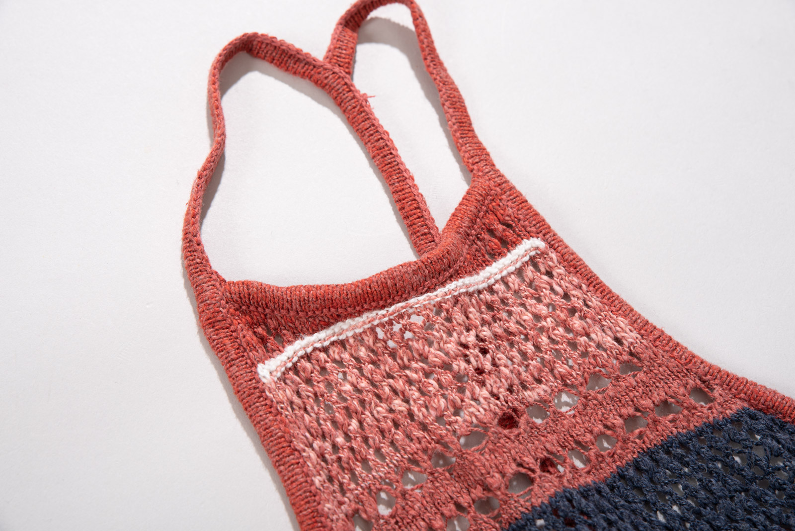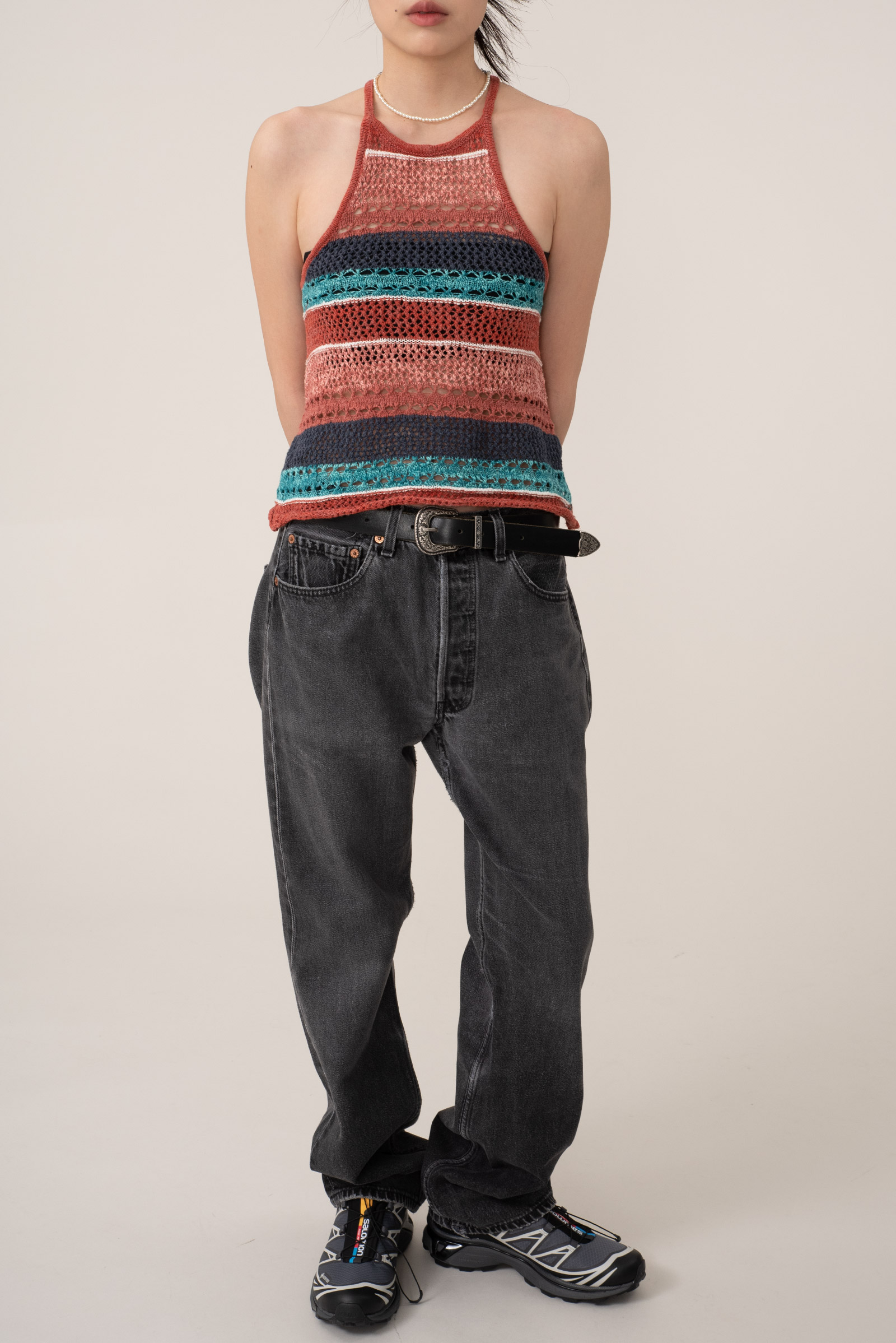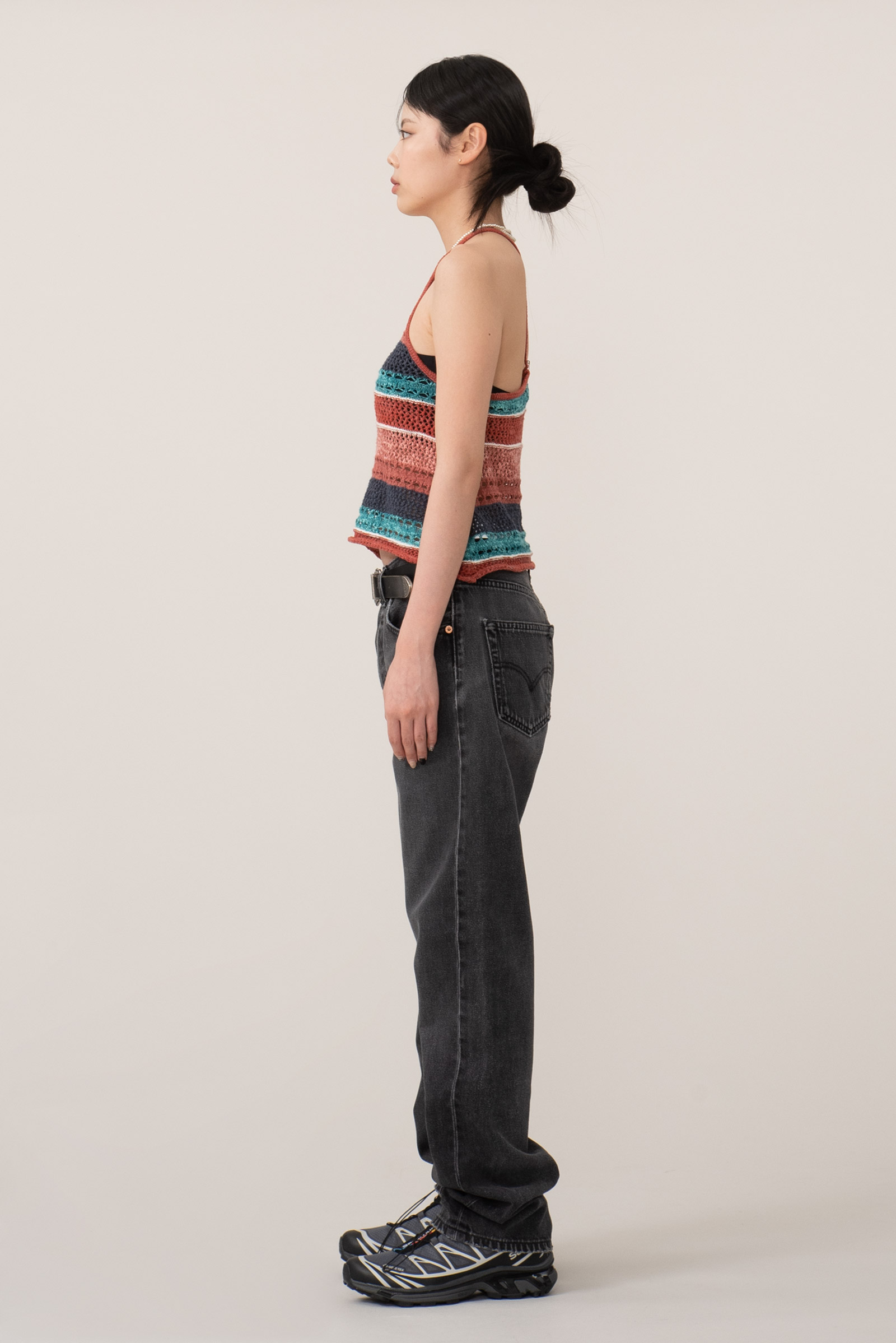 마찬가지로 여러가지 색이 섞인 코튼으로 그물 짜임의 시원한 슬리브리스 제품이에요.