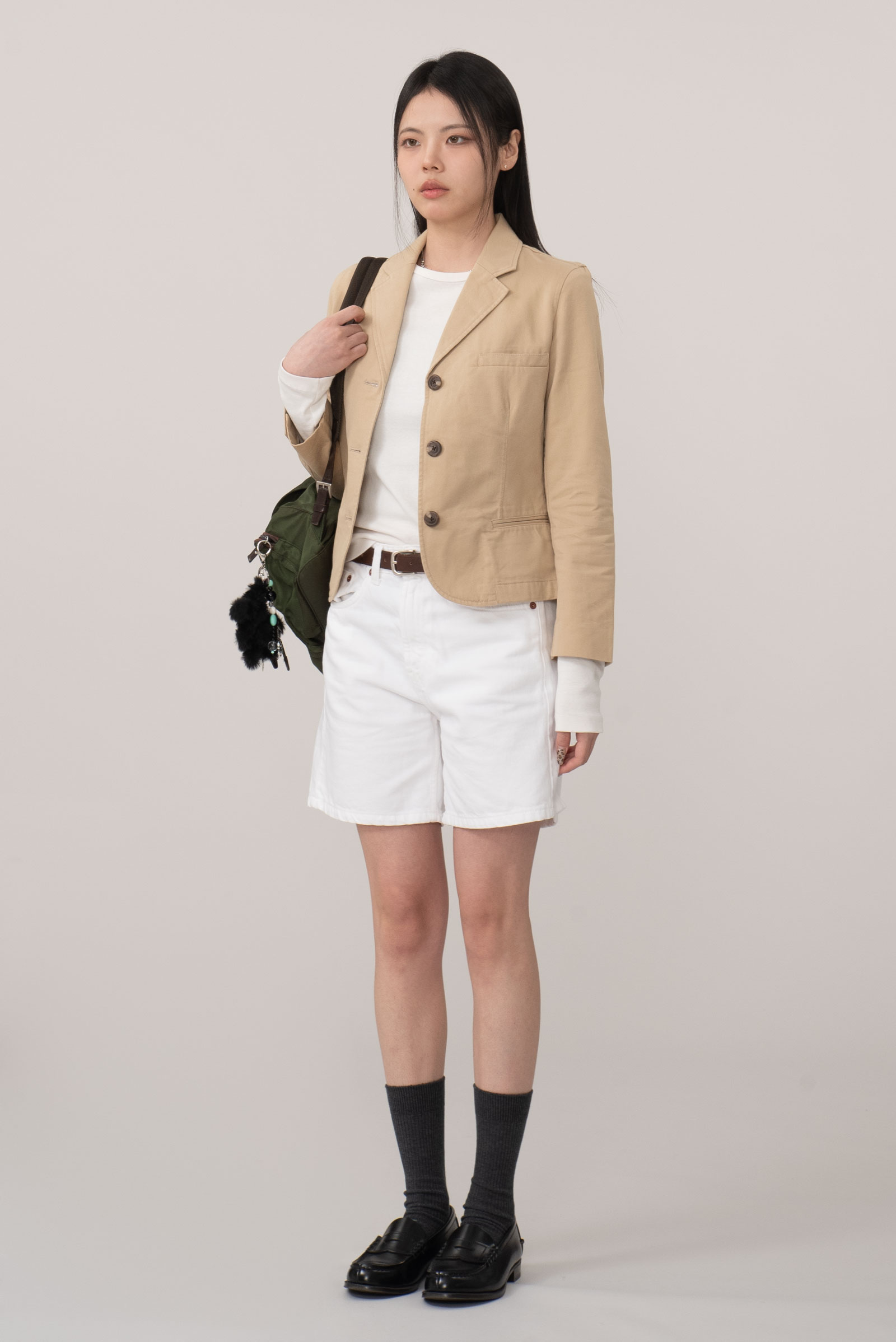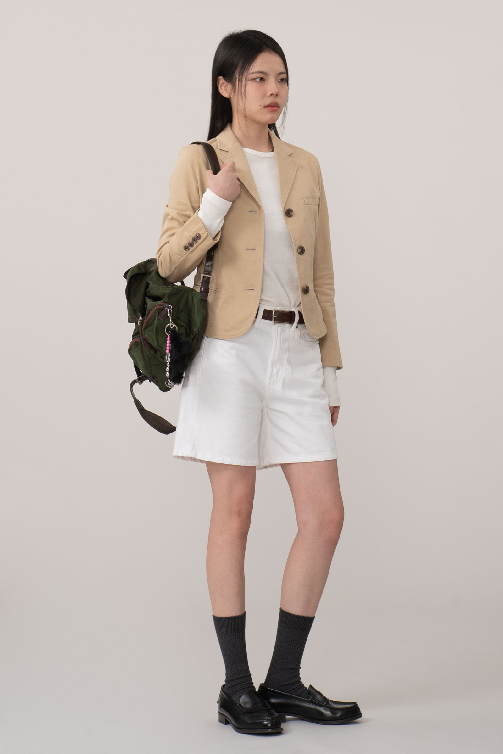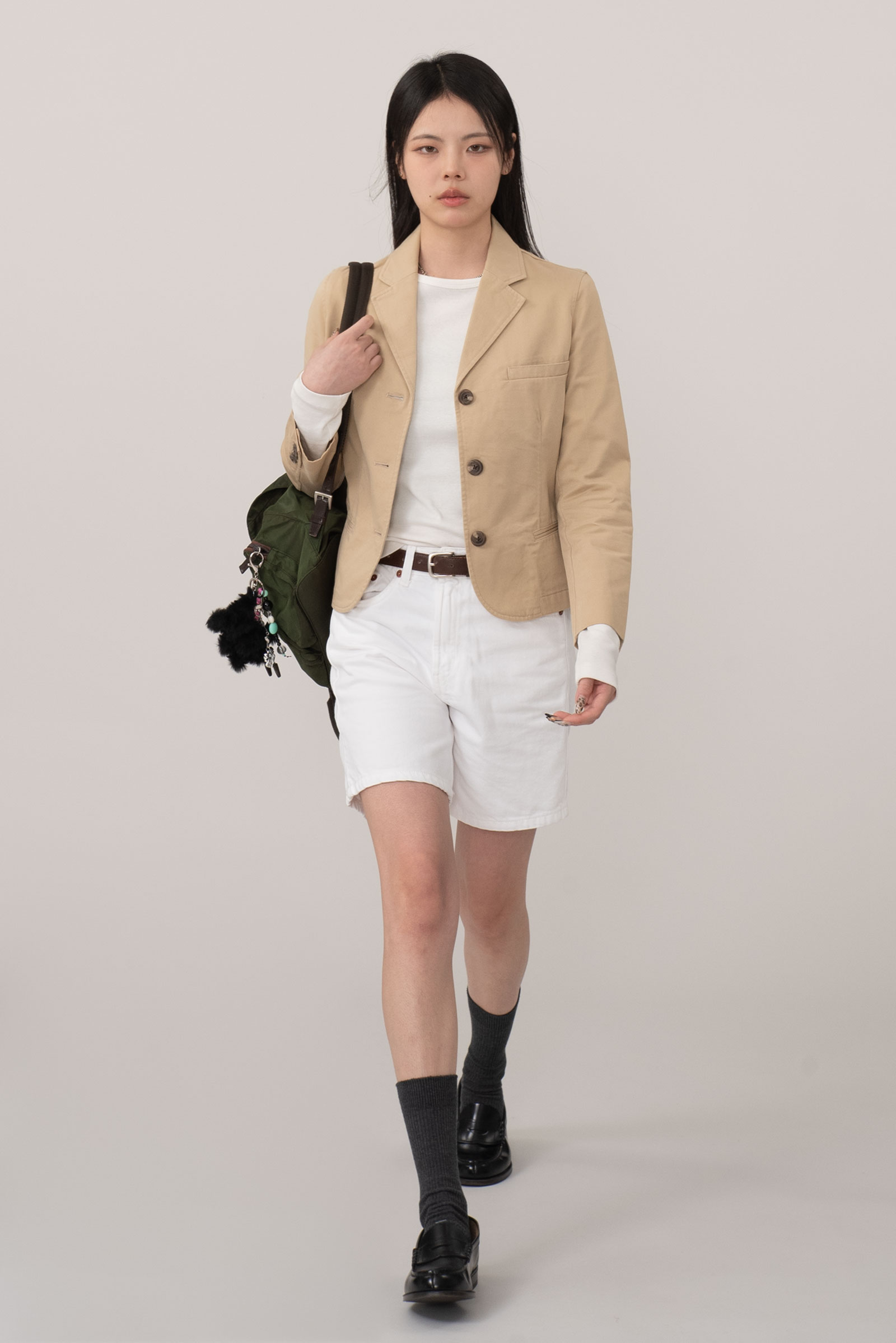 베이지 컬러에 크게 눈에 띄는 구석 없이 클래식하고 심플한 실루엣, 전반적인 밸런스에서 약간은 숏한 기장감으로 다리가 길어 보이는 효과가 있답니다.