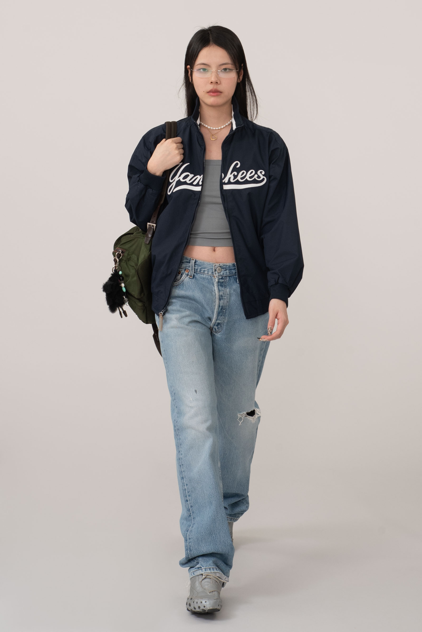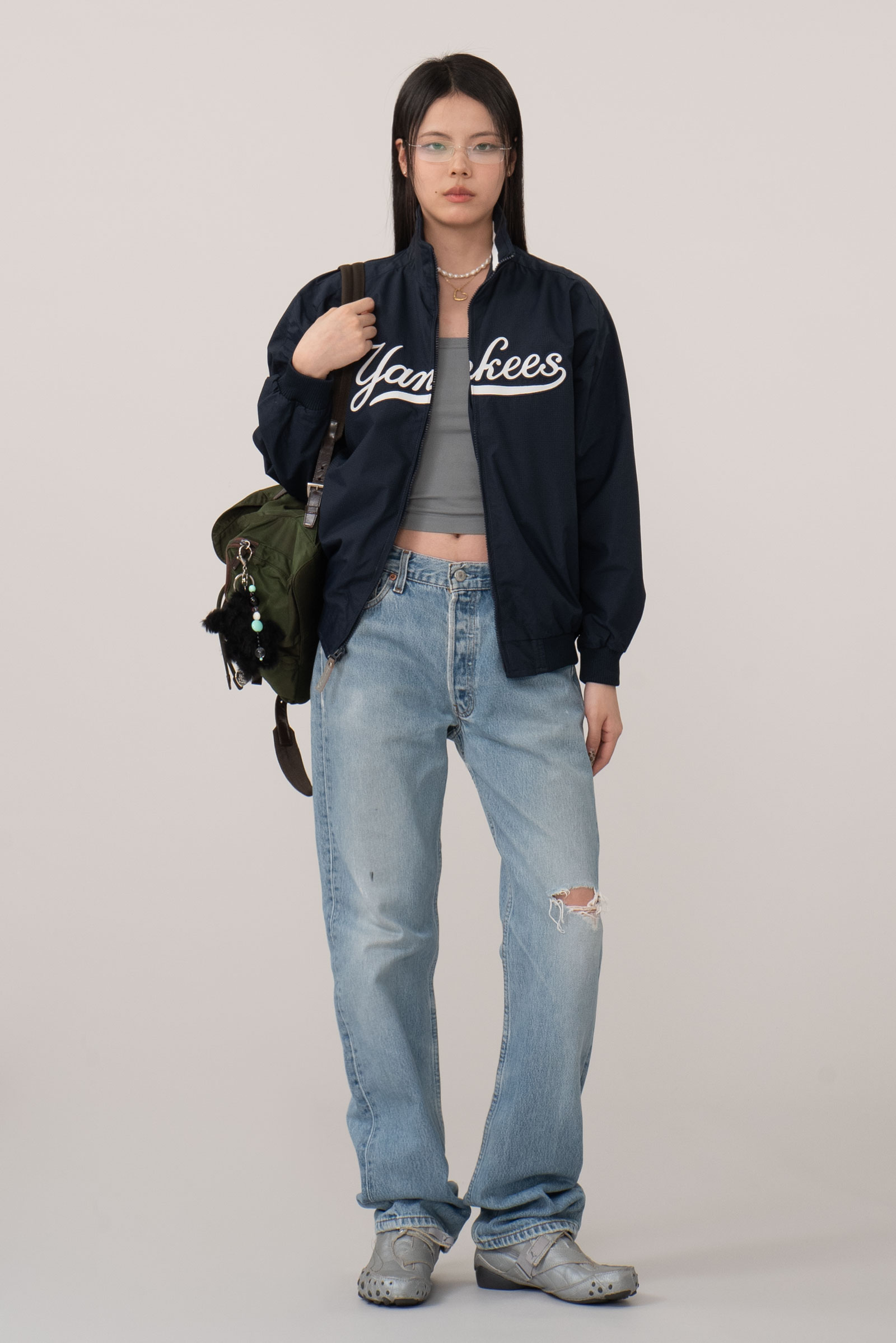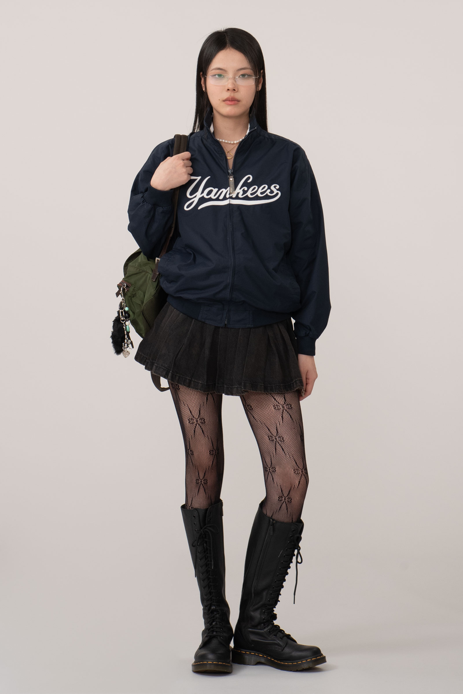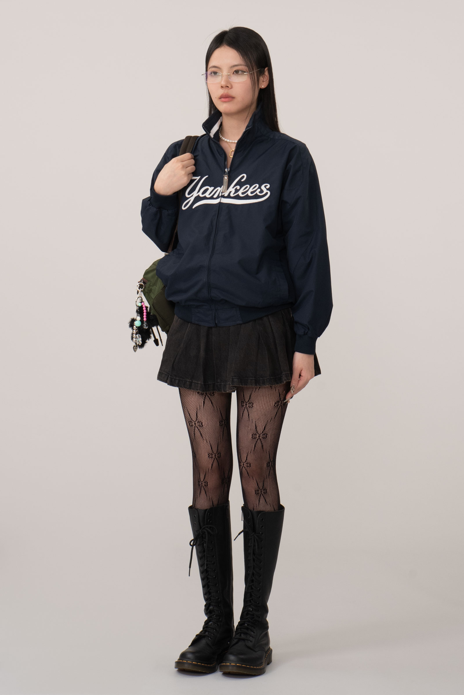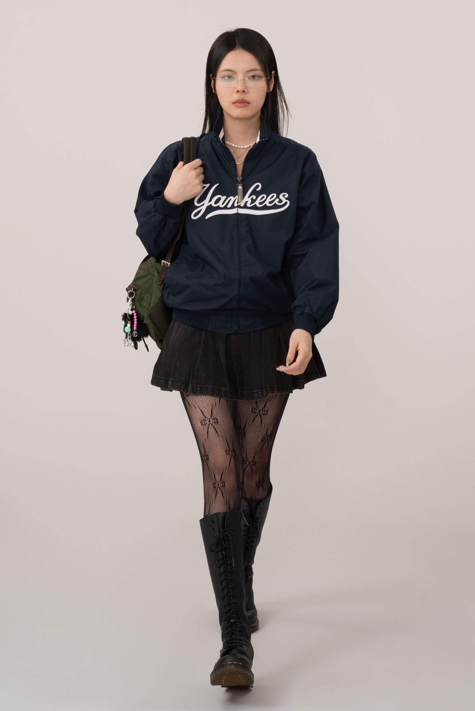 전면의 커다란 양키스 로고 외에는 남성용 보다 디테일이 적어 양키스 아플리케가 더욱 돋보이고 숏 바디에 허리 시보리가 있어 스타디움 재킷 특유의 실루엣이 포인트 된답니다.