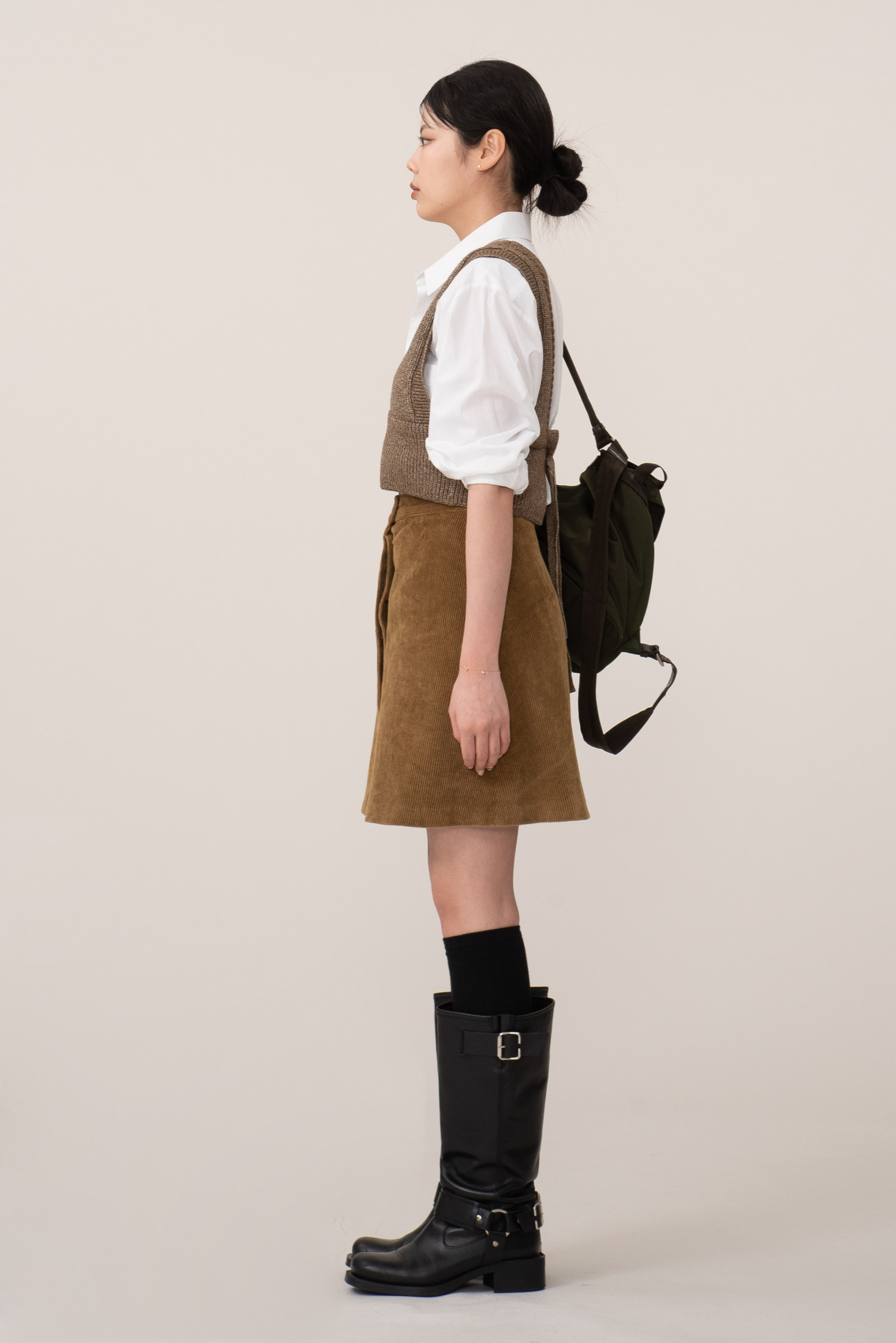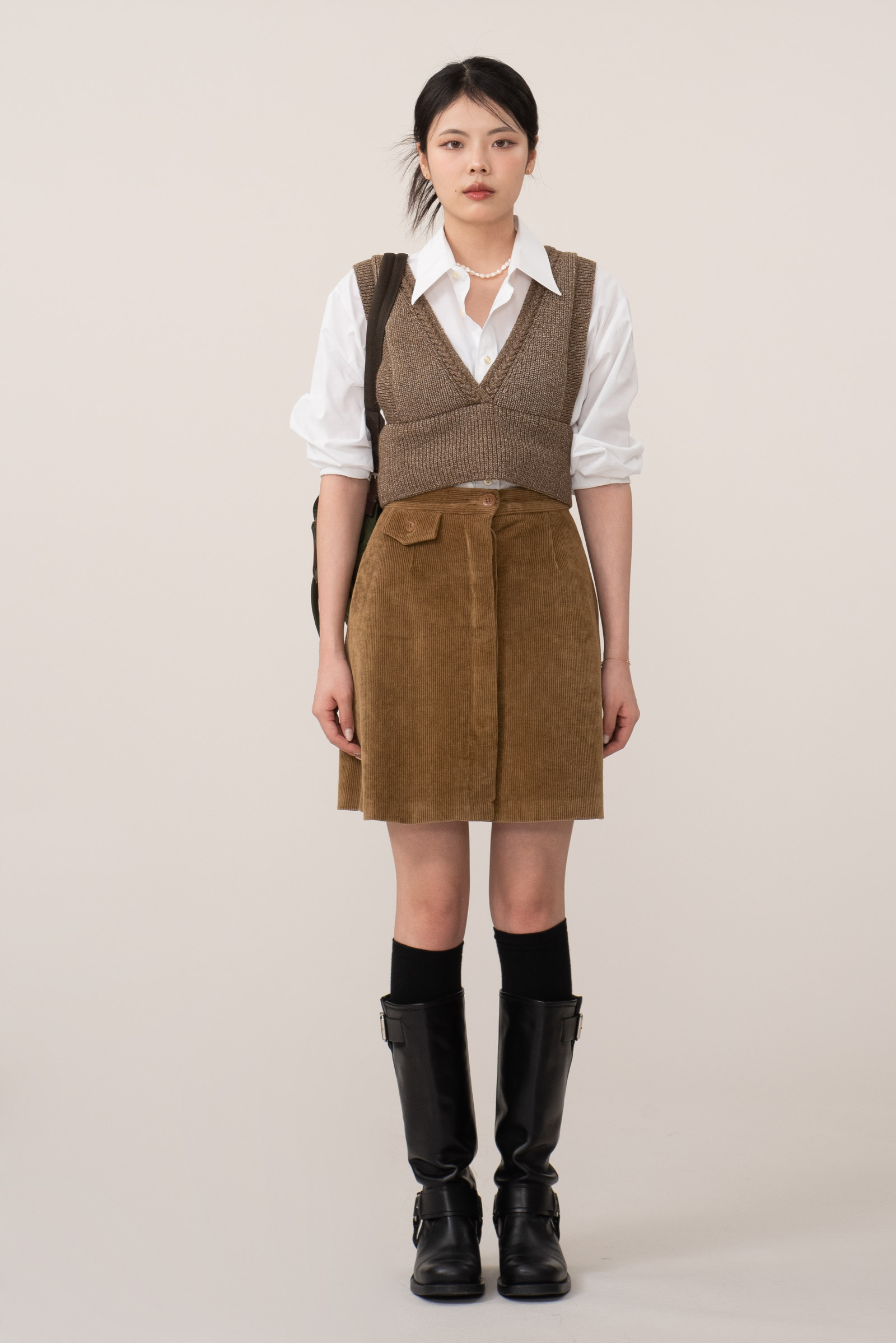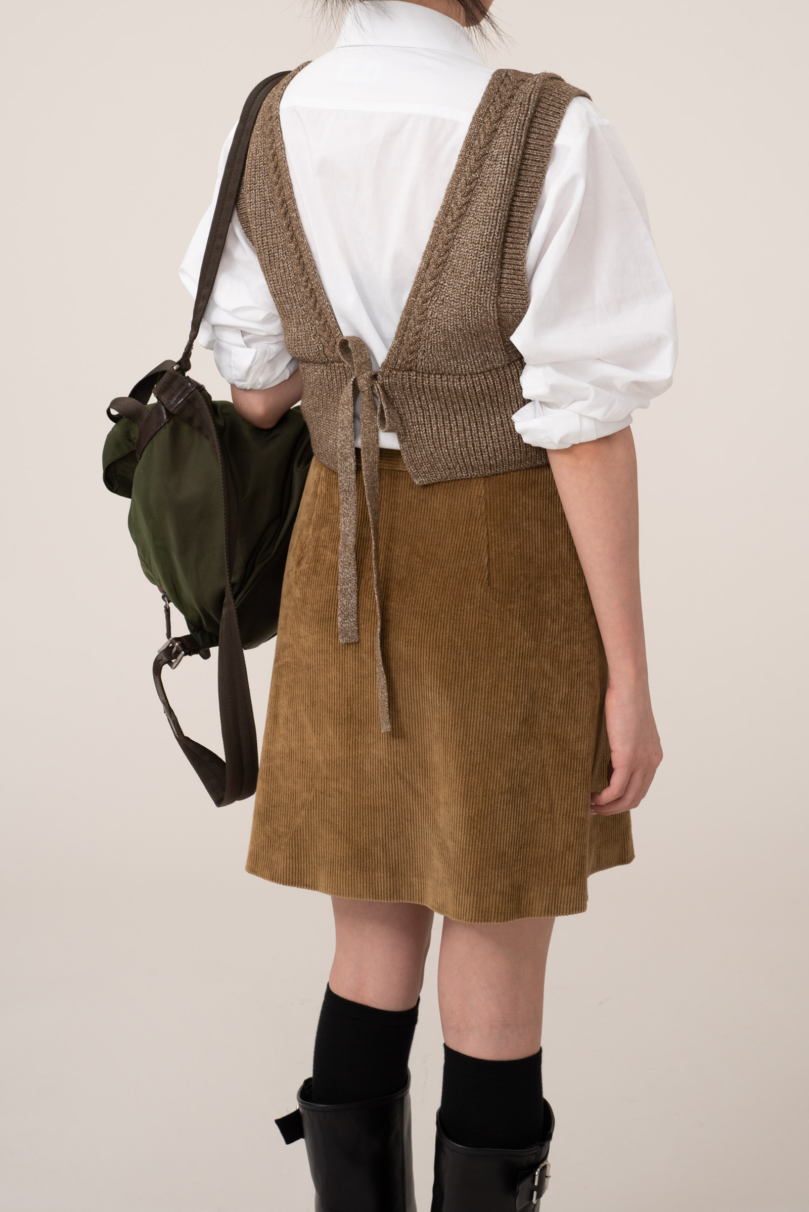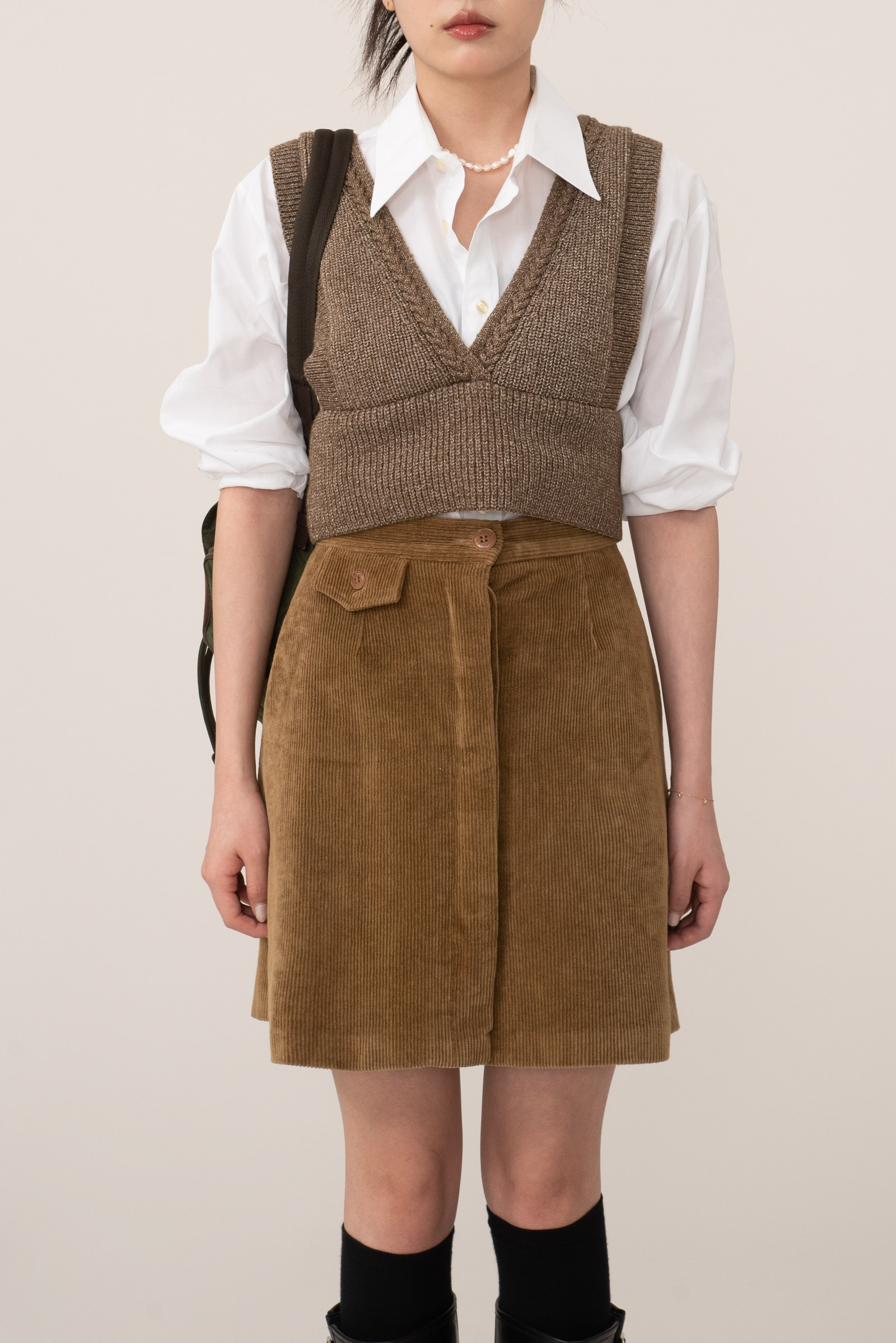 넓은 어깨선과 깊은 브이홀, 짧은 기장으로 셔츠나 가볍고 벙벙한 상의에 매치하시면 꾸안꾸로 포인트 주기 좋은 아이템이에요.