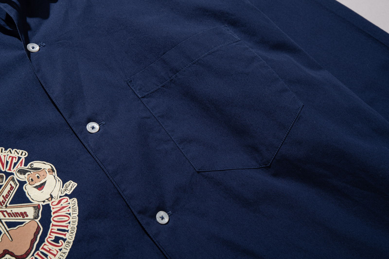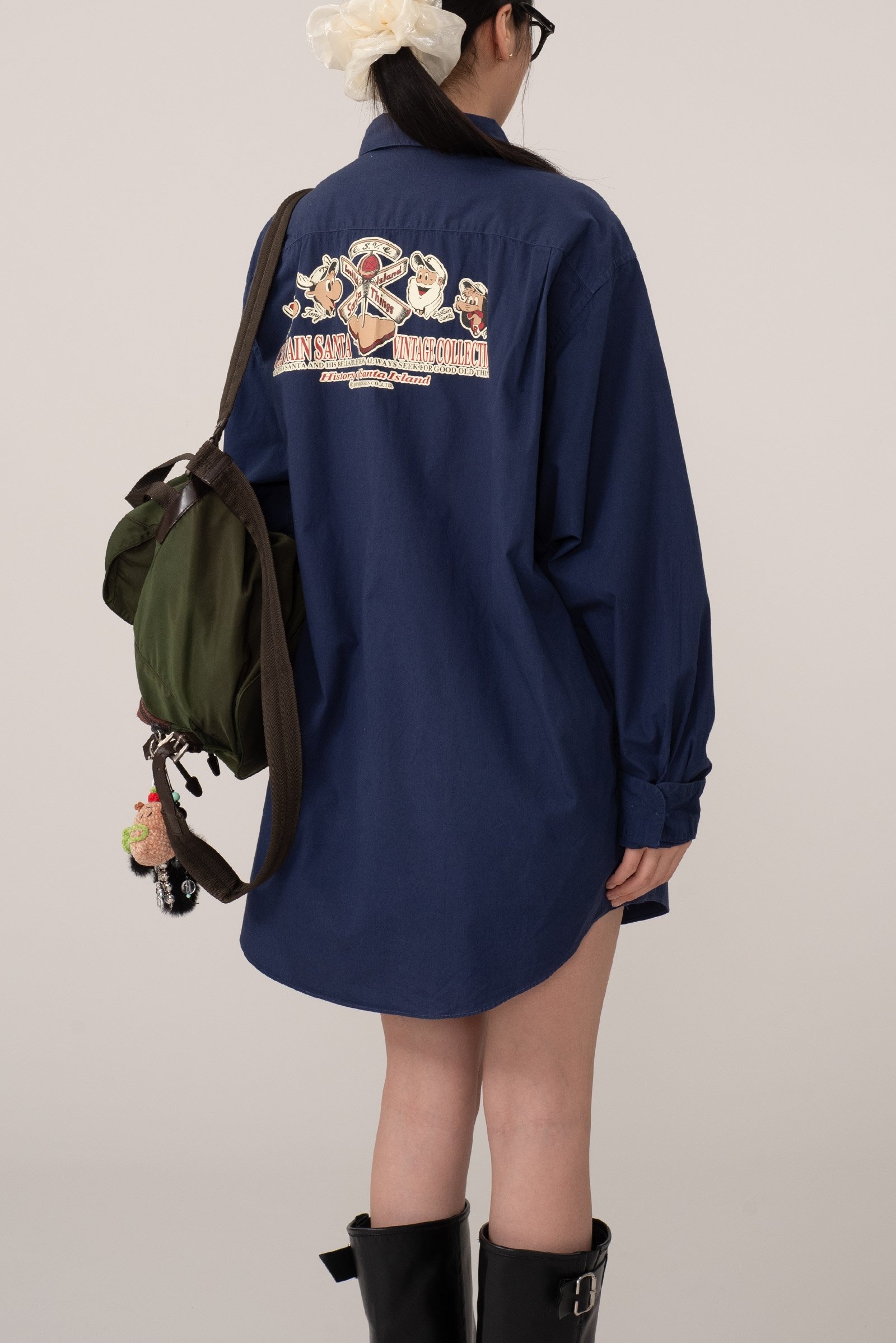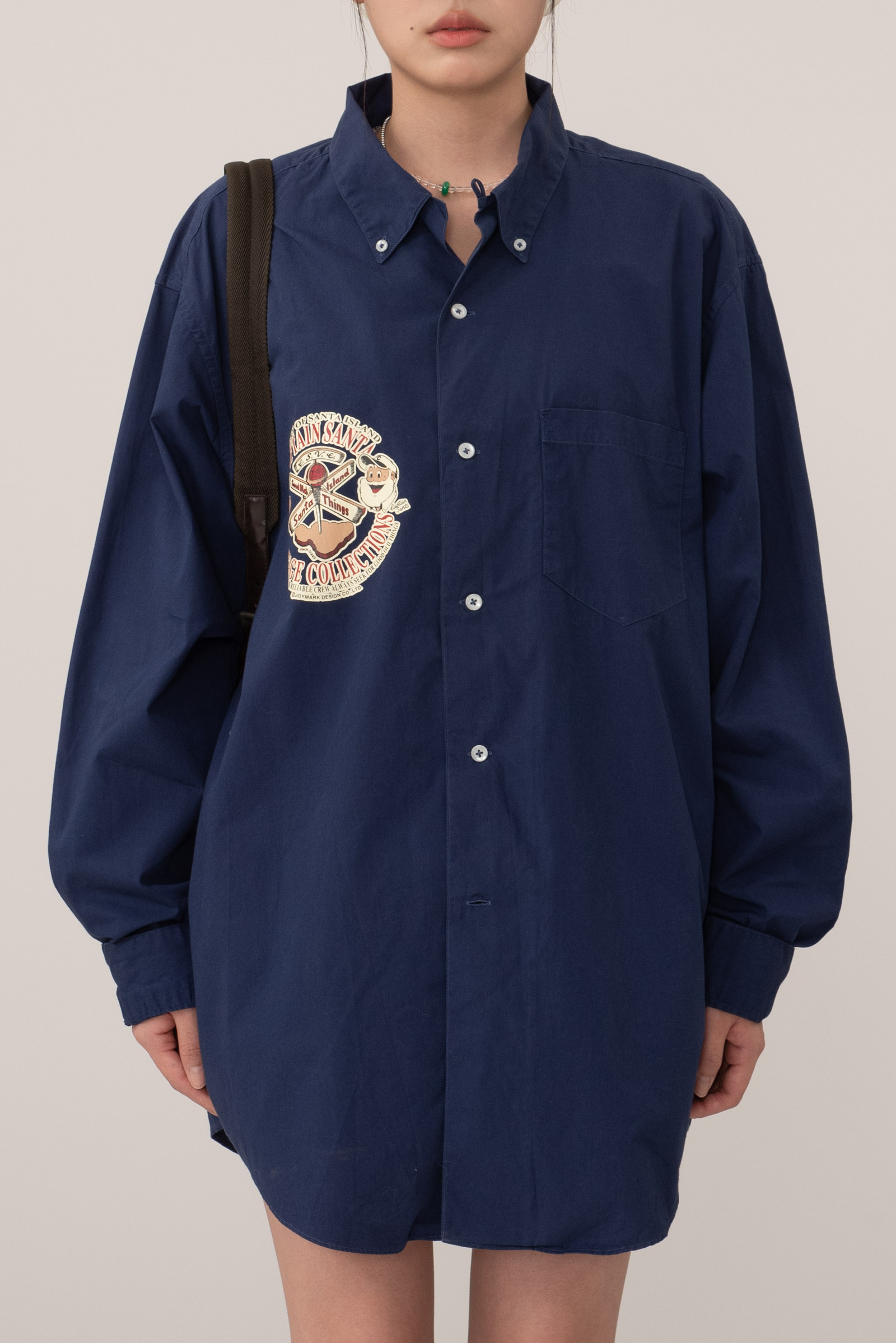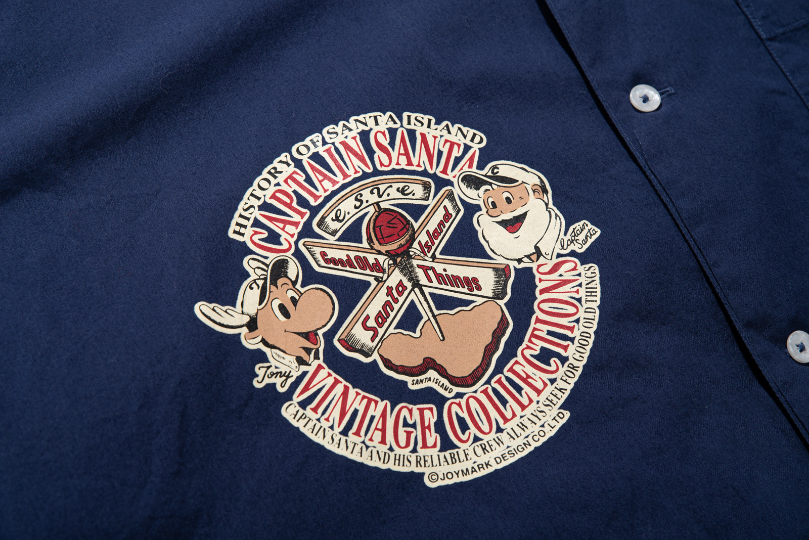 오늘 소개해 드리는 제품은 네이비 컬러에 마찬가지로 캡틴 산타 캐릭터가 앞, 뒤로 크게 프린팅 되어 위트 있게 착용되는 s/s 시즌 빈티지 컬렉션인데요.