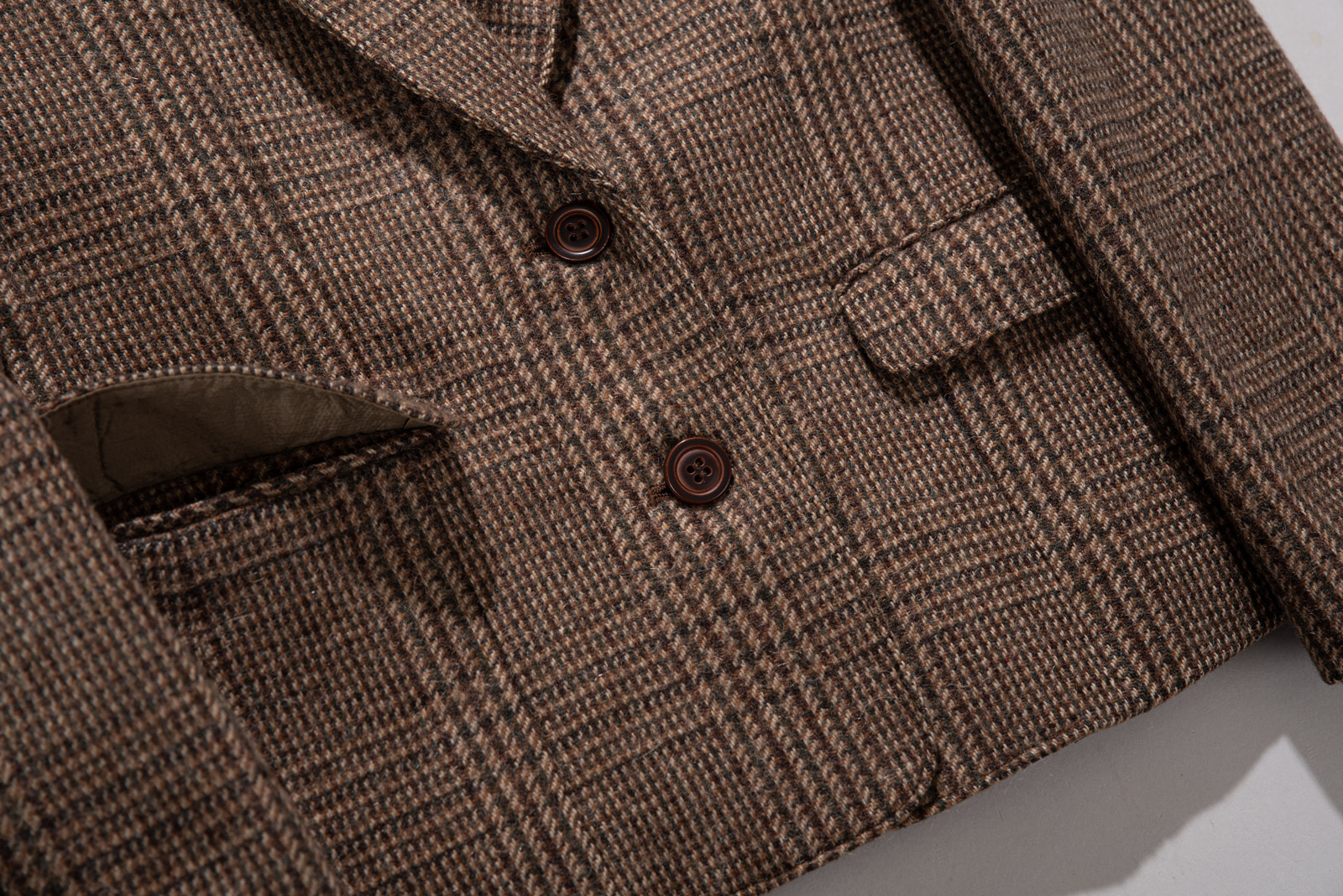 깊이 있는 V홀 디자인으로 클래식한 재킷보다 한층 세련된 무드를 주며 일본 빈티지 특유의 소매 기장이 약간 짧지만 전체적으로 밸런스가 아주 좋아요.