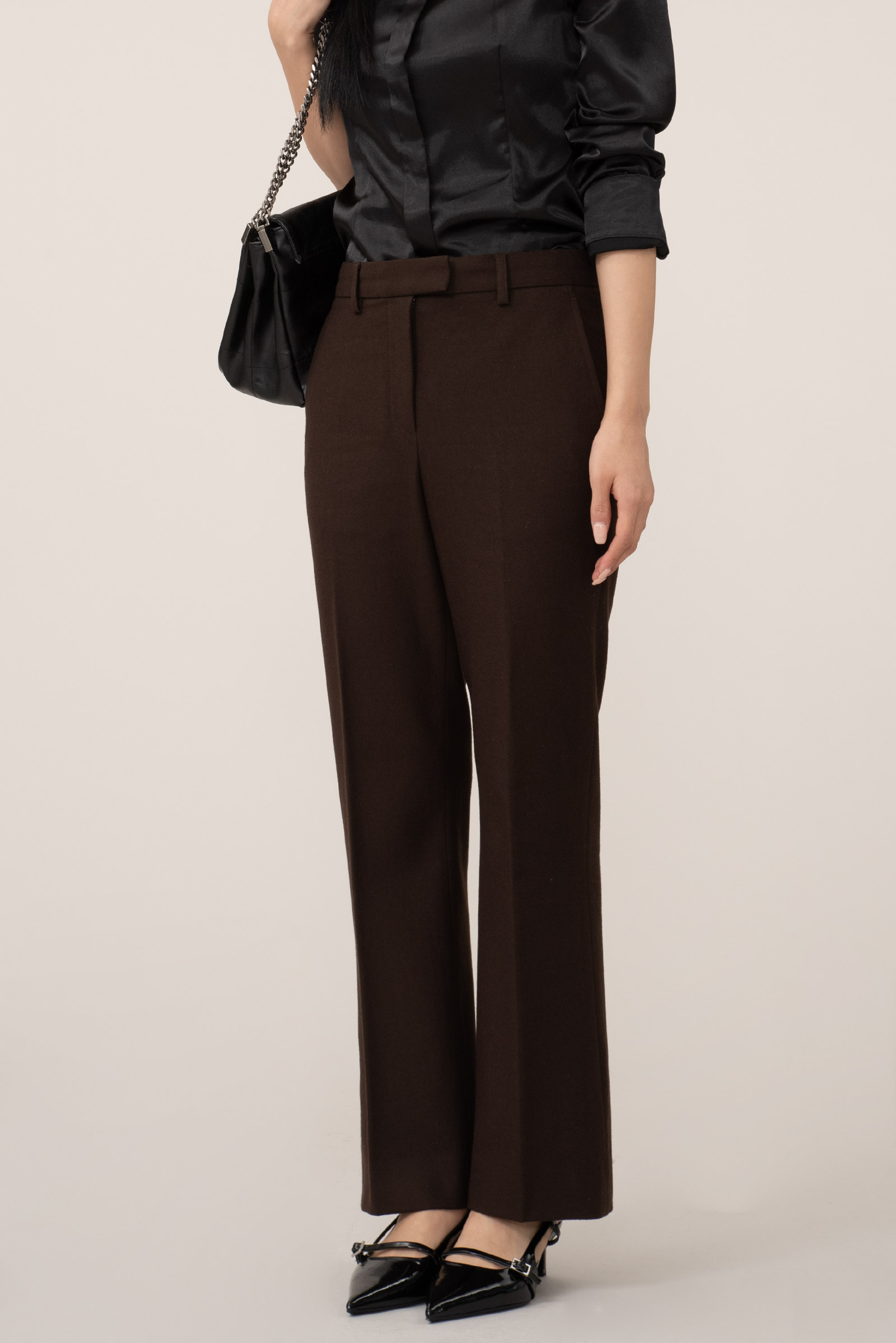 98% 높은 울 혼용률과 2% 폴리가 섞여 신축성도 약간 있어서 편안한 착용감을 제공하고 부츠컷 실루엣이라 유려한 레그라인 연출해 주는 아이템입니다.