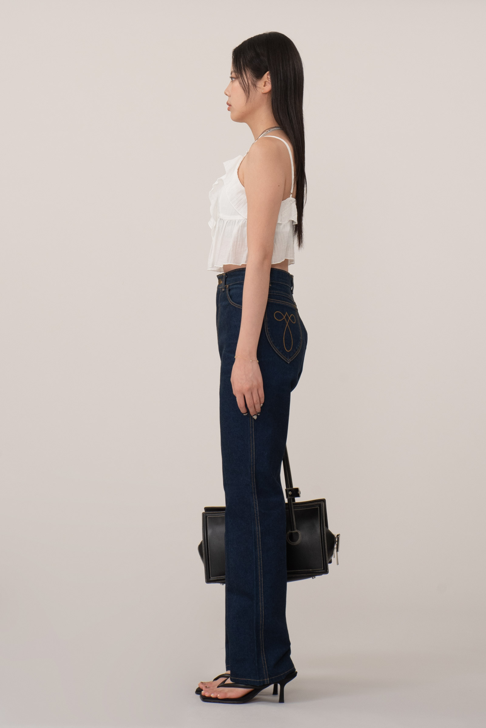 유려한 레그 라인 연출되는 벨 바텀, 백 포켓이 좀 더 위쪽에 붙어있어서 빵디가 업되어 보이는 효과가 있고 노랑 컬러 스티치가 굉장히 매력적이랍니다.