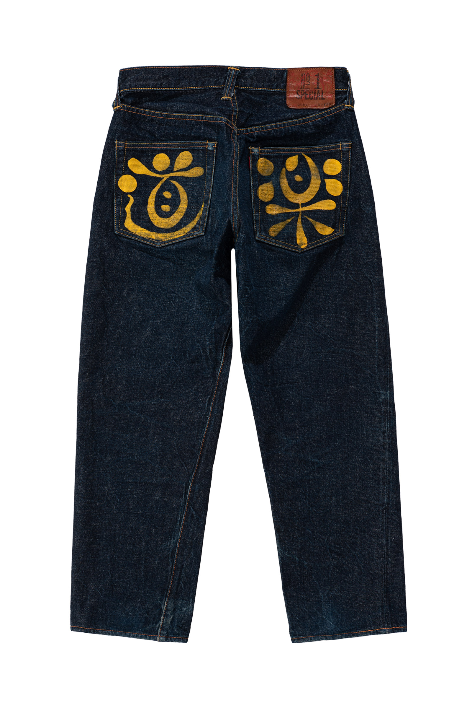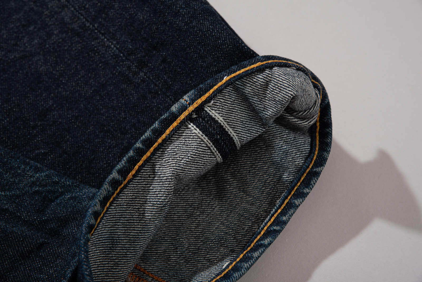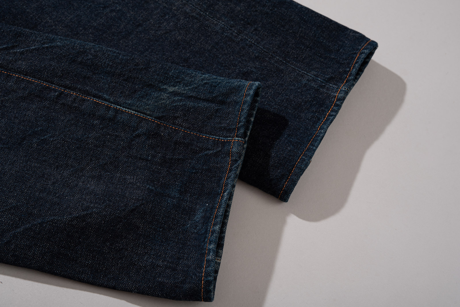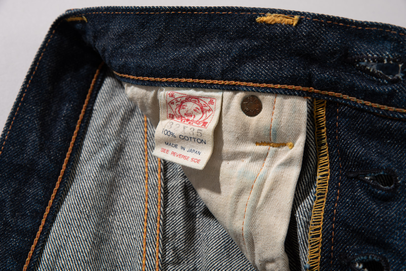 12mm의 얇은 셀비지 폭과 두 번은 없는 데드스톡 급 컨디션, 오리지널 모델답게 최상급 데님 원단 사용되어 러프하고 박력 있는 텍스처와 백 포켓의 커다란 도, 락 일명 취미라는 의미의 한자어 프린팅은 굉장히 희소한 개체입니다.