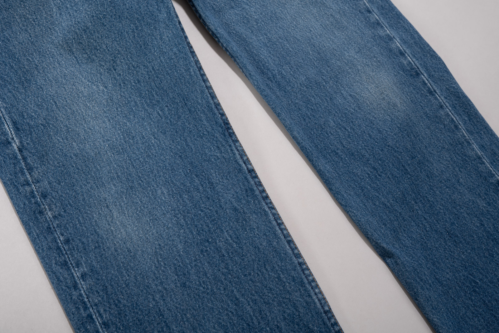 두툼하면서도 미제 특유의 부드러운 텍스쳐, 밑단이 살아있는 개체로 여유 있는 기장감을 즐기기 좋으며 후면의 종이 탭, 백 포켓의 흐릿한 아큐에잇 등 90년대 양식을 느끼며 클래식하게 착용하기에 이만한게 없어요.