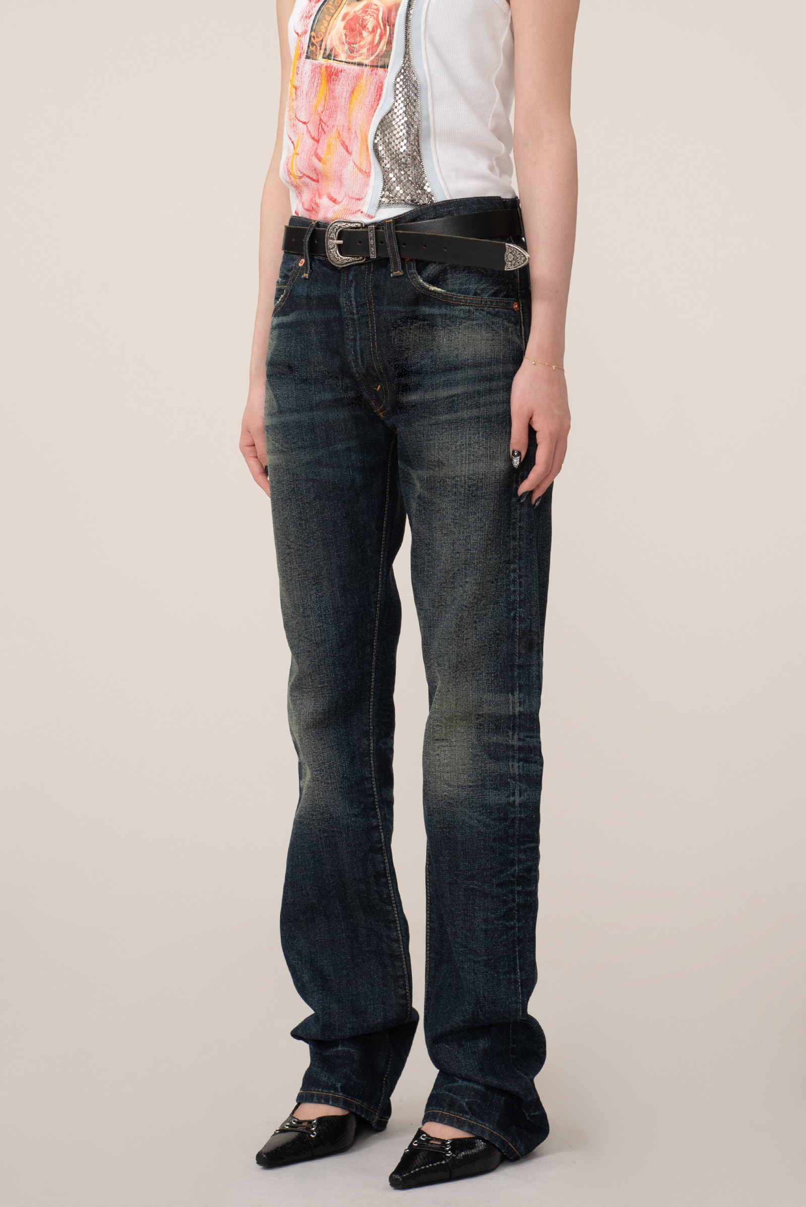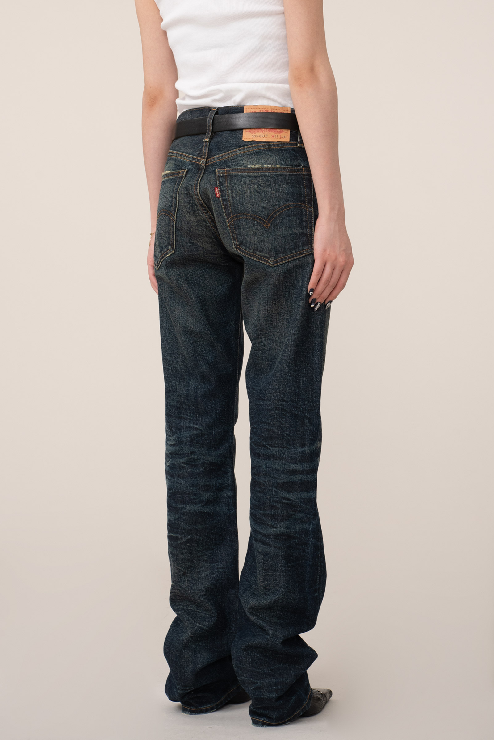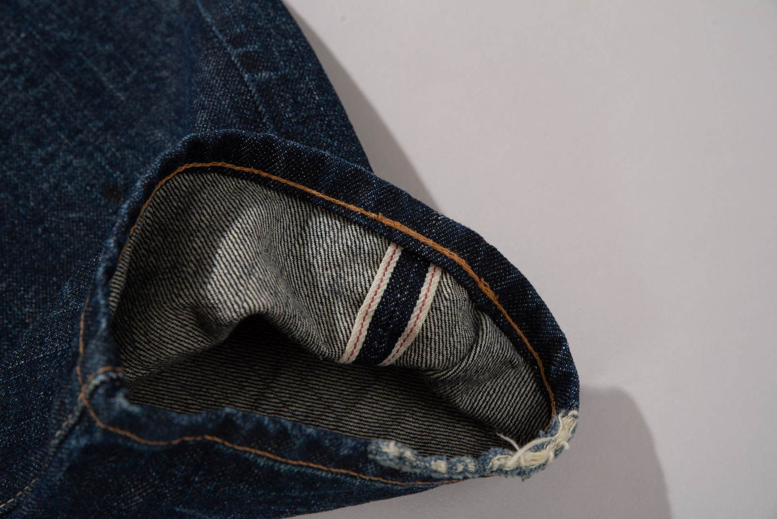 진한 베이스에 자연스러운 주름 워싱과 함께 페이딩이 인상적이며 밑단 체인 스티치, 레드 셀비지 실 사양 등 디테일에서 다양한 재미를 느끼실 수 있는 모델이랍니다.