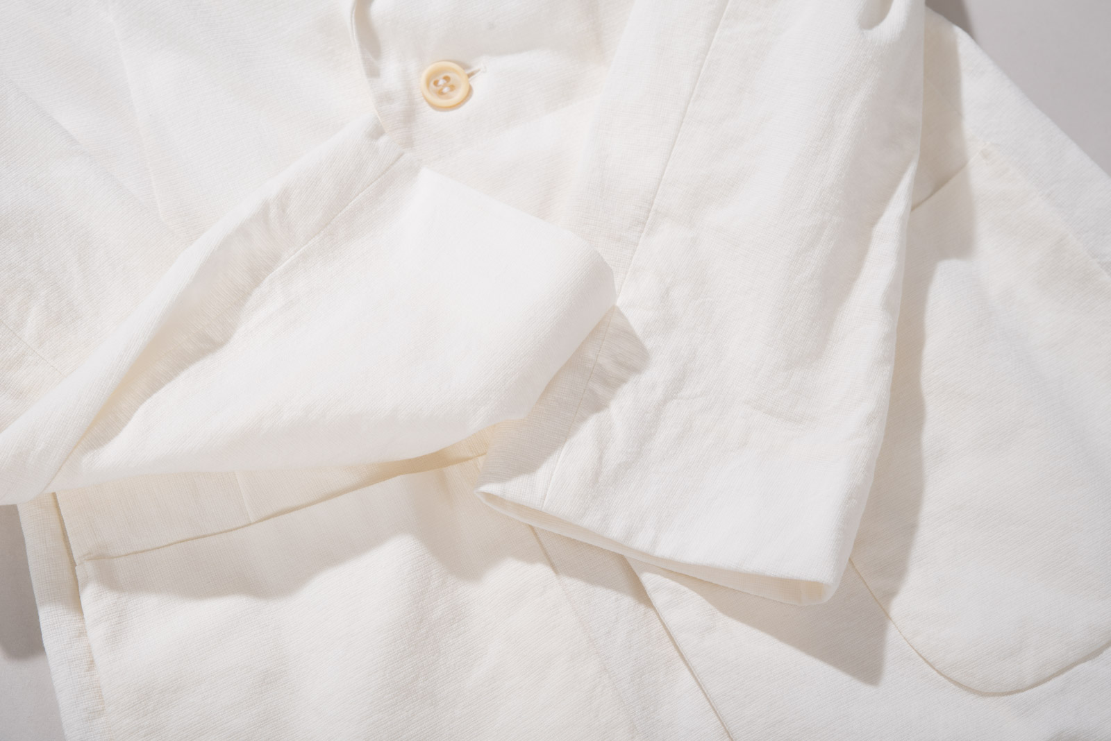 세련된 크림 컬러, 독일어로 코튼을 의미하는 바움볼레 소재로 일반 코튼 짜임과는 다르게 통기성, 흡습성을 가져 여름 재킷이나 아기 옷 제작에 많이 쓰이는데요.