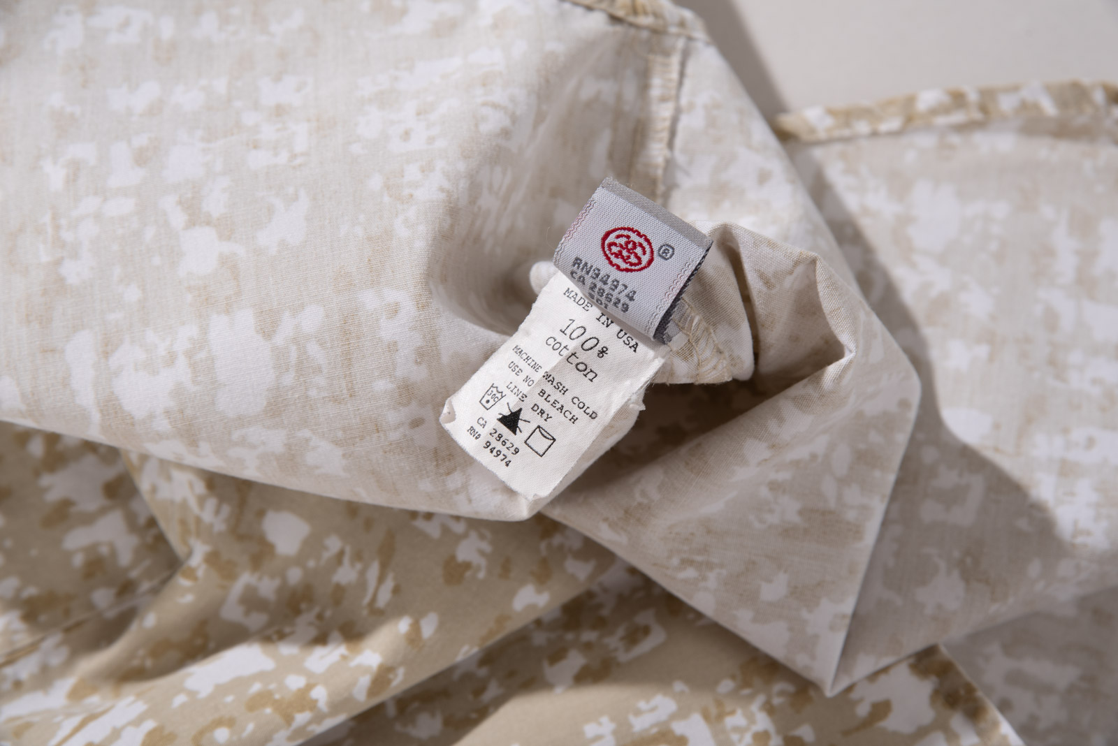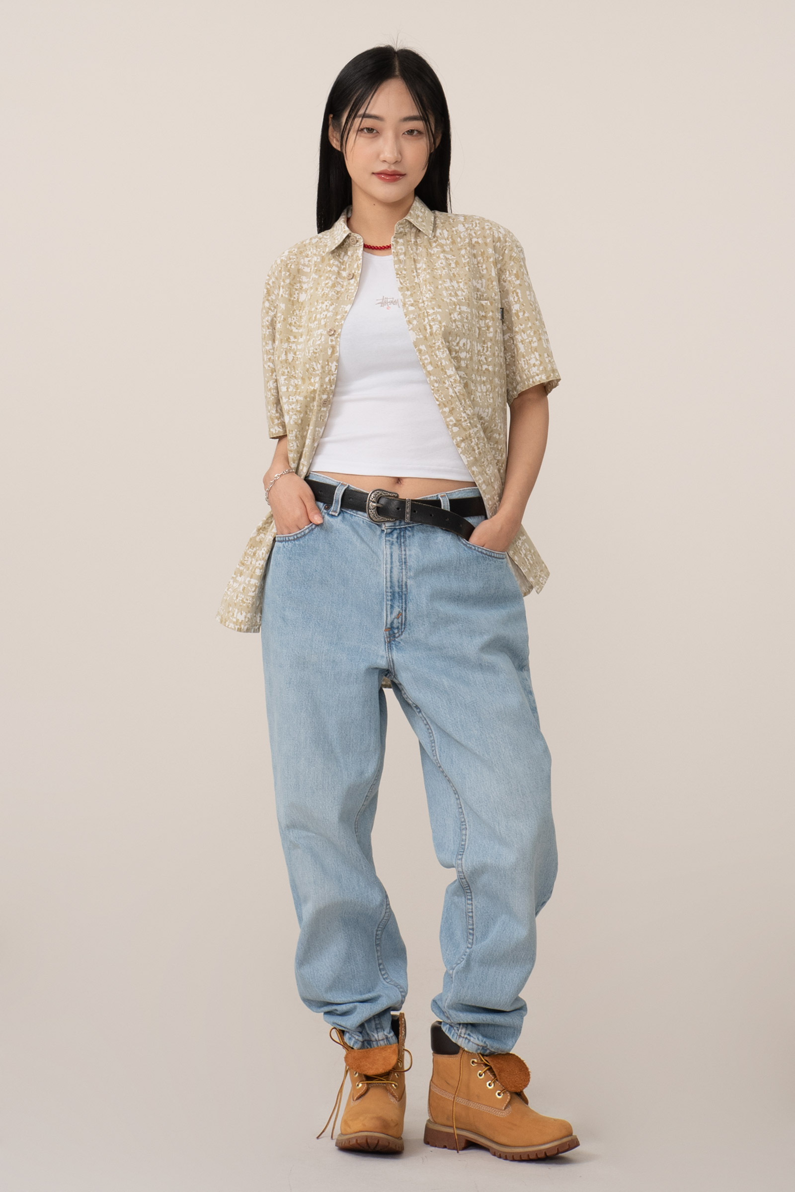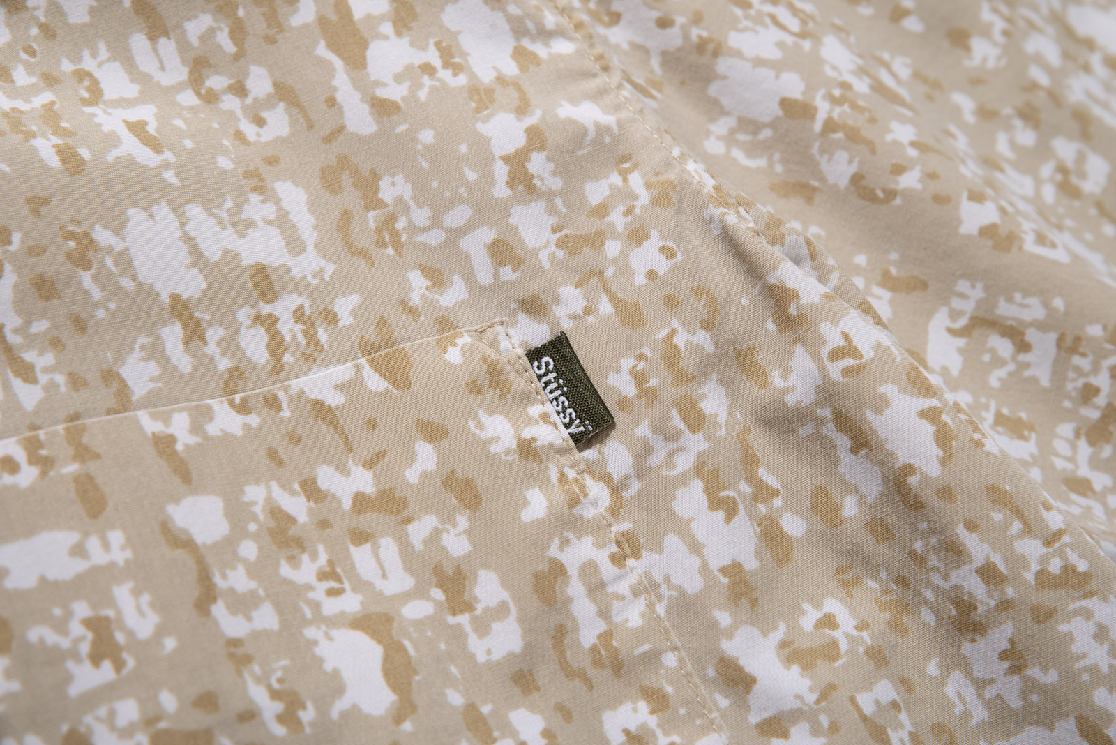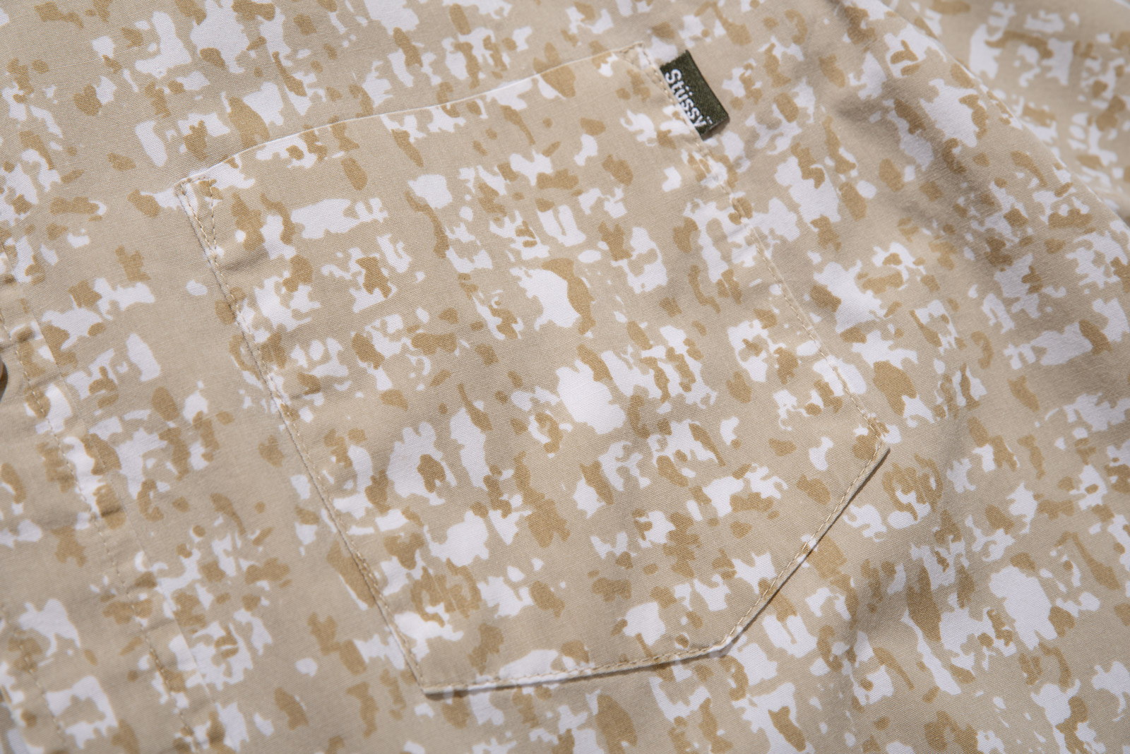 작은 카모 패턴에 부드러운 베이지 컬러, 투박하지만 기본에 충실한 피스로 포켓 옆 스투시 탭 외 큰 디테일은 없네요.