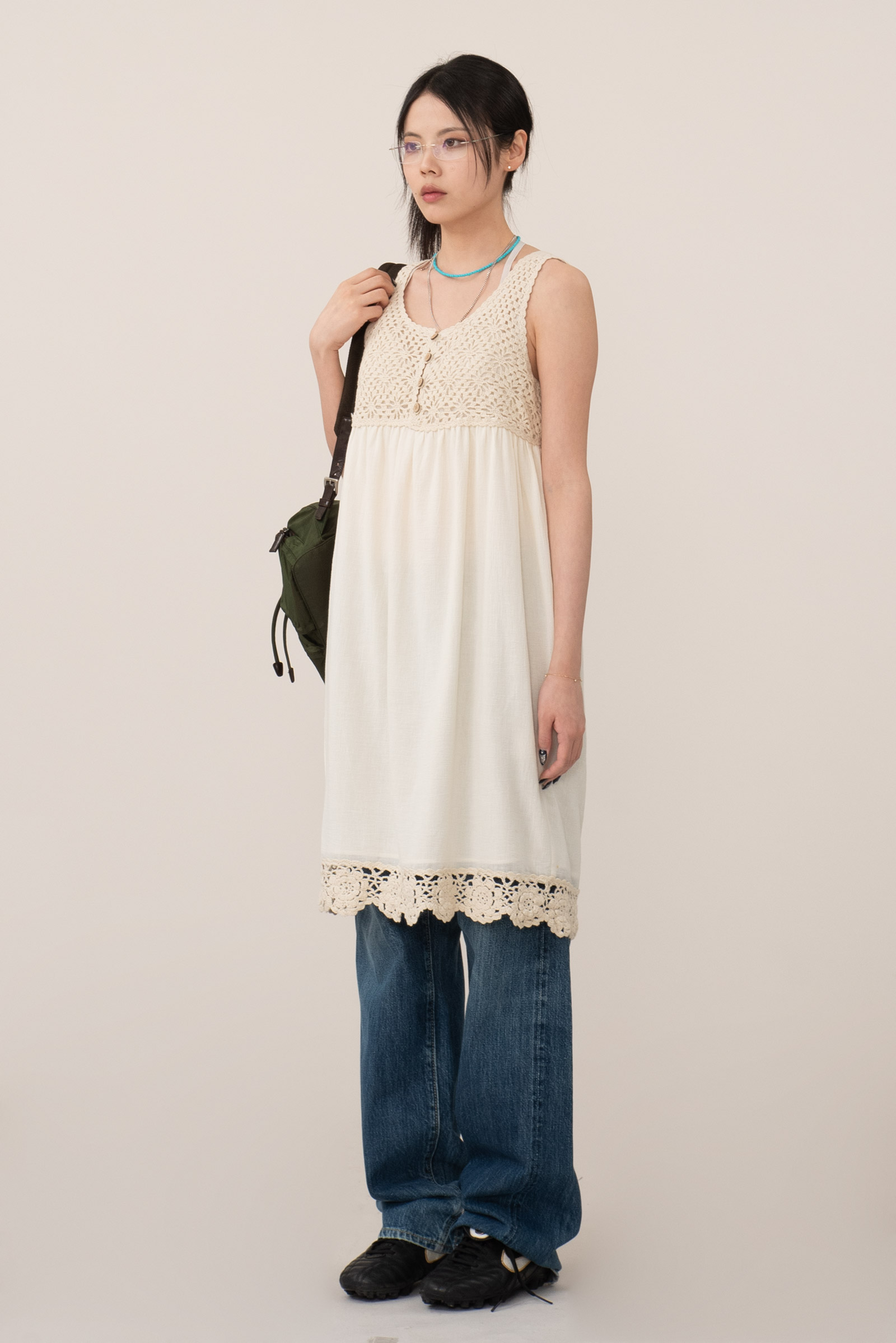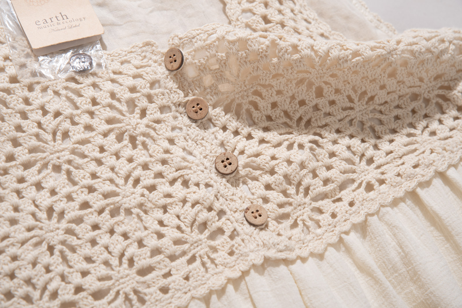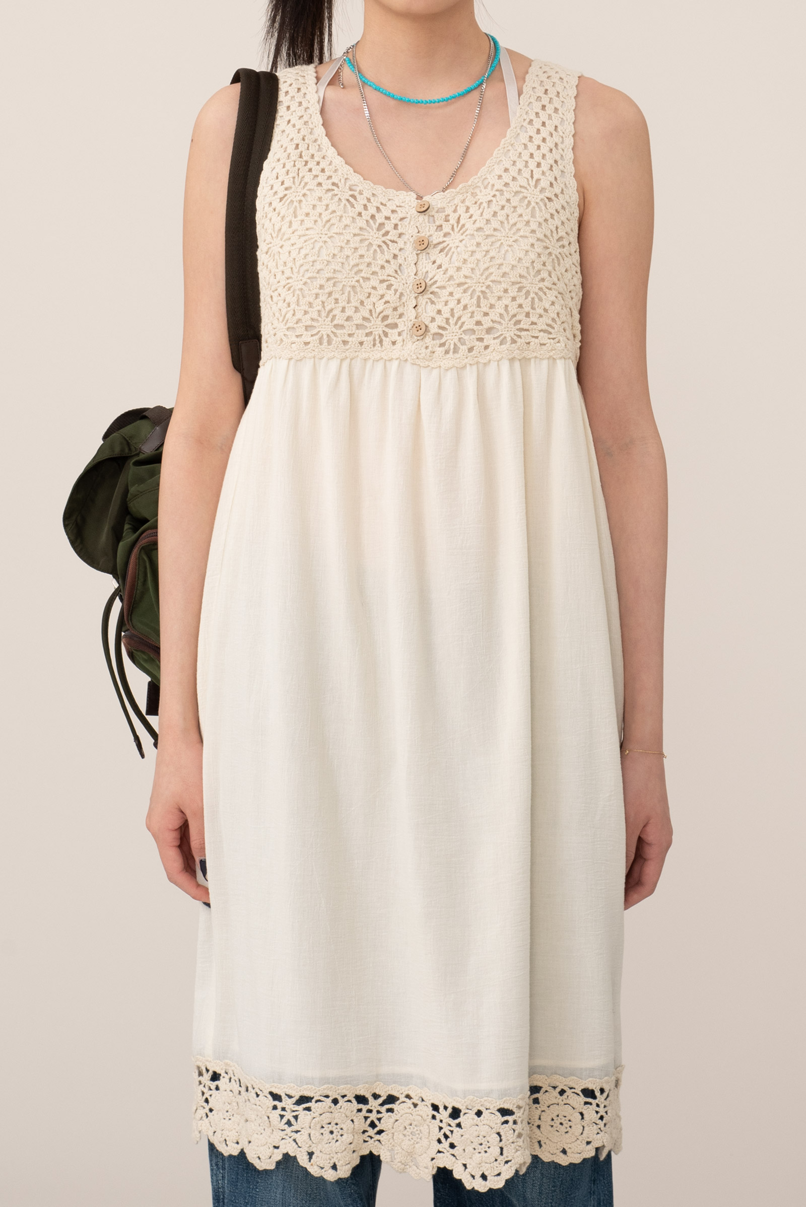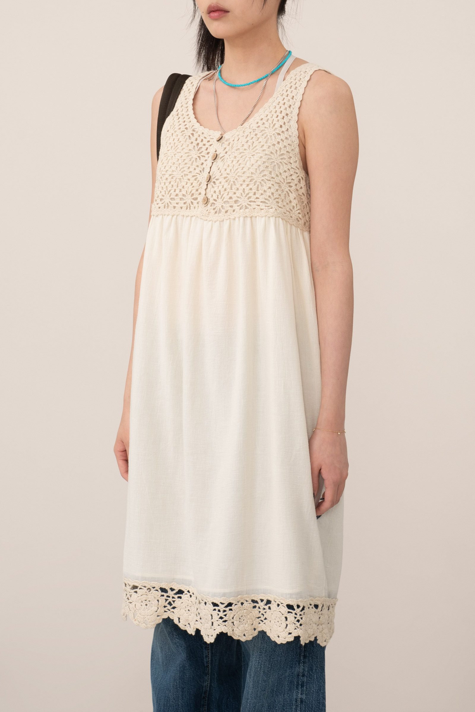 따뜻한 아이보리 컬러, 편안하게 착용되는 슬리브리스 디자인에 어스 뮤직앤 이콜로지의 섬세하고 키치한 감성, 러블리한 뜨개 디테일이 조화로운 피스에요.
