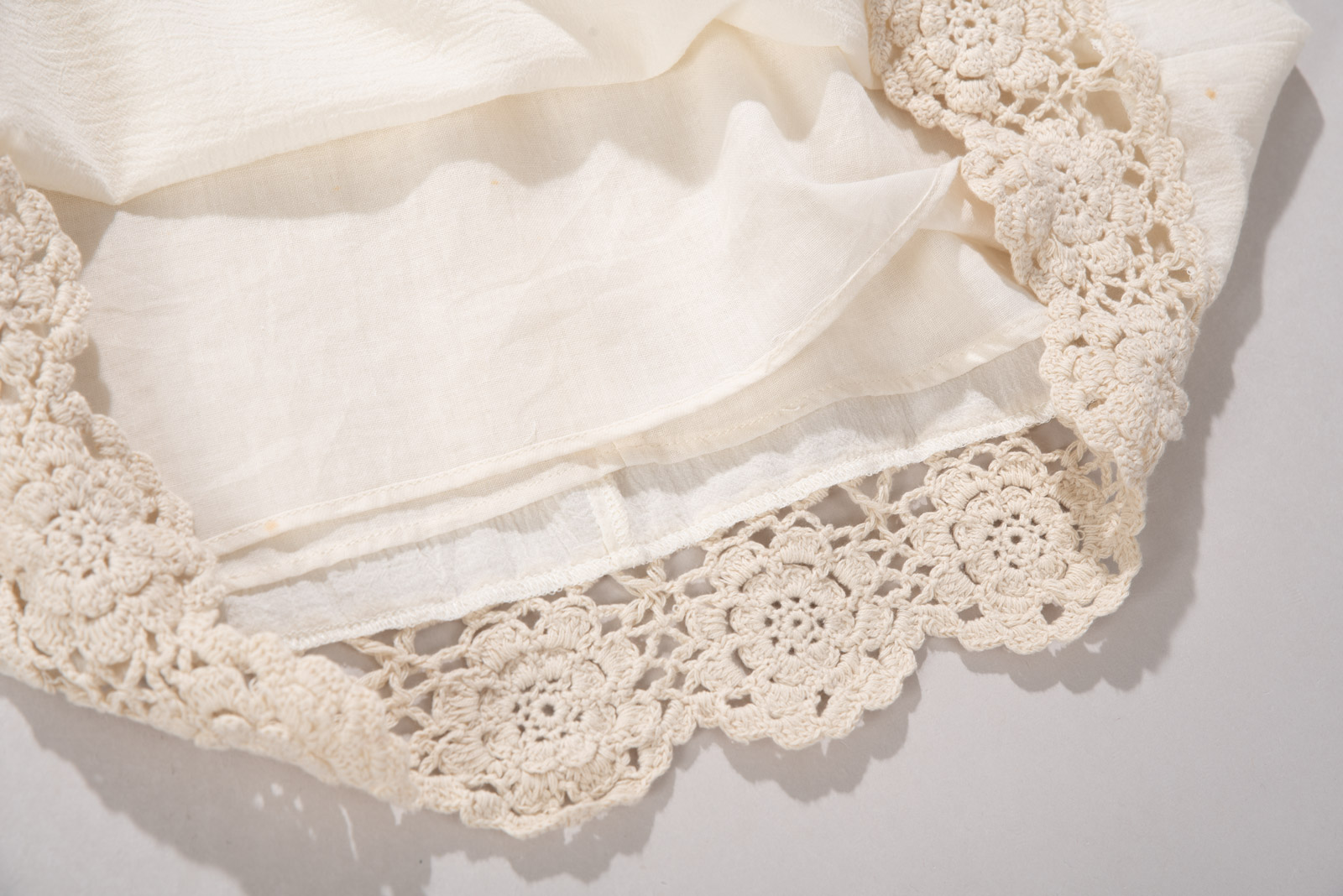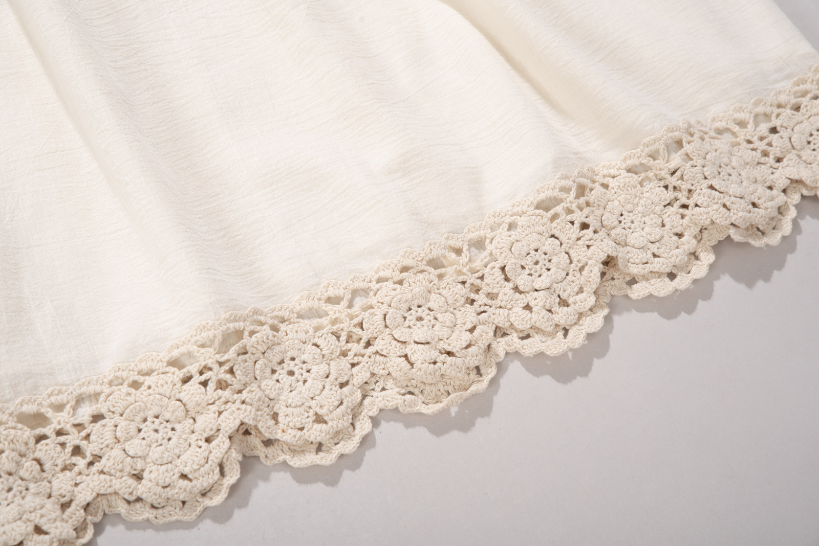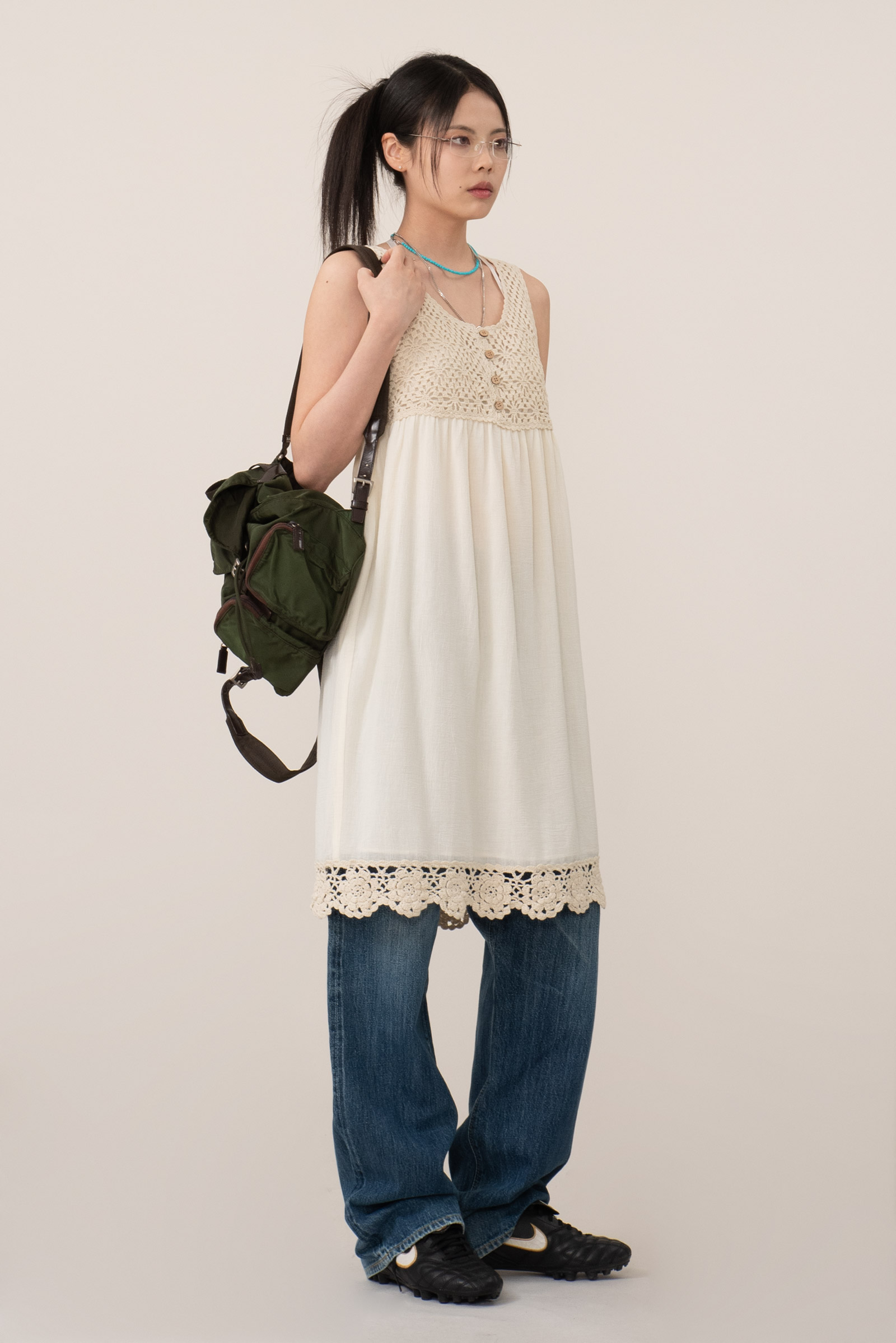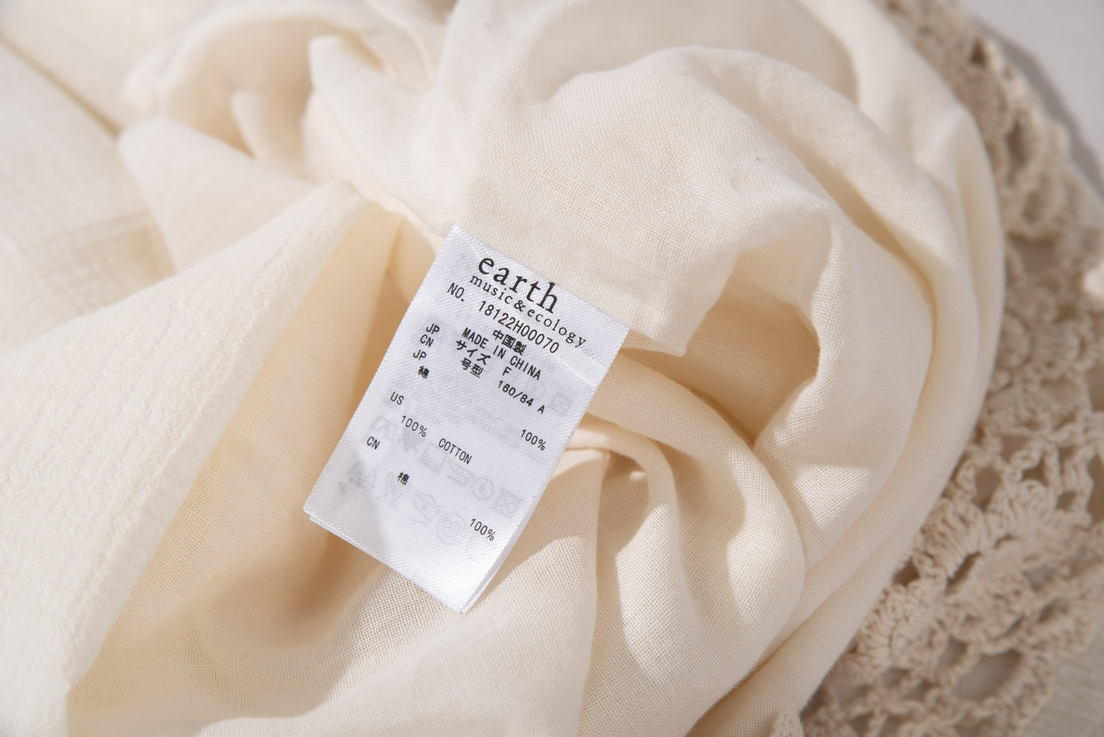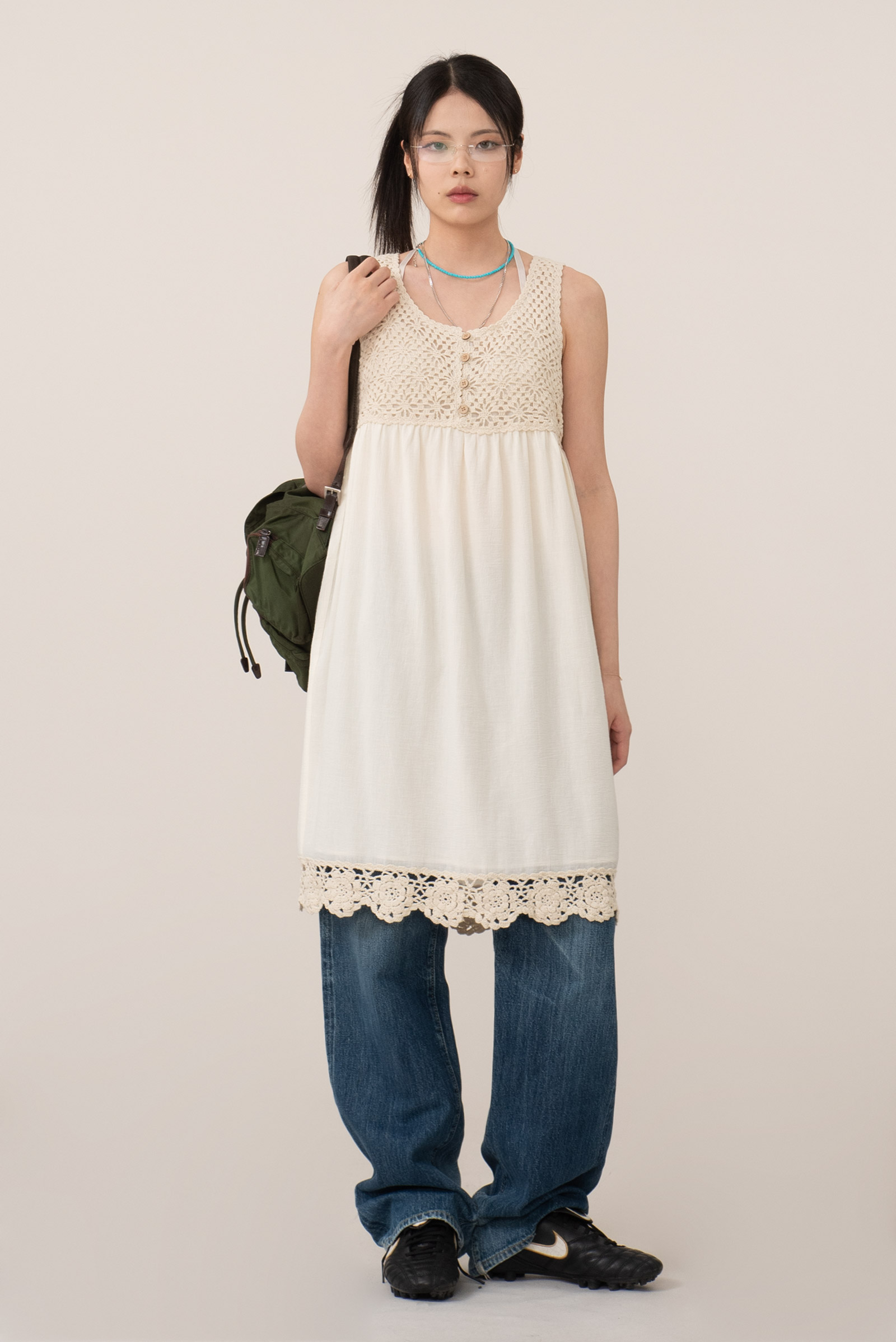따뜻한 아이보리 컬러, 편안하게 착용되는 슬리브리스 디자인에 어스 뮤직앤 이콜로지의 섬세하고 키치한 감성, 러블리한 뜨개 디테일이 조화로운 피스에요.
