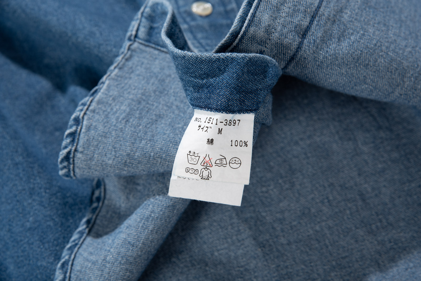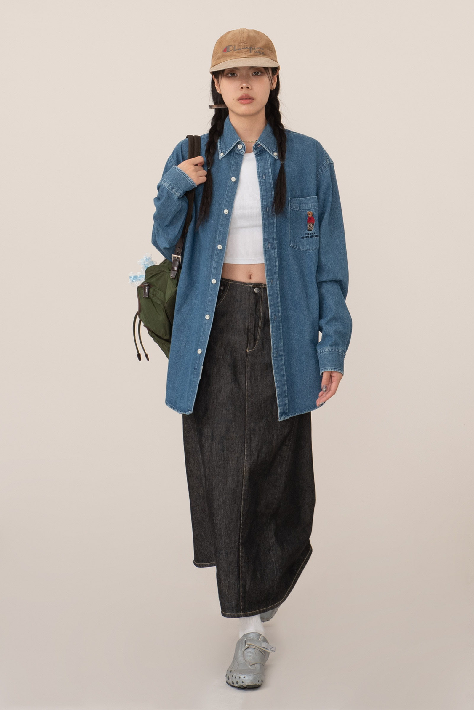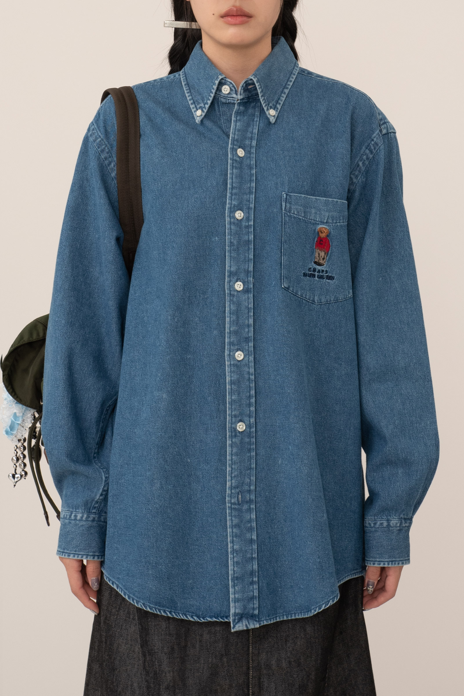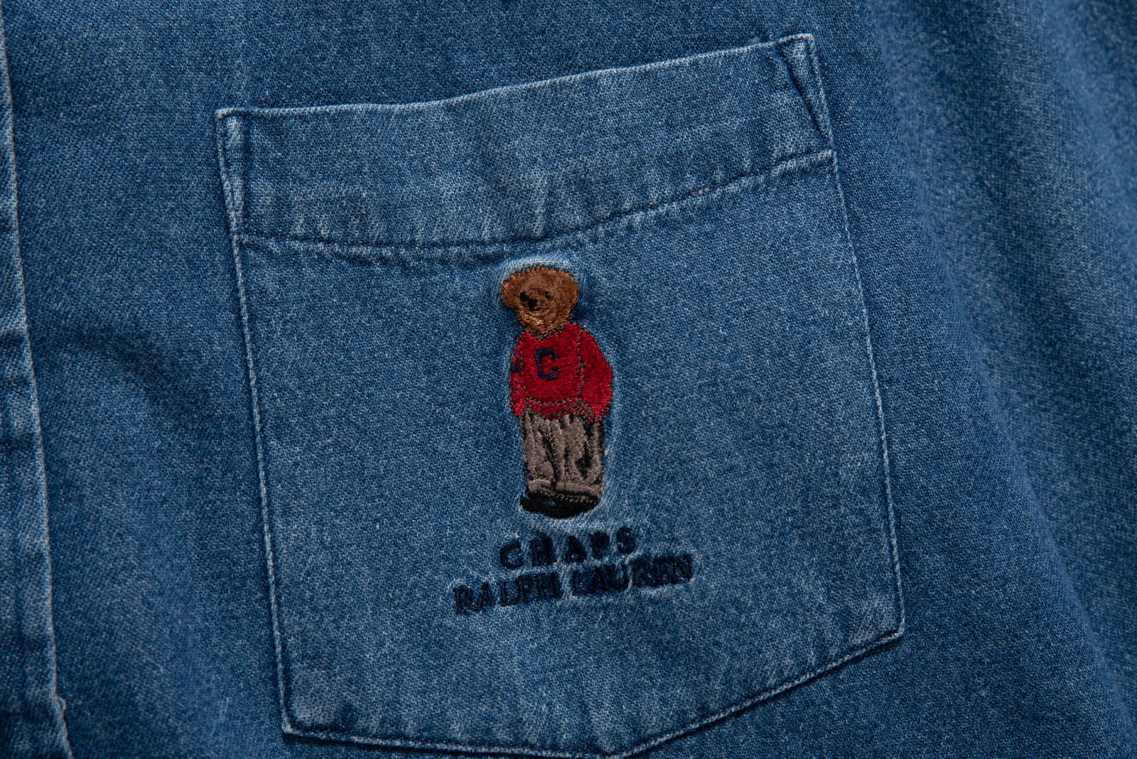 오늘 소개해 드리는 제품은 90년대 제작된 빈티지 데님 셔츠로 두툼한 데님 원단에 넉넉한 사이즈, 전면 포켓 위로 귀여운 곰돌이 자수가 돋보이는 피스인데요.