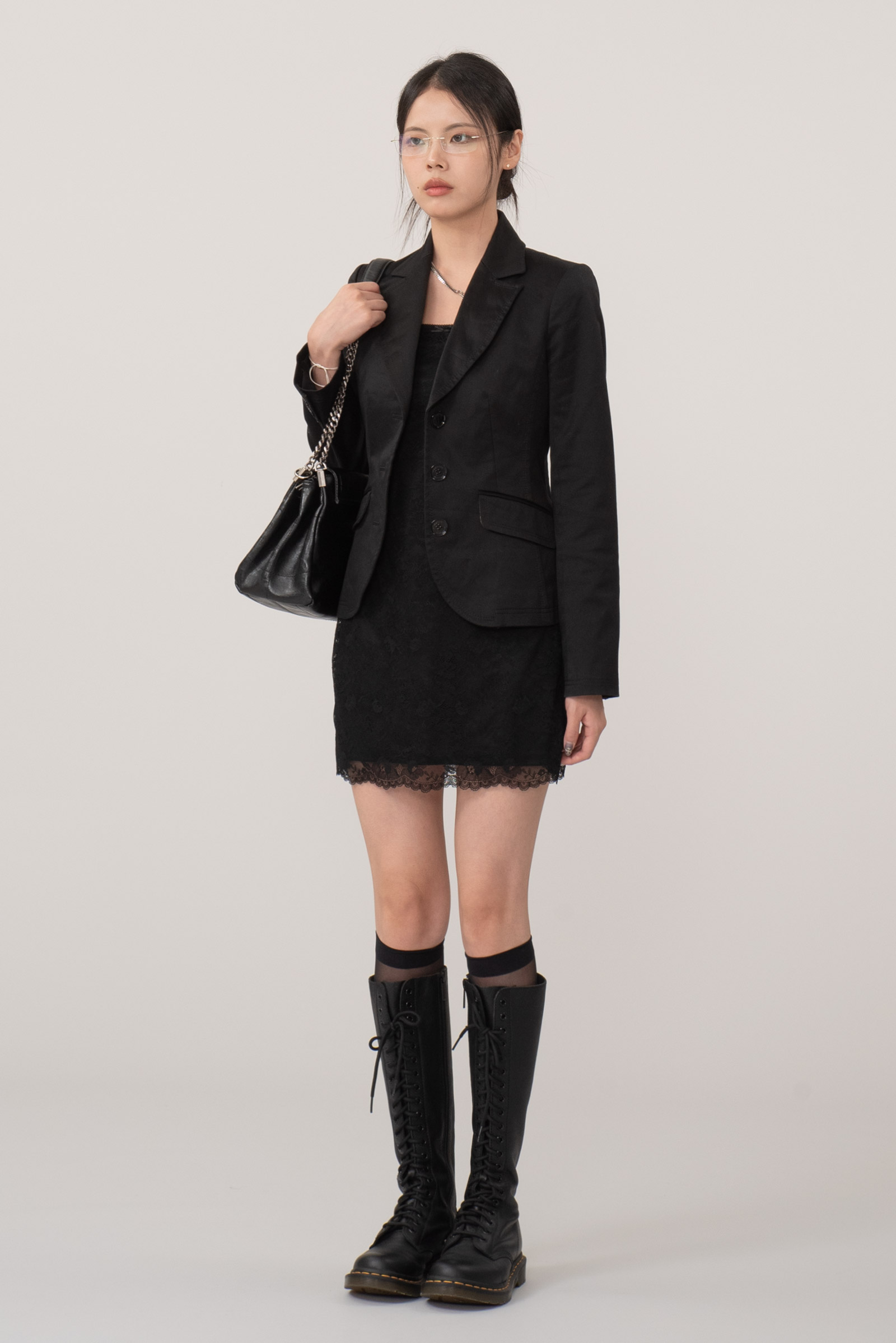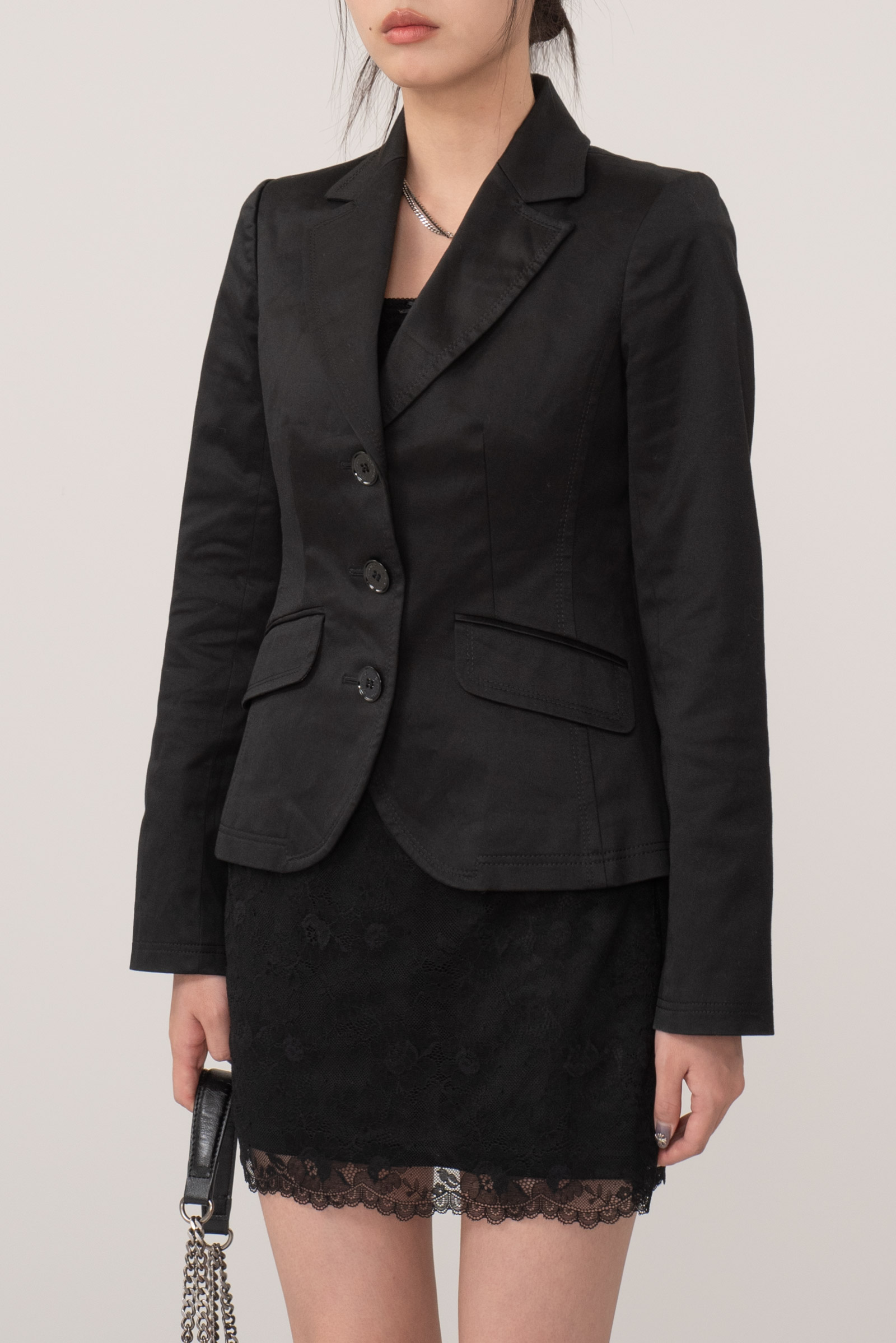 코튼 베이스에 폴리가 섞여 광택이 도는 텍스처가 특징이며 유행 없이 착용되는 블랙 컬러라 매치하는 아이템에 따라 다양한 룩 연출 가능한 피스랍니다.