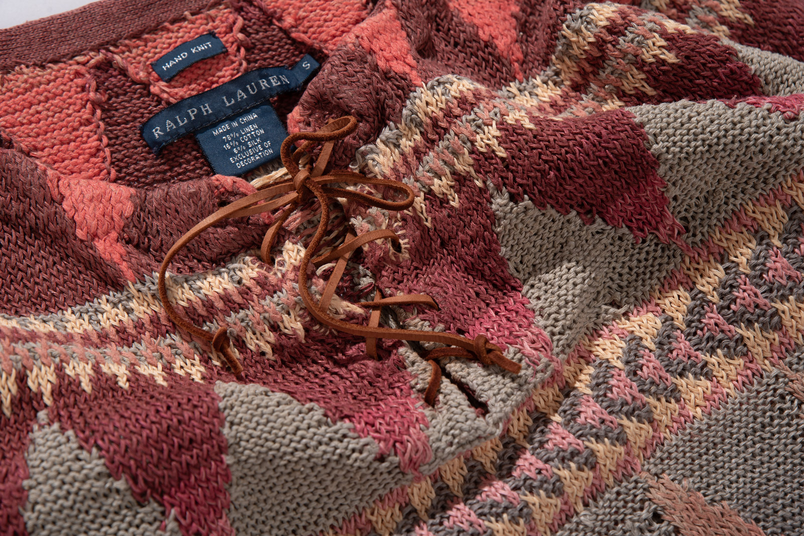 린넨 78%, 코튼 16%, 실크 6% 함유량으로 약간 빳빳한듯 느슨한 텍스쳐와 짜임, 랄프로렌이 사랑하는 미국 남서부의 인디언 문화가 녹아 있는 사우스 웨스턴 패턴이 눈에 띄네요.