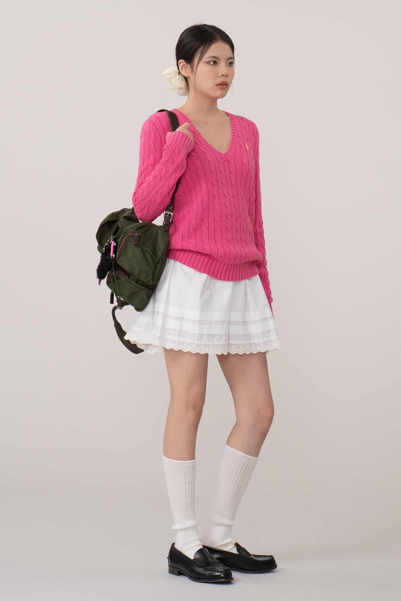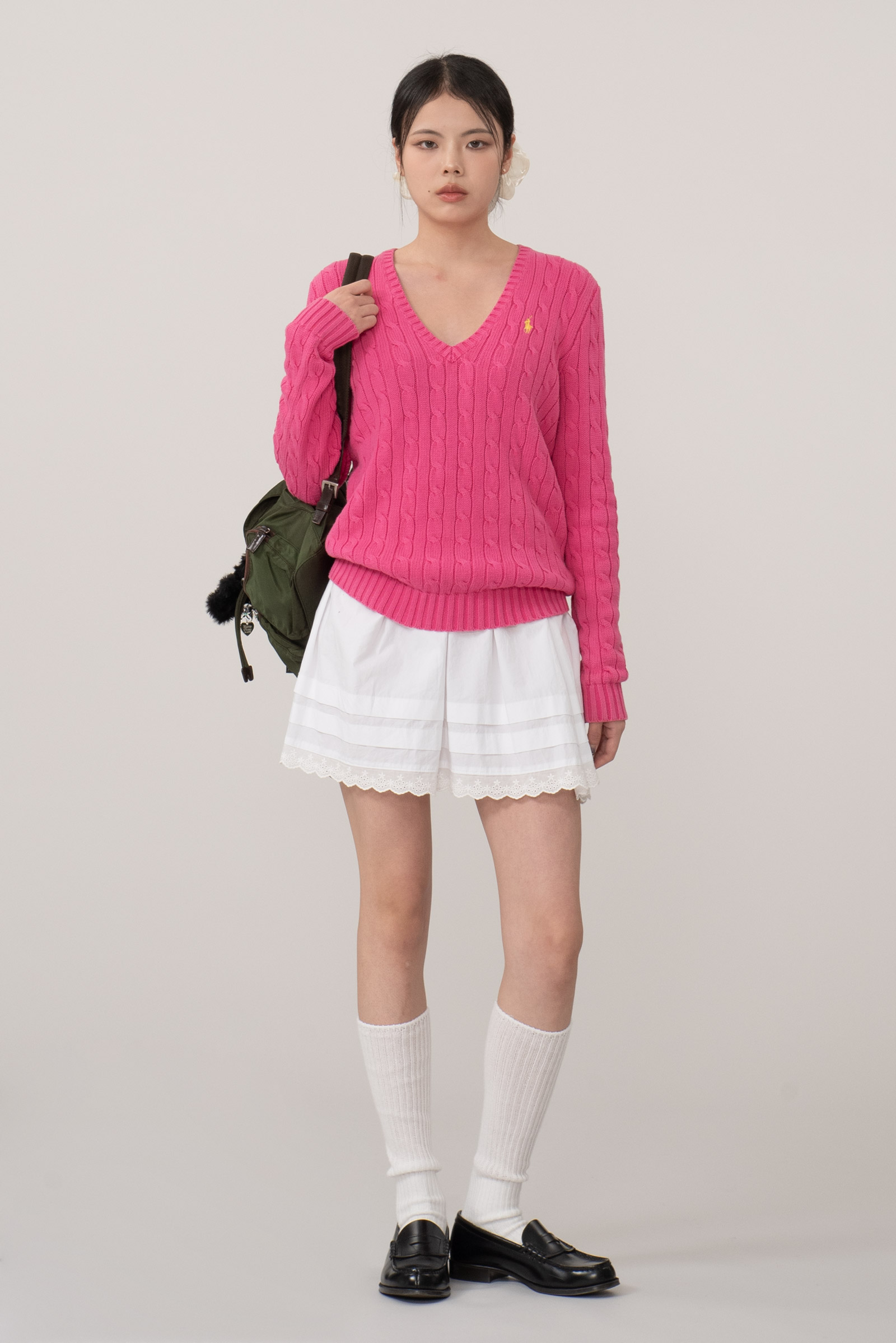 큰 디테일 없이 케이블 짜임만으로 캐주얼한 데일리룩부터 포멀한 오피스룩까지 활용도가 높고 청바지나 스커트, 숏츠 등 쓰임이 굉장히 다양해요.