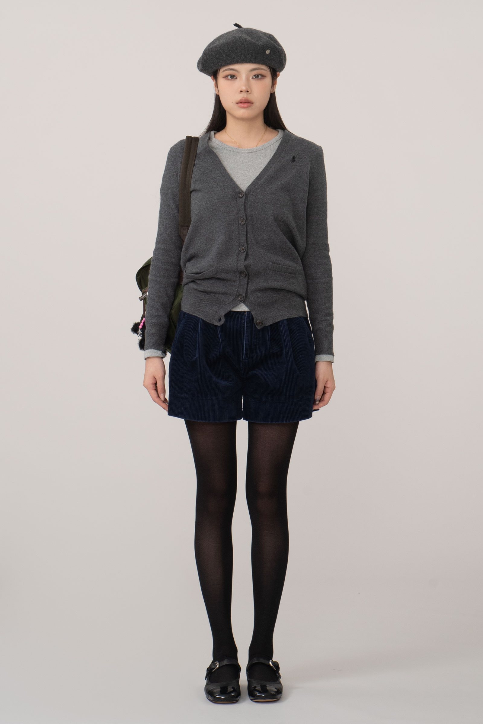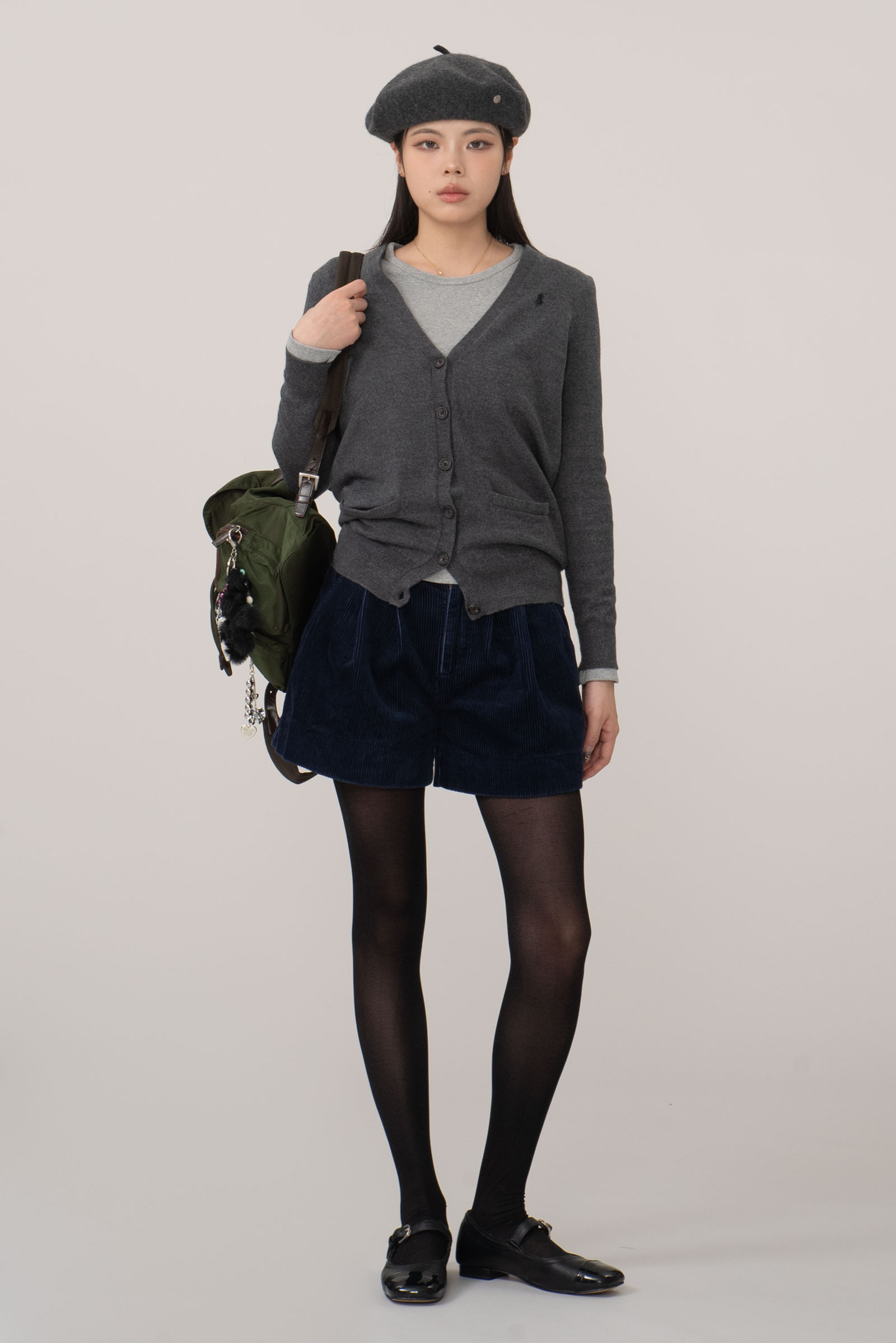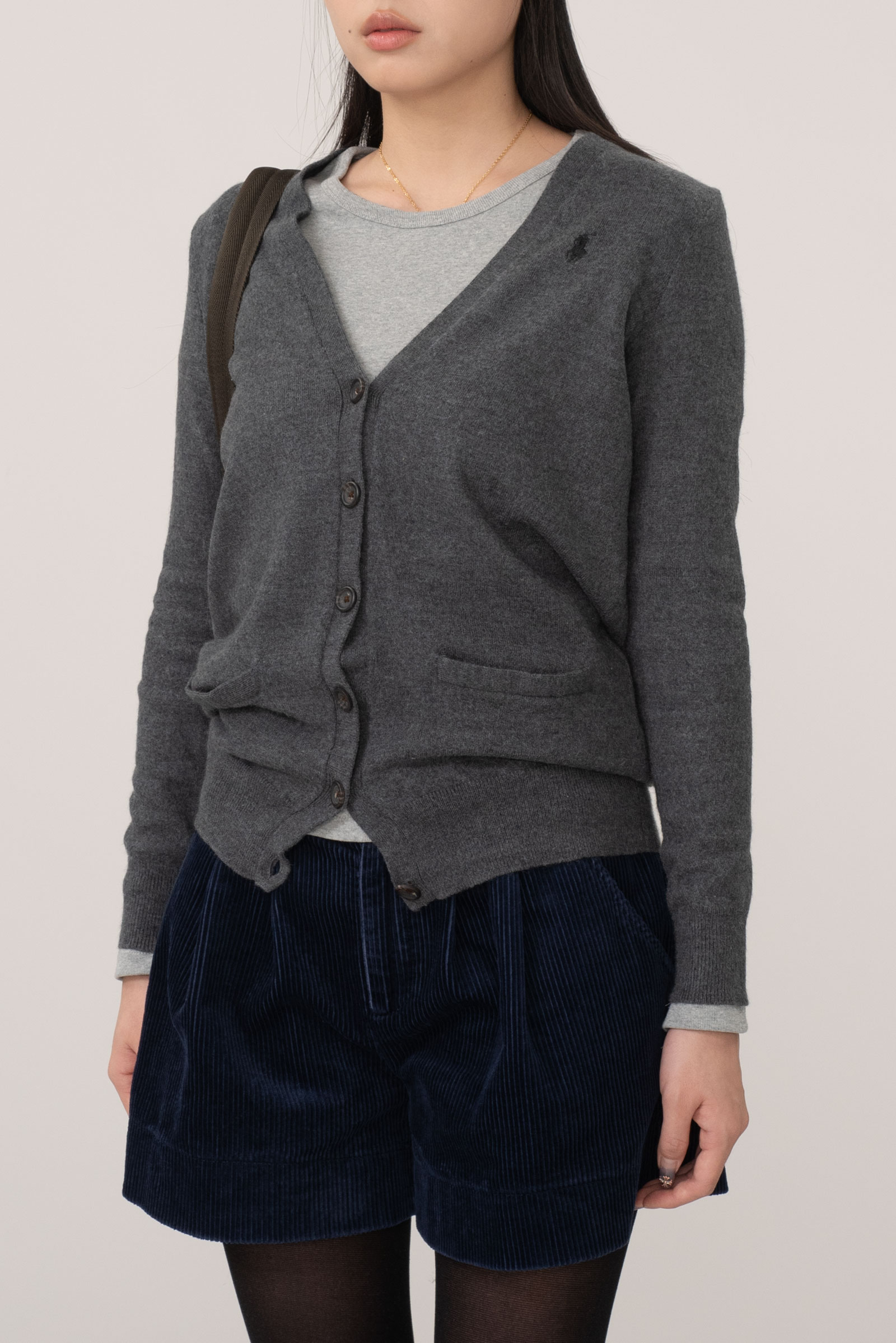 캐주얼하게 입어지는 브이넥에 그레이 컬러, 무난한 블랙 포니로 심플한 피스인데요.