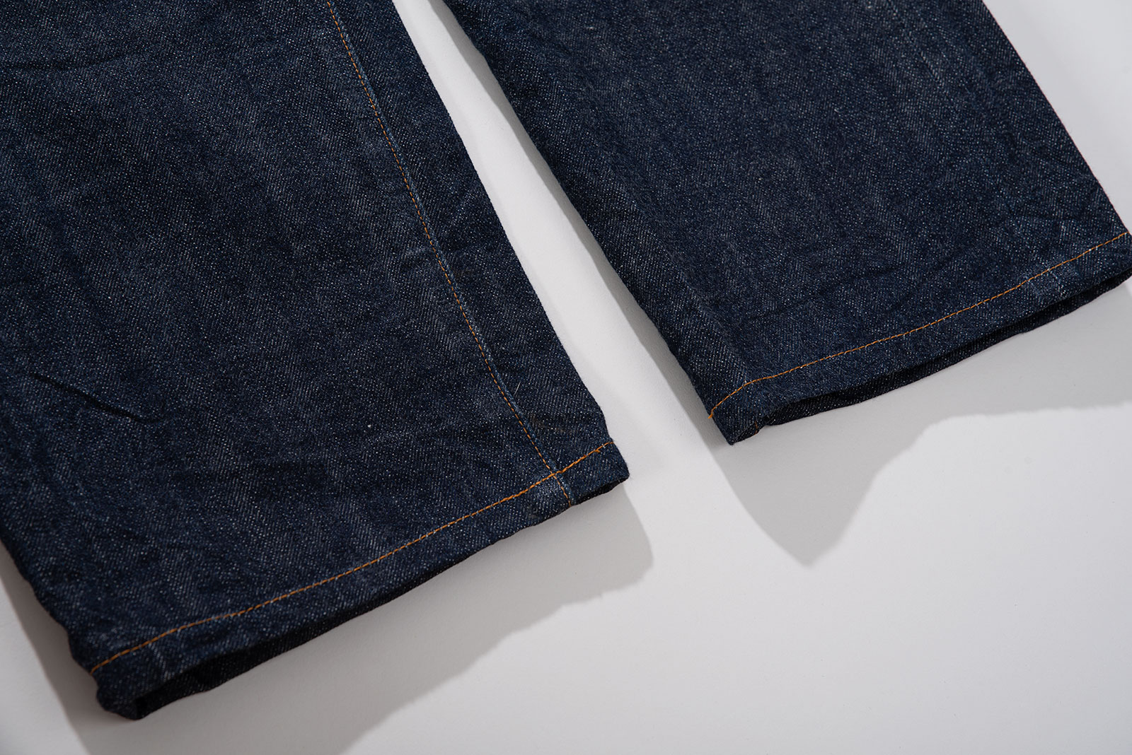 헤어리한 질감이 그대로 살아있는 데님 원단에 백 포켓 히든 리벳, 셀비지 디테일과 대문자 E 표기된 레드 탭, 사슴 가죽이 사용된 패치 등 재미있는 즐길 거리와 볼 거리가 즐비한 팬츠입니다.