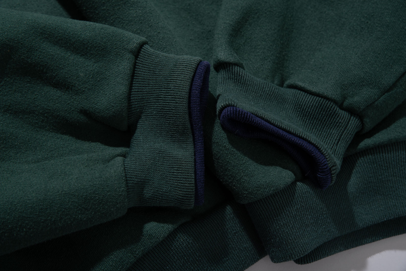 레이어드 된듯한 네이비 배색 컬러가 넥과 소매에 들어가 있어서 좀 더 풍성한 느낌이 있고 빈티지한 워싱과 색감, 90s 감성을 제대로 느낄 수 있는 넉넉한 품과 암홀 즐기실 수 있는 피스랍니다.