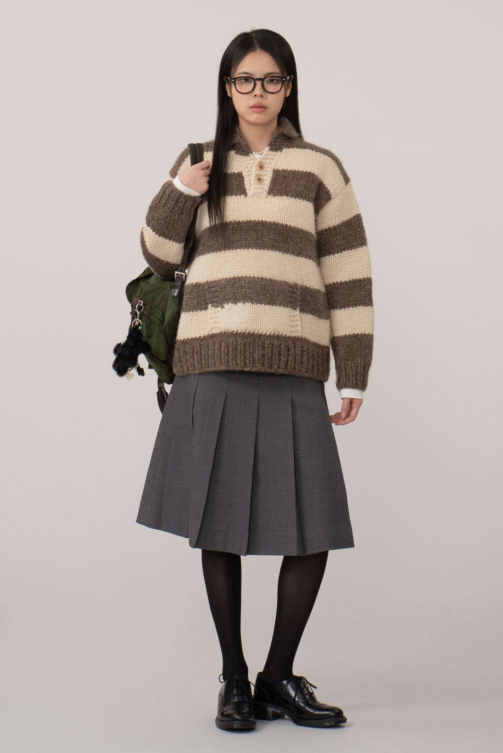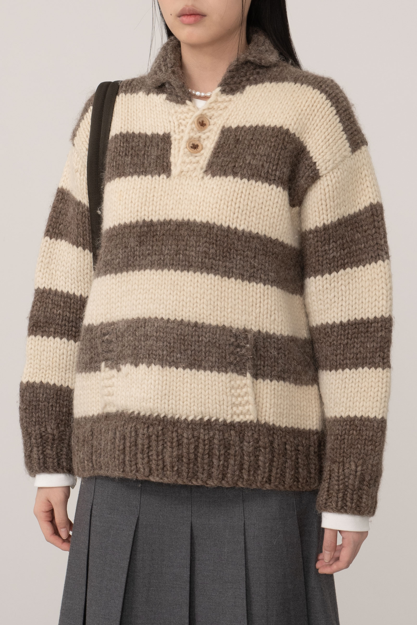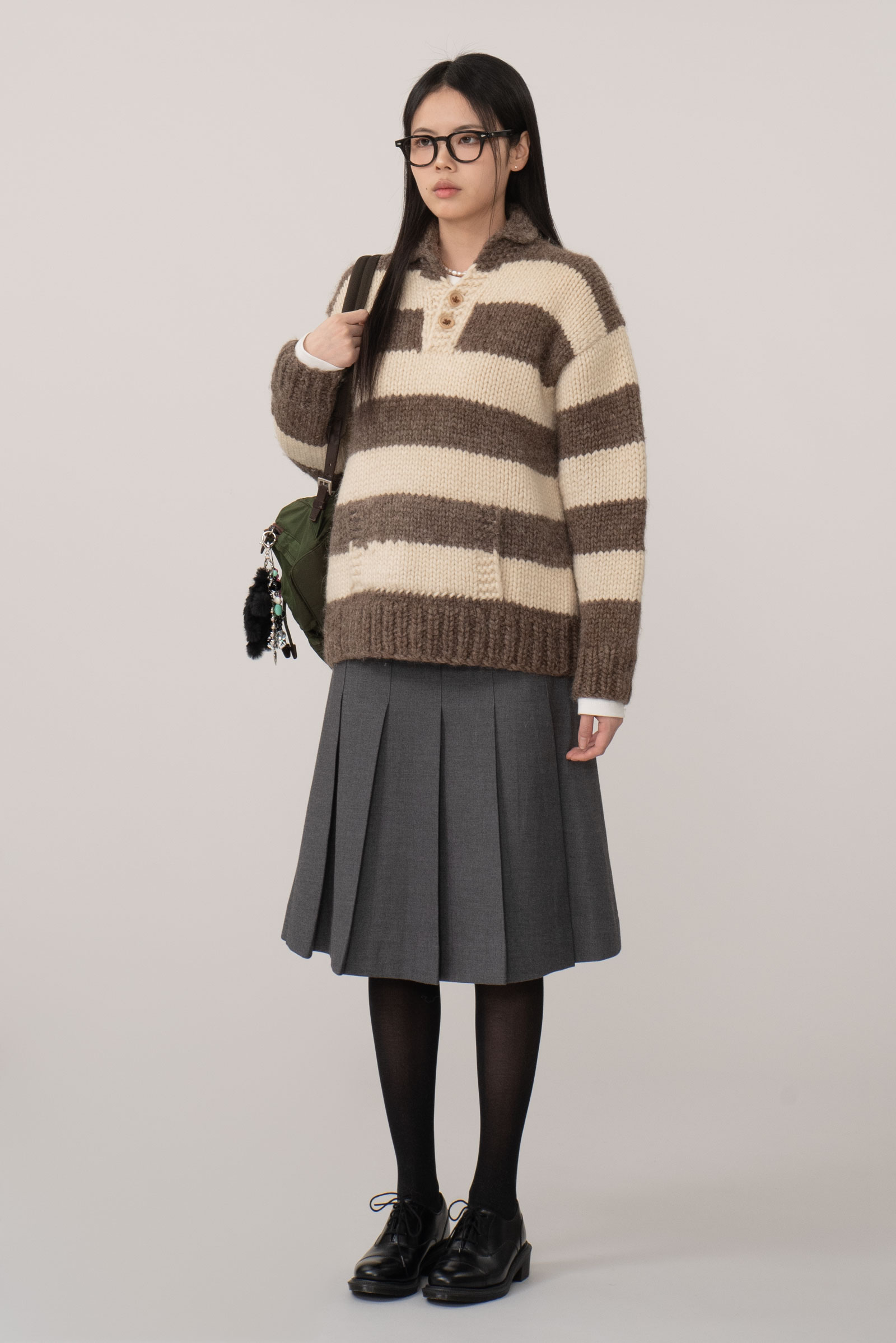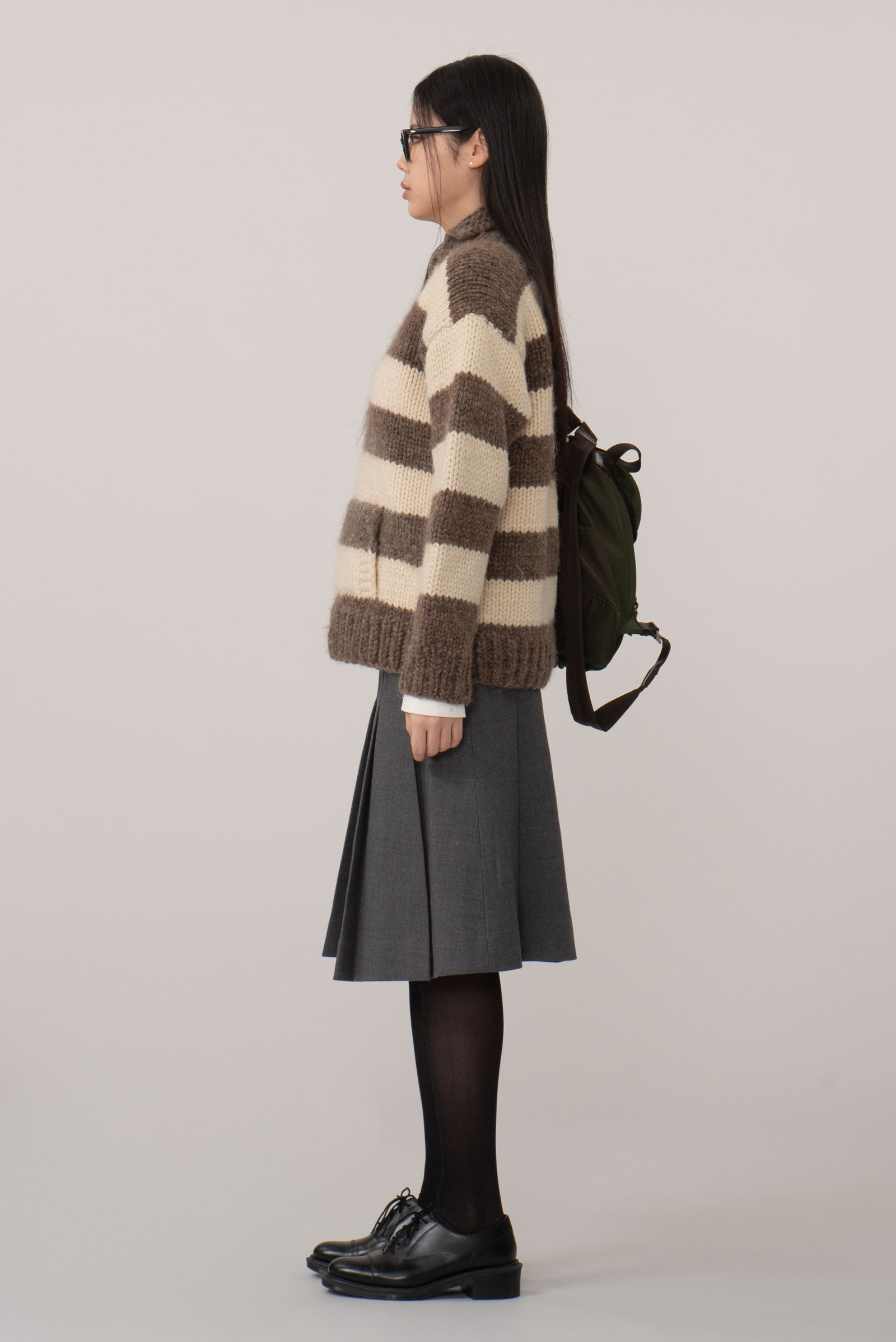 클래식한 스트라이프 패턴을 코위찬에 주로 쓰이는 브라운, 아이보리 컬러 배색으로 포인트를 주고 코위찬의 아이덴티티를 살린 둥근 숄 카라와 메이플 버튼, 귀여운 캥거루 포켓 외 심플한 디자인이랍니다.