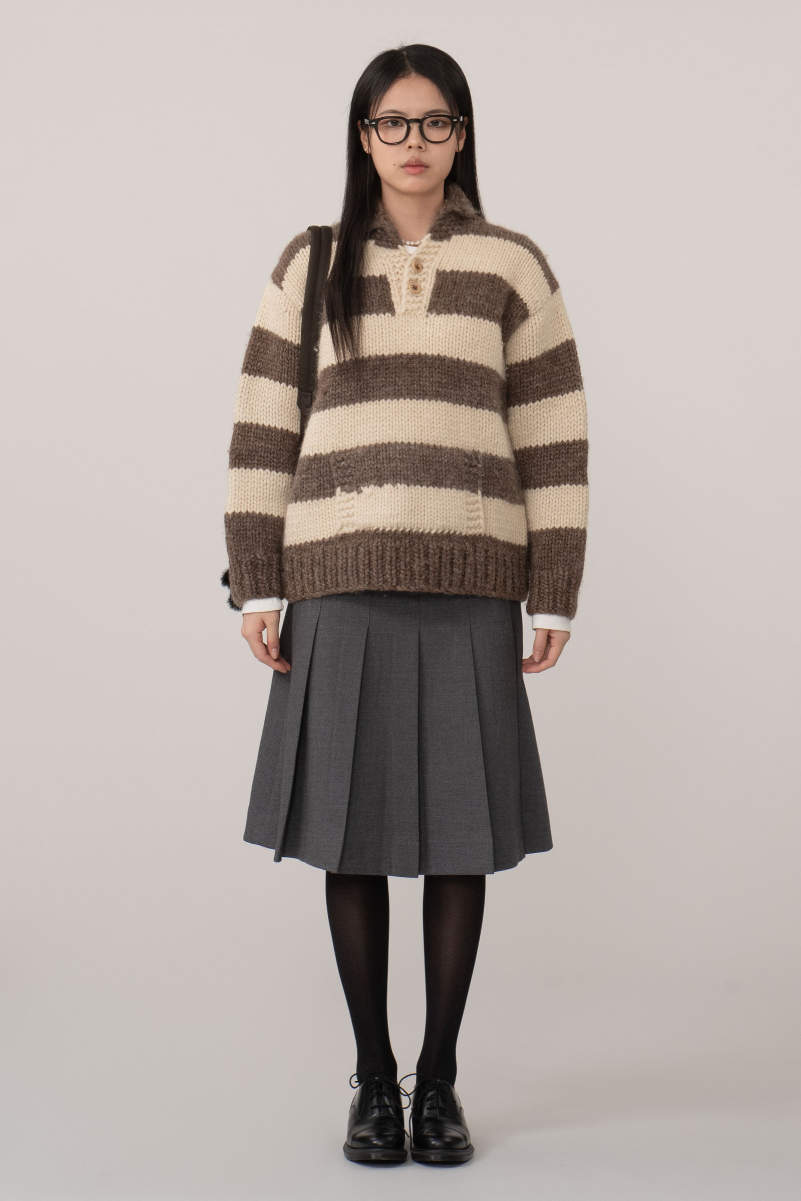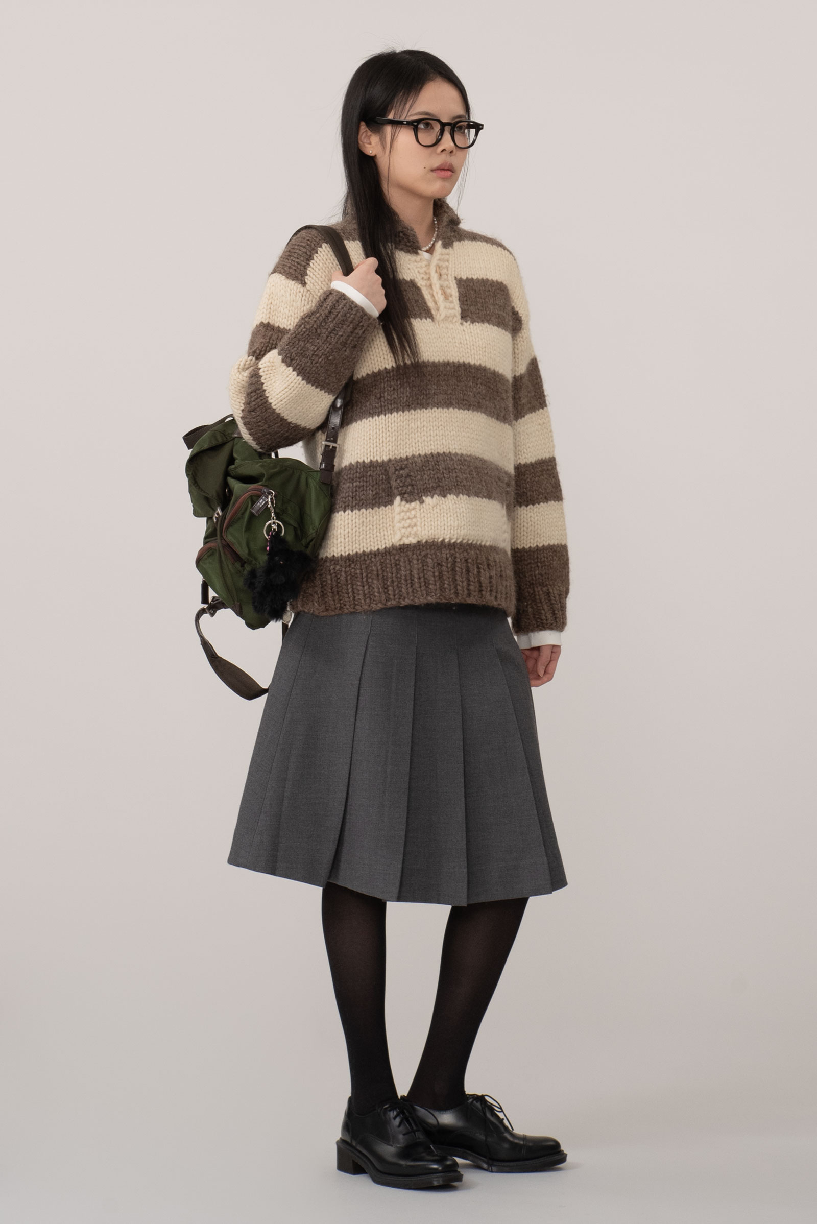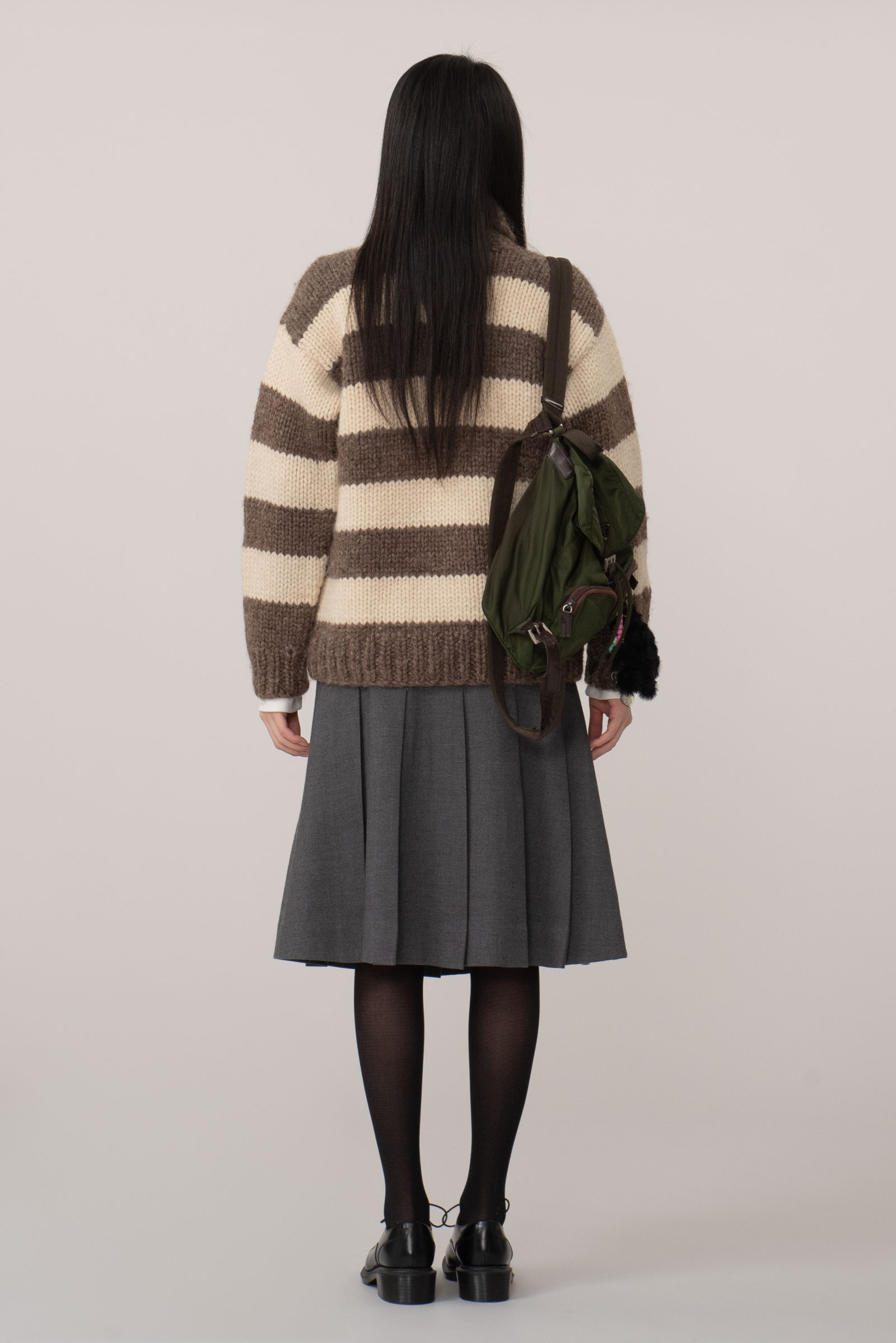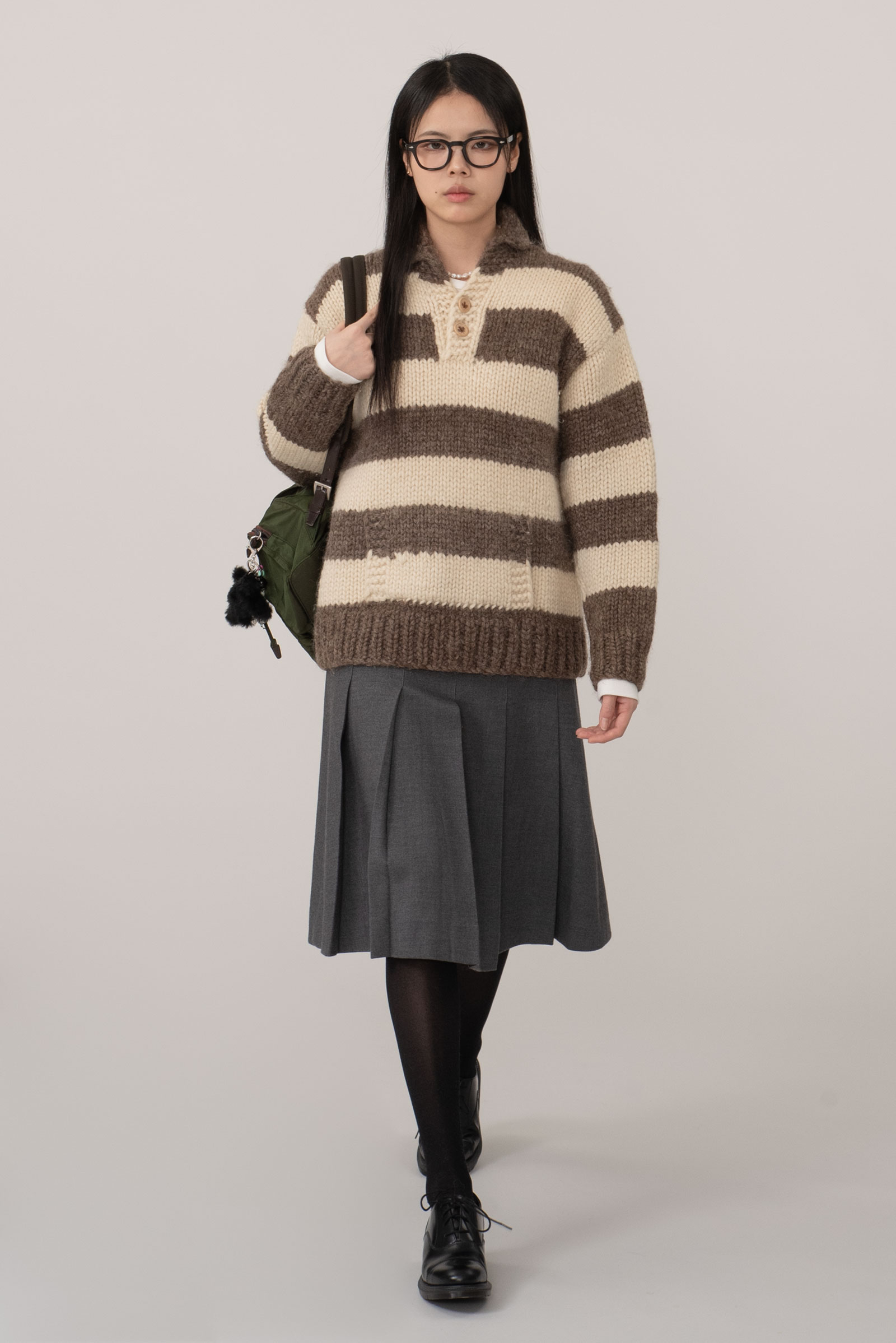 클래식한 스트라이프 패턴을 코위찬에 주로 쓰이는 브라운, 아이보리 컬러 배색으로 포인트를 주고 코위찬의 아이덴티티를 살린 둥근 숄 카라와 메이플 버튼, 귀여운 캥거루 포켓 외 심플한 디자인이랍니다.