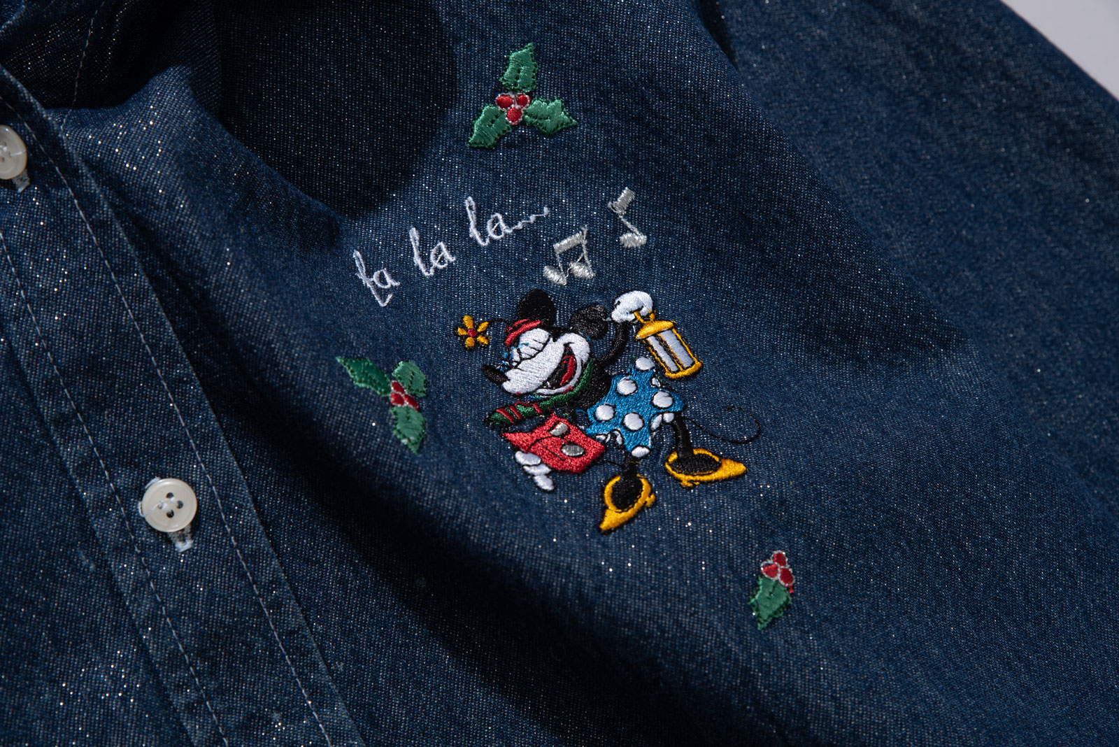 반짝이 실사가 돋보이는 원단 텍스처에 진청 컬러, 겨울 시즌 쓰임이 다양한 크리스마스 모티브 자수가 굉장히 유니크한 피스인데요.