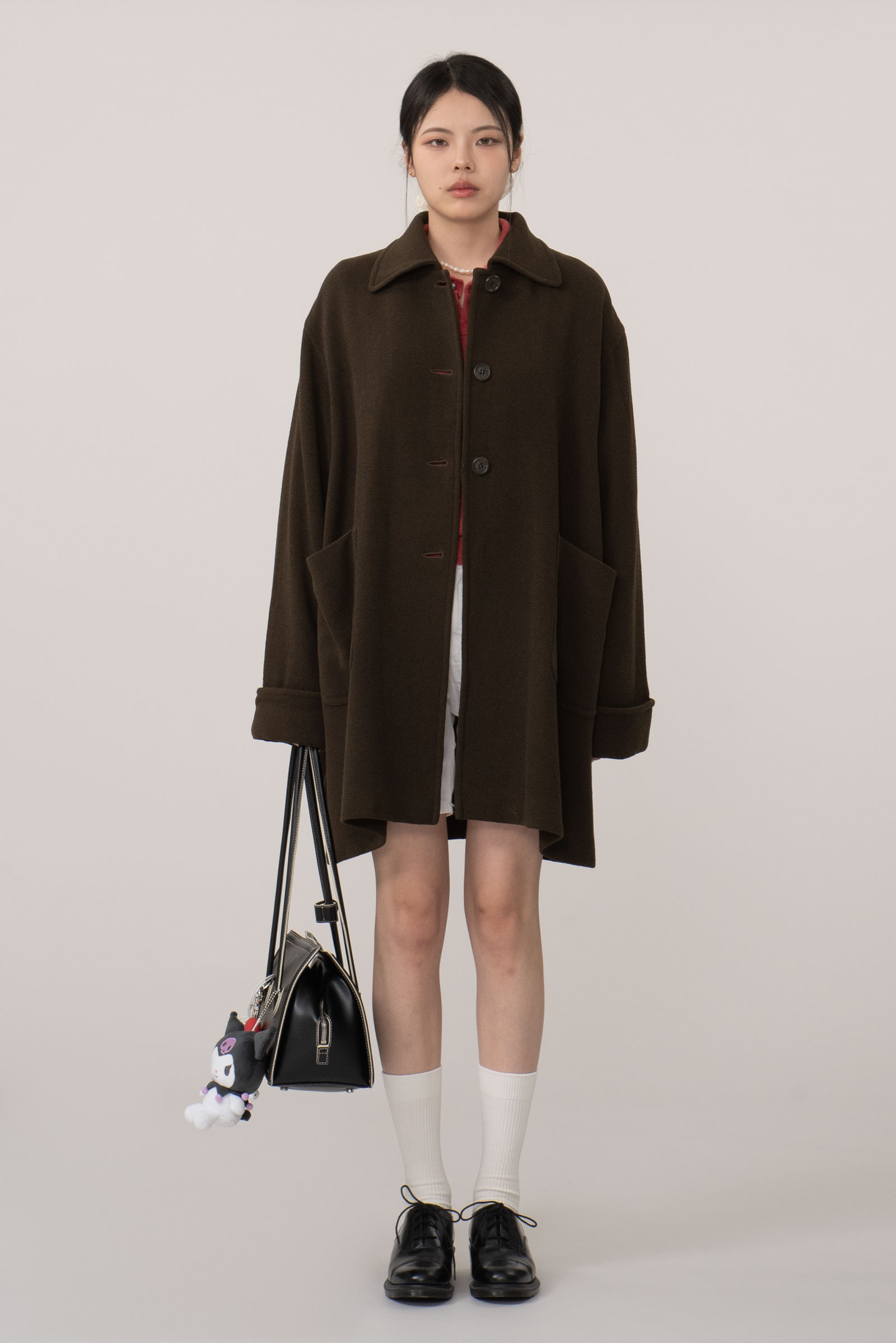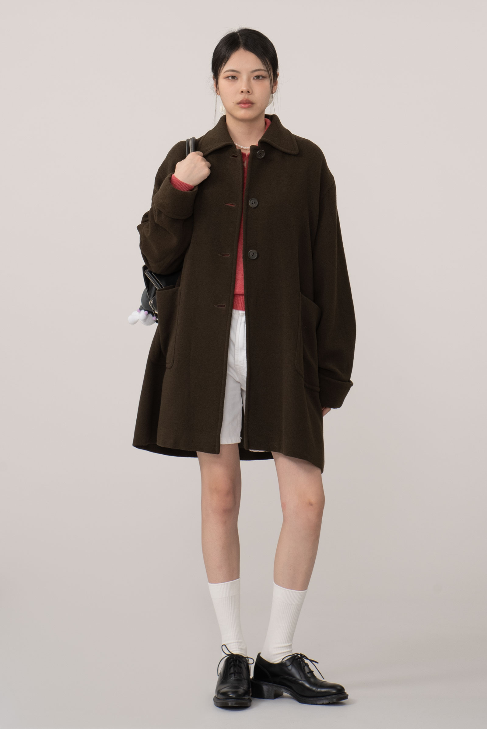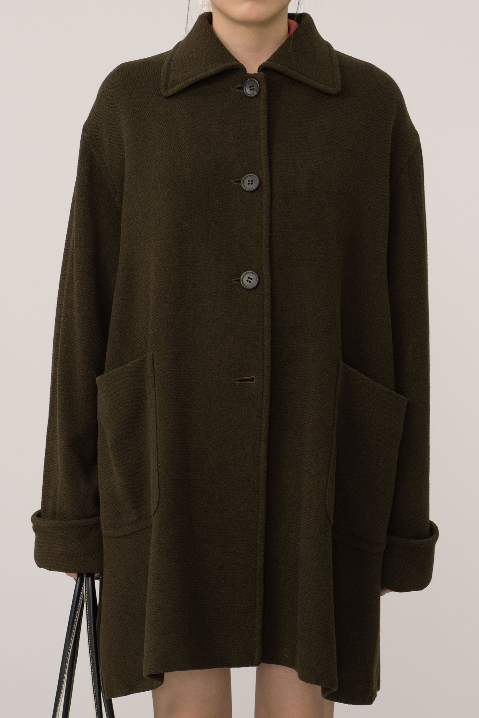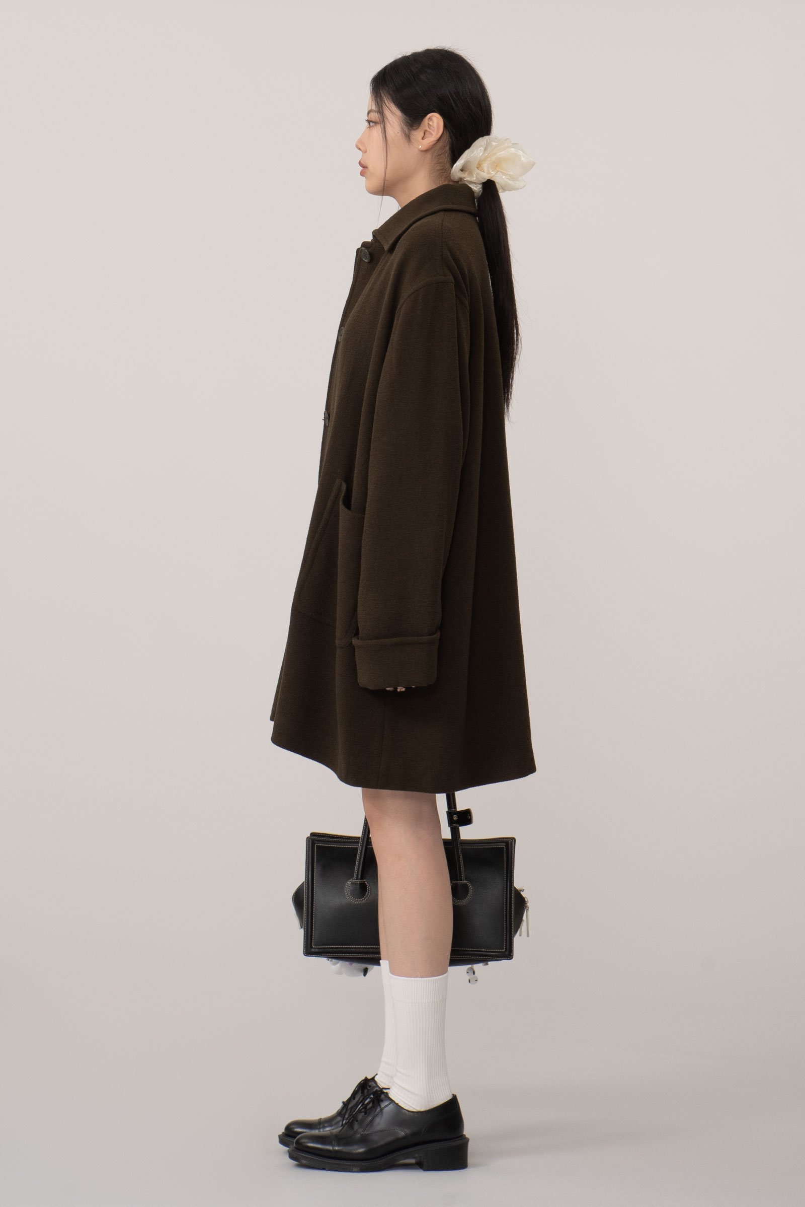 오버한 사이즈에 드롭 숄더는 한층 더 여유로운 느낌을 주고 클래식한 싱글 디자인에 큰 디테일 없이 컬러와 포켓, 실루엣만으로 승부를 건 코트에요.