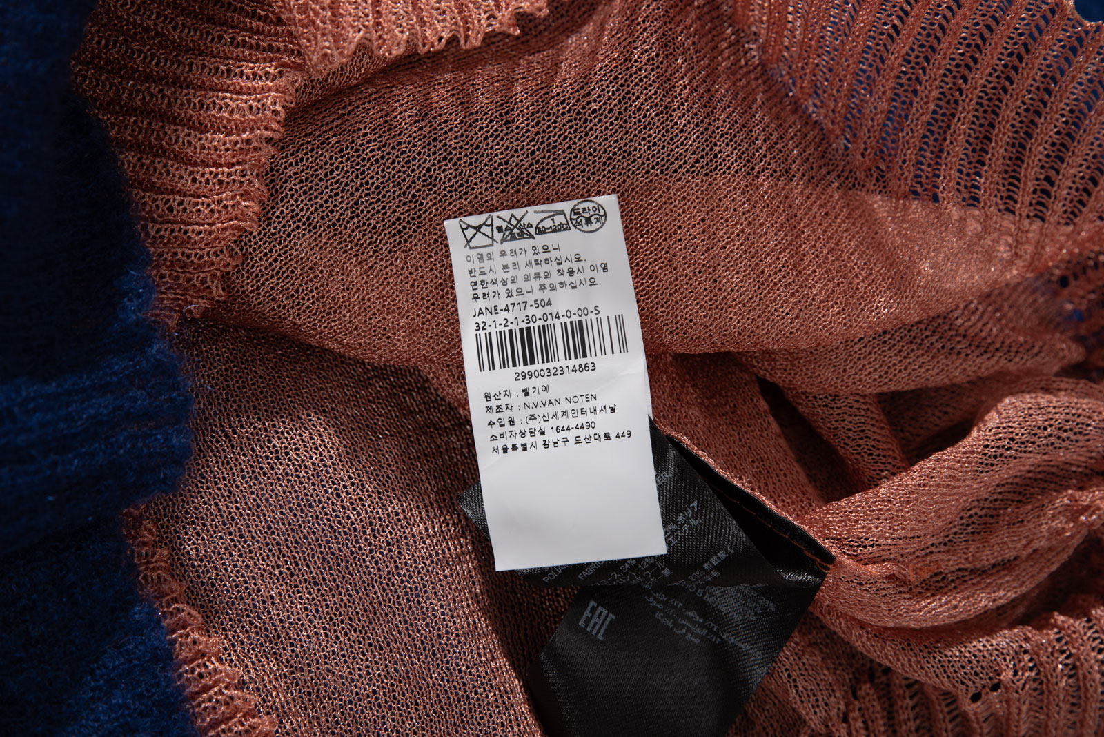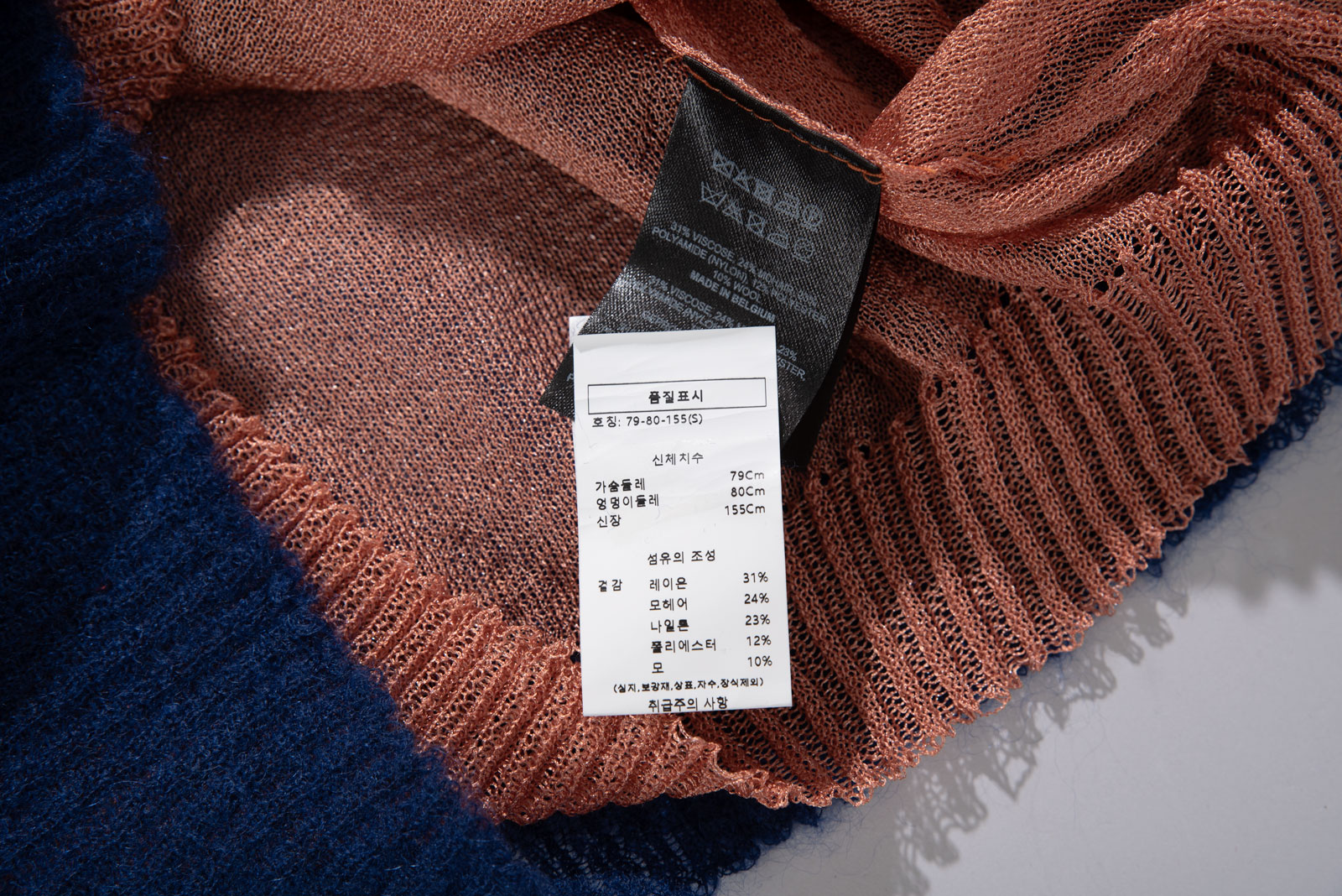 모헤어와 울, 레이온과 폴리 등 합성섬유 혼방의 예민한 소재이지만 고품질 원단 사용되었으며 정밀하고 세심한 짜임과 전반적인 밸런스가 아주 멋스럽네요.