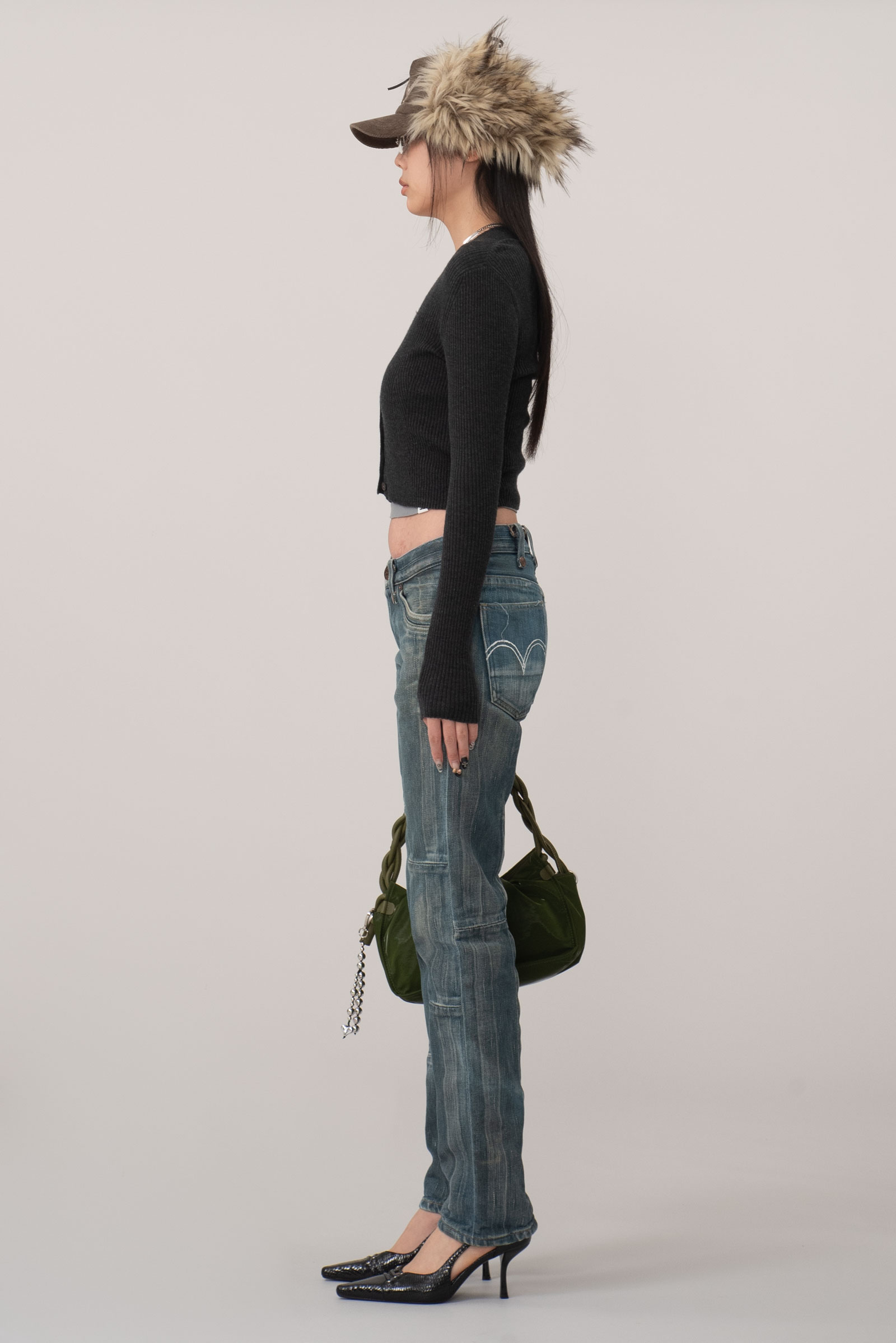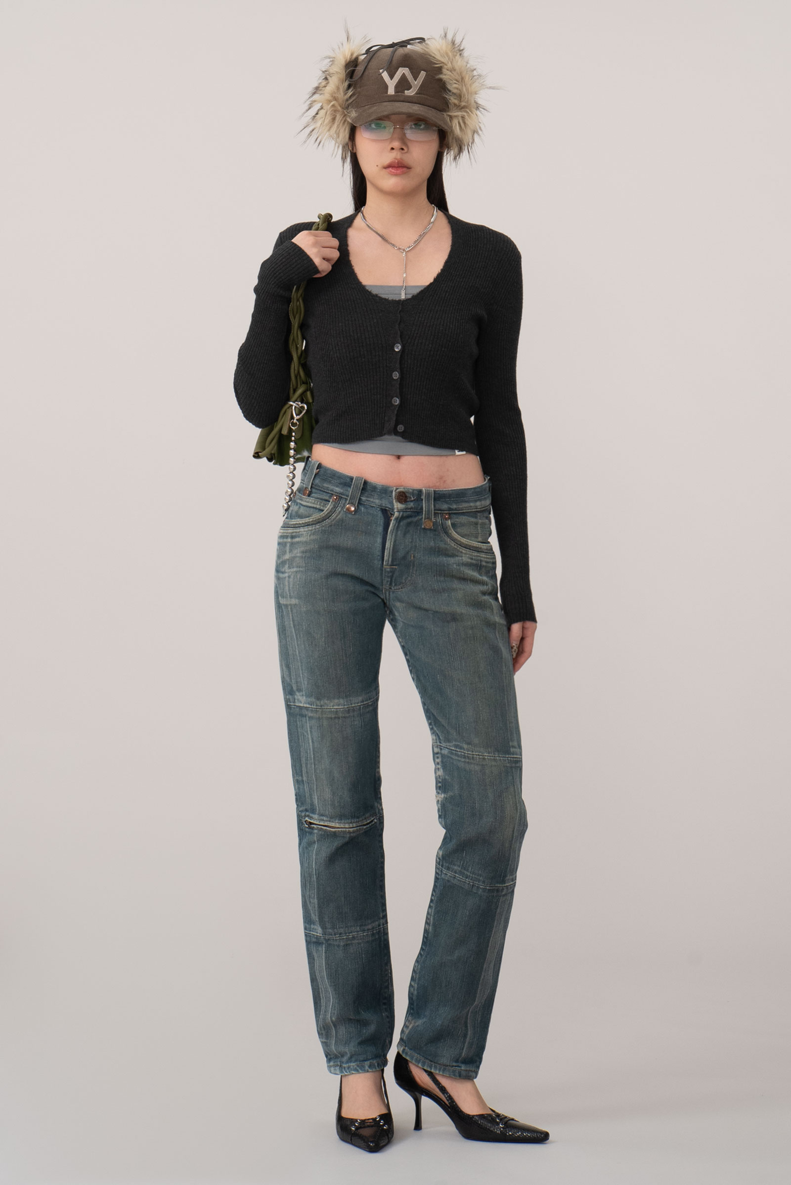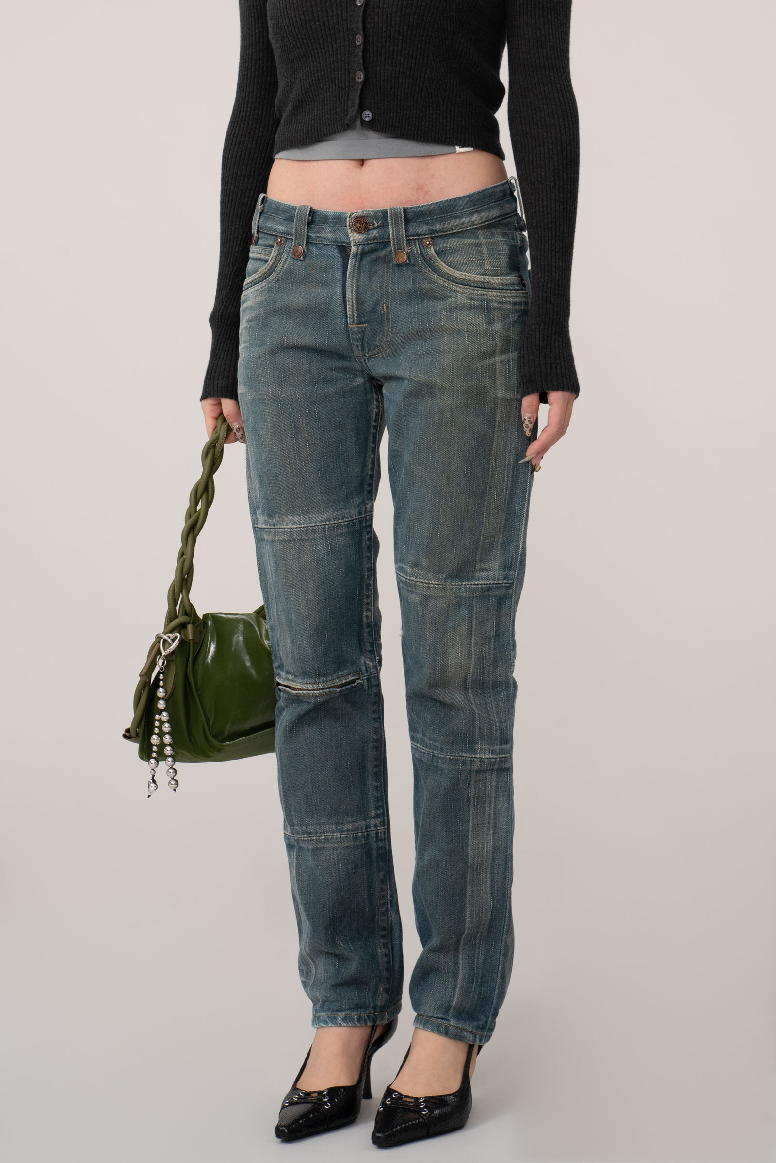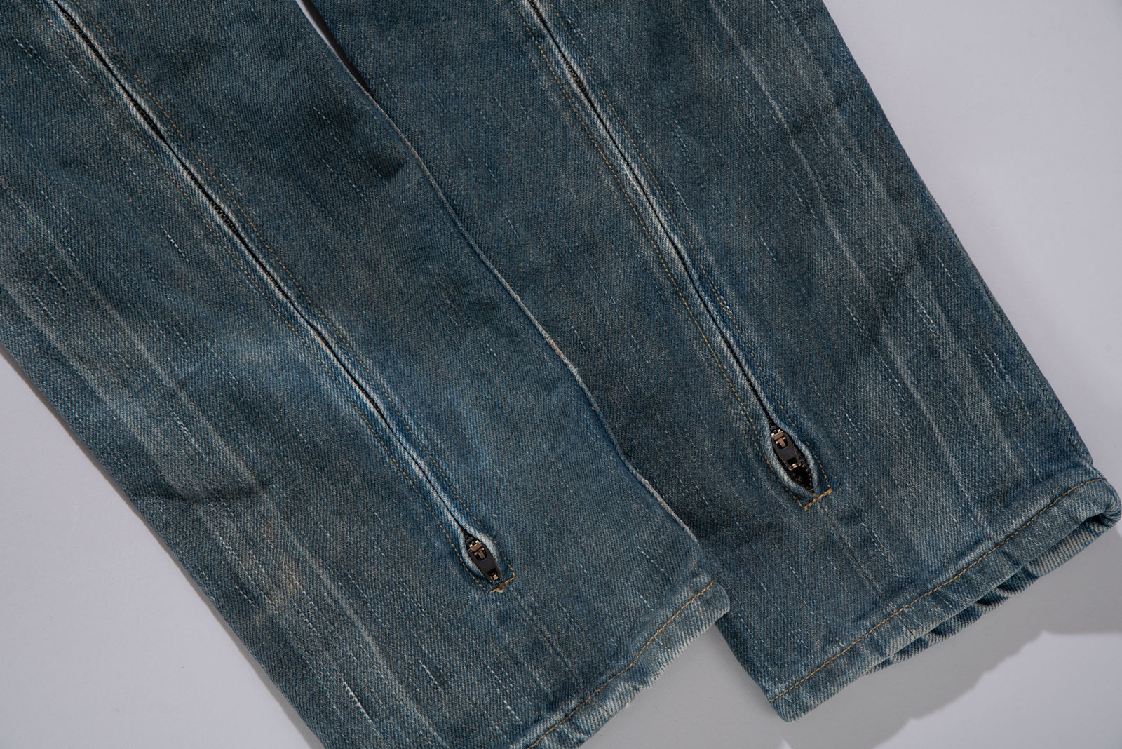 두툼하고 치밀한 짜임의 고품질 데님 원단, 영한 감성의 로우라이즈와 스키니한 실루엣이 눈에 띄며 원단을 이어 붙인듯한 패치워크 기법, 전후면의 지퍼 디테일이 파격적이랍니다.