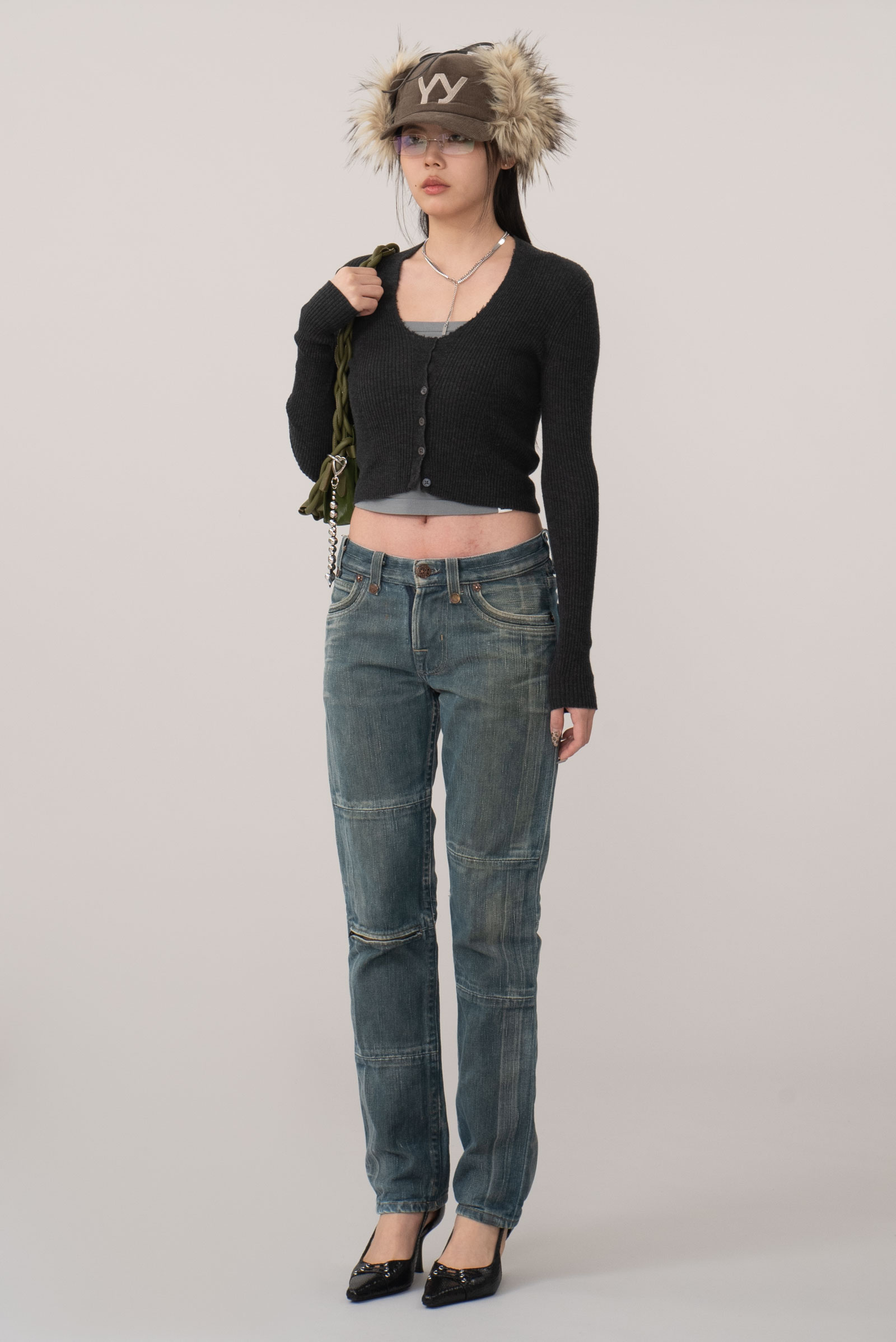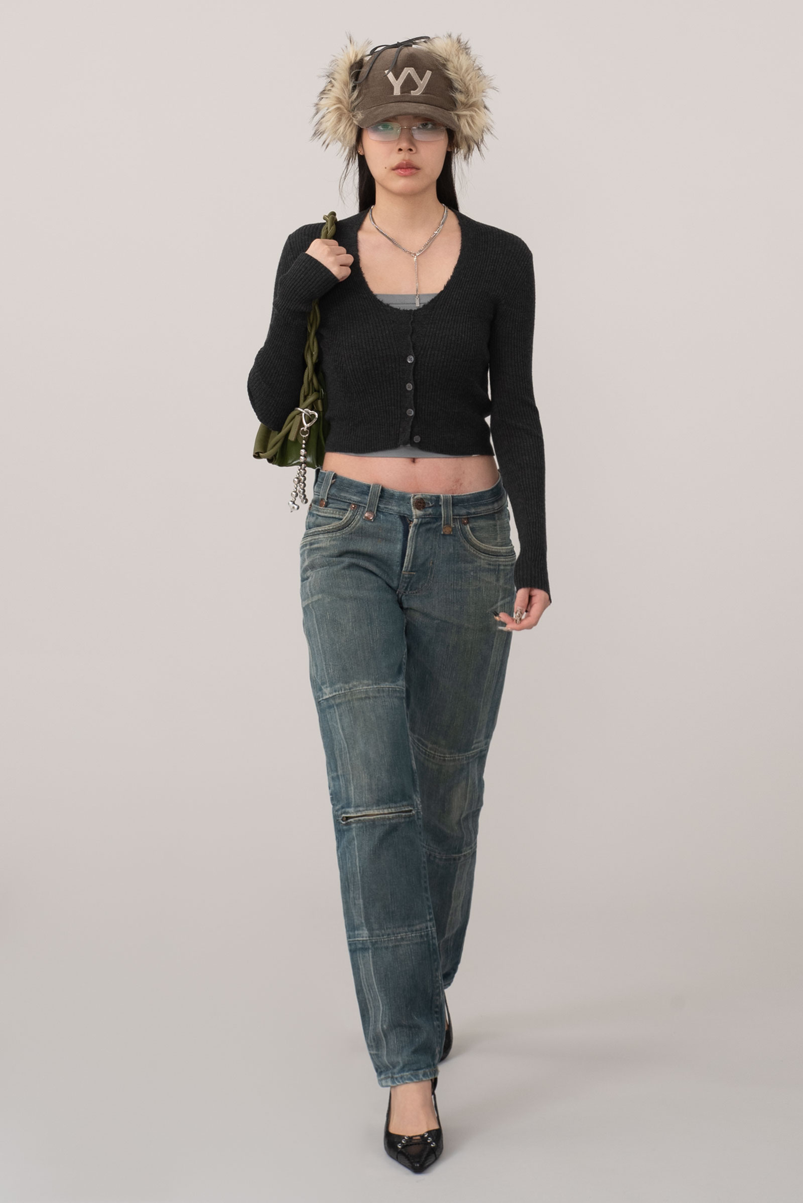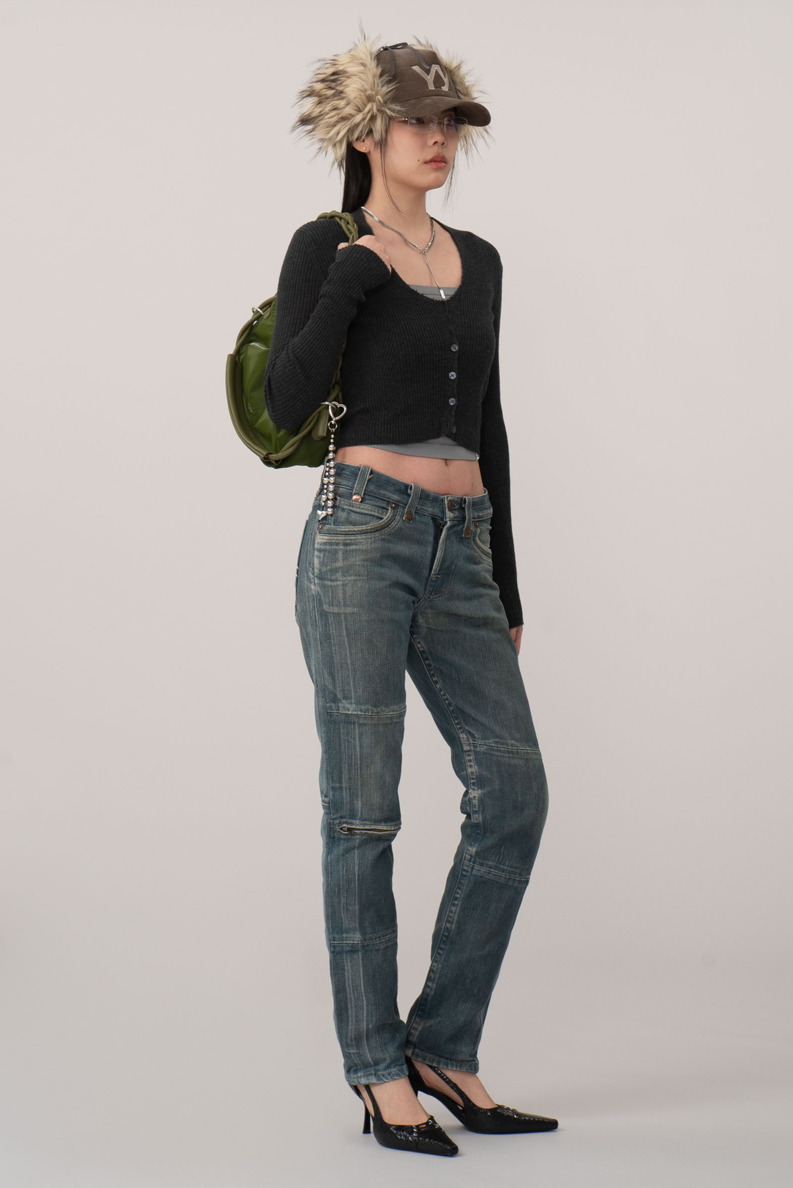 두툼하고 치밀한 짜임의 고품질 데님 원단, 영한 감성의 로우라이즈와 스키니한 실루엣이 눈에 띄며 원단을 이어 붙인듯한 패치워크 기법, 전후면의 지퍼 디테일이 파격적이랍니다.