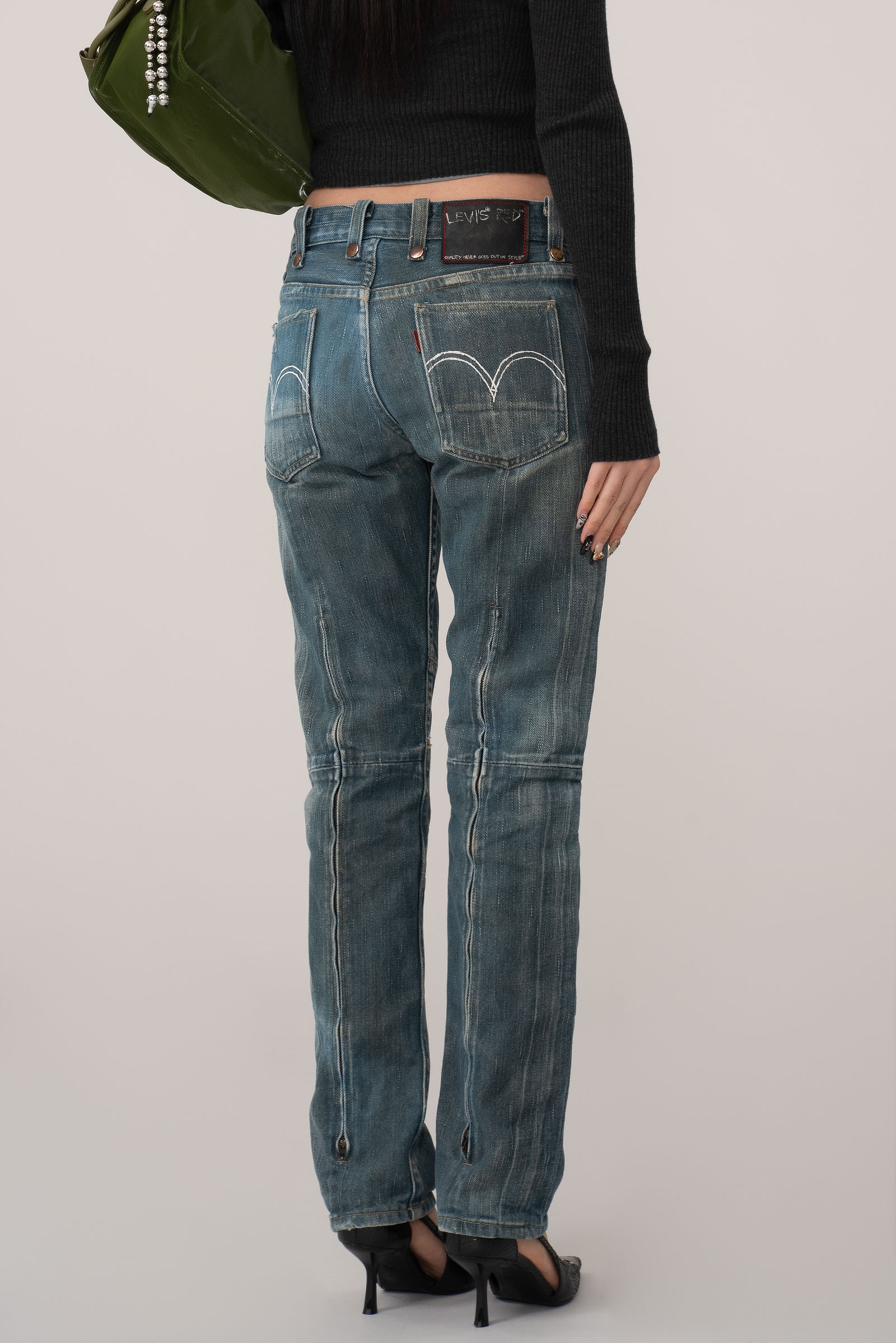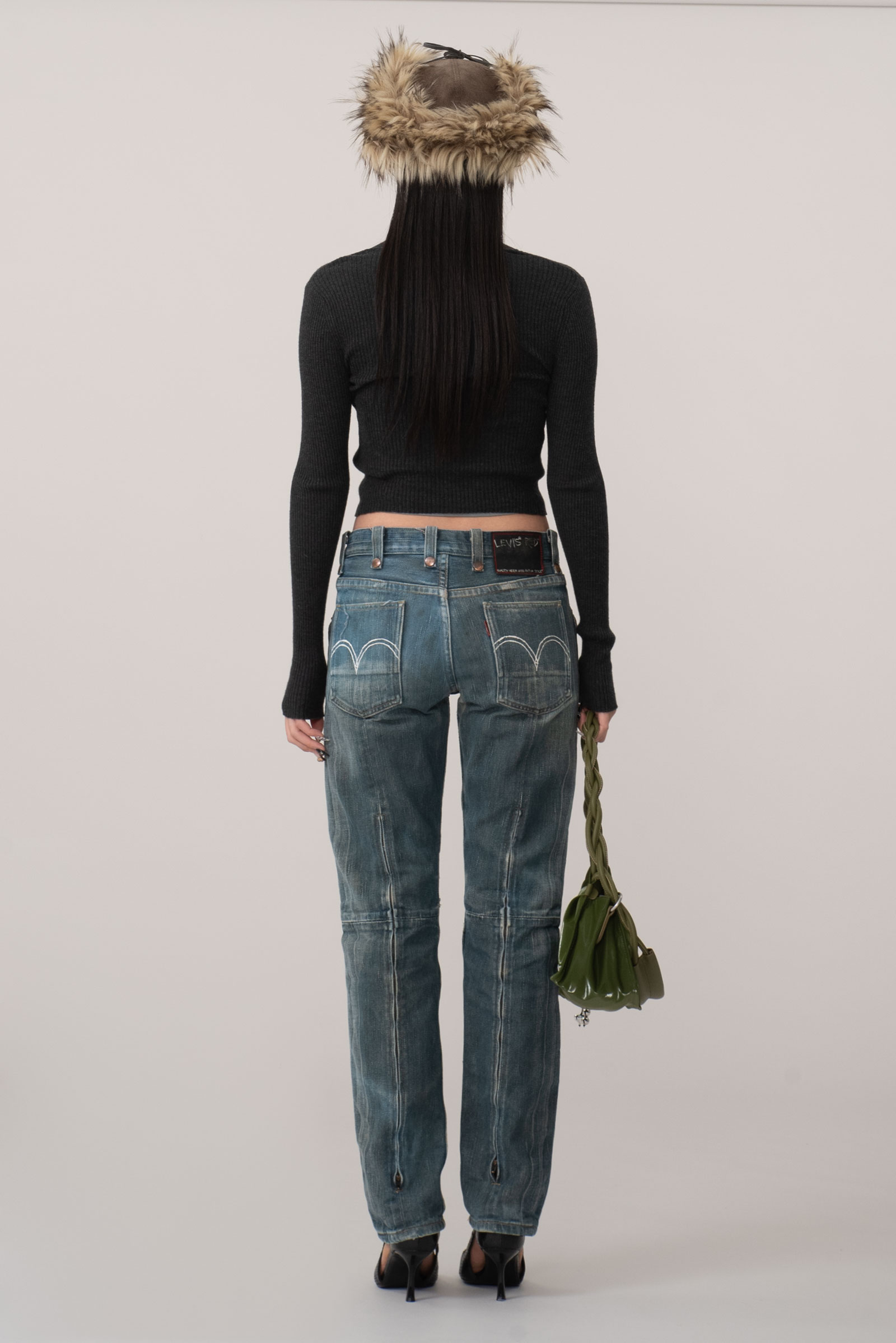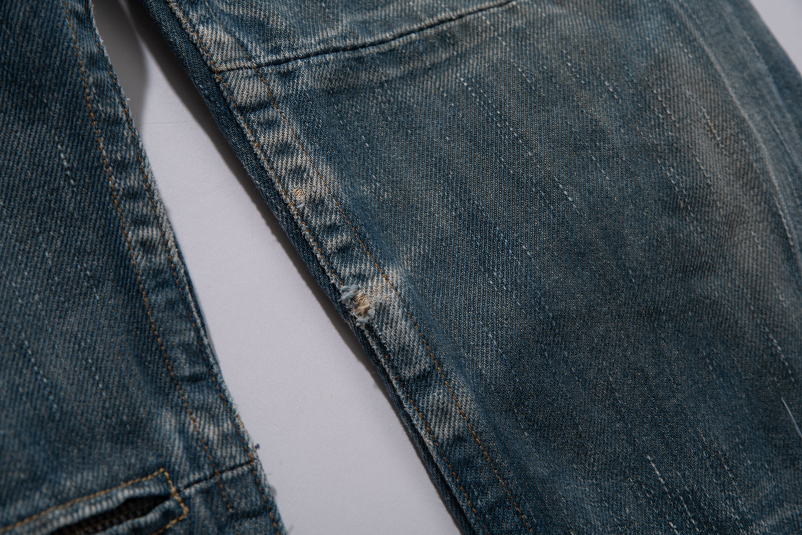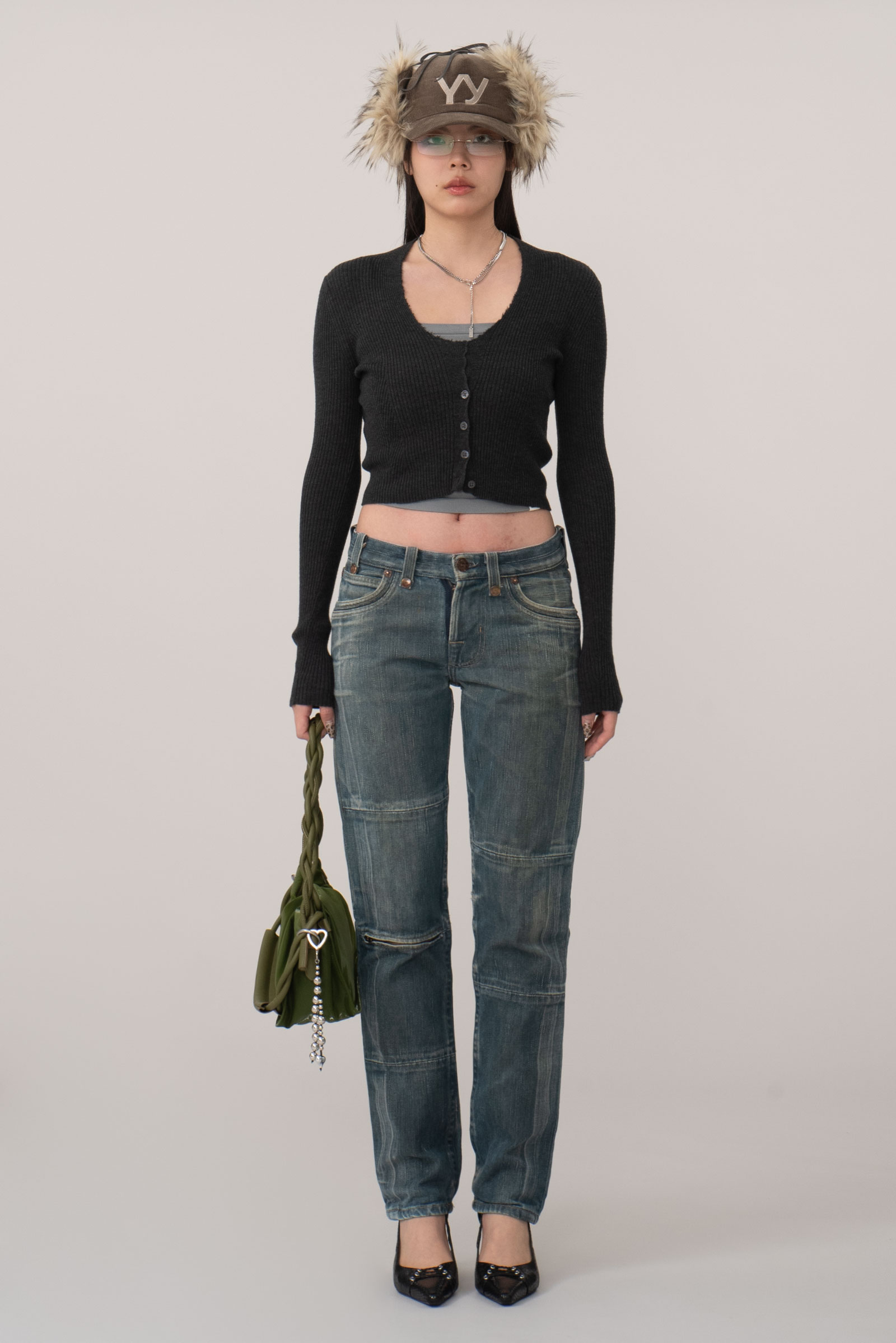 두툼하고 치밀한 짜임의 고품질 데님 원단, 영한 감성의 로우라이즈와 스키니한 실루엣이 눈에 띄며 원단을 이어 붙인듯한 패치워크 기법, 전후면의 지퍼 디테일이 파격적이랍니다.