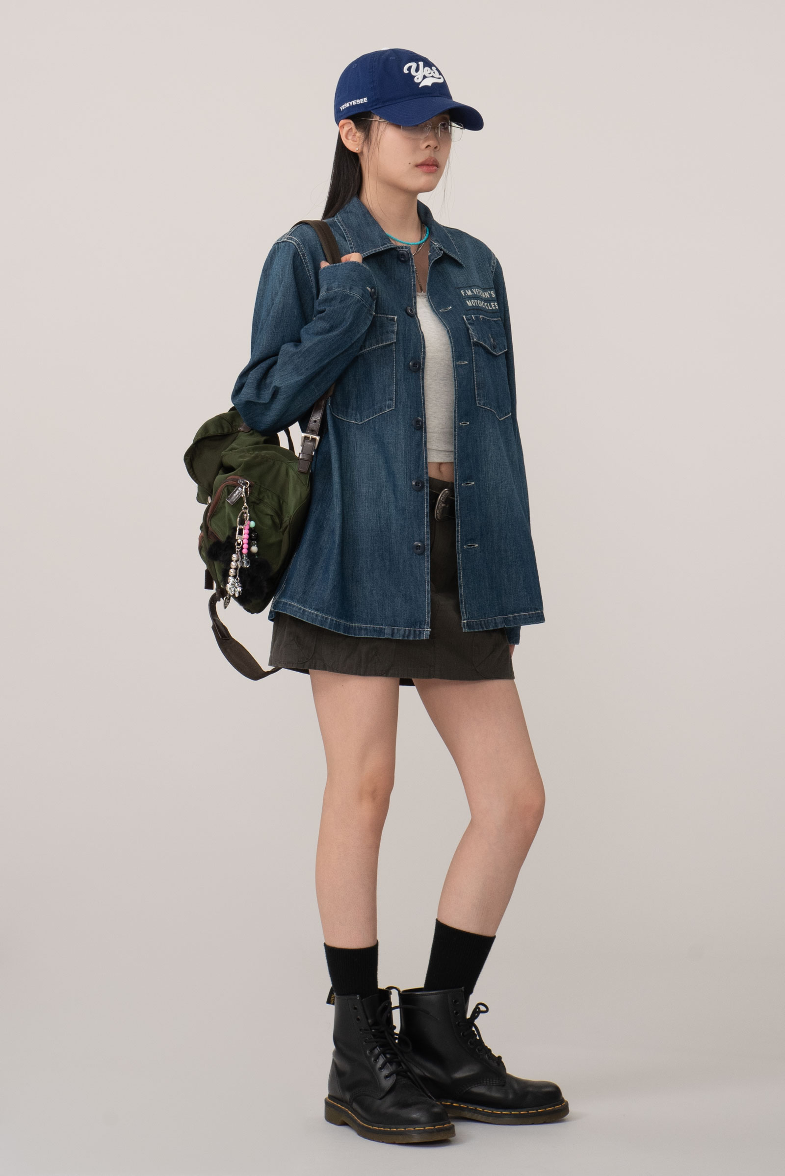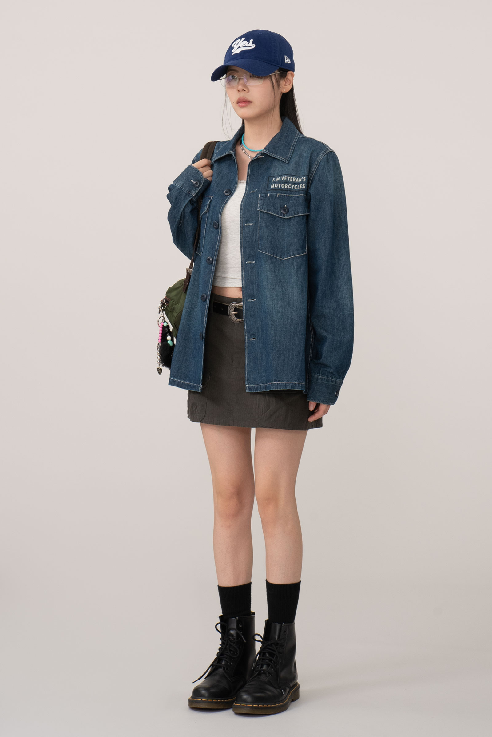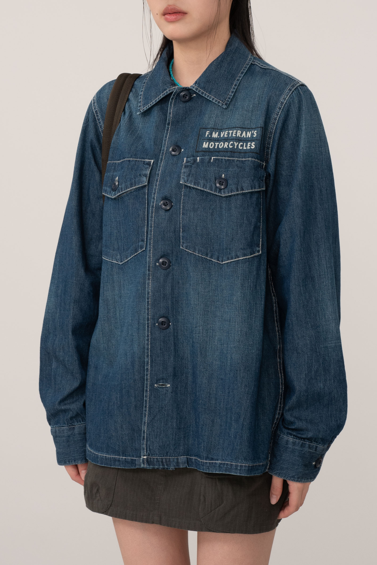 가슴에 두개의 커다란 포켓과 눈에 띄는 단추, 후면의 프린팅 등 자유분방한 무드와 잘 어우러지는 디자인이에요.