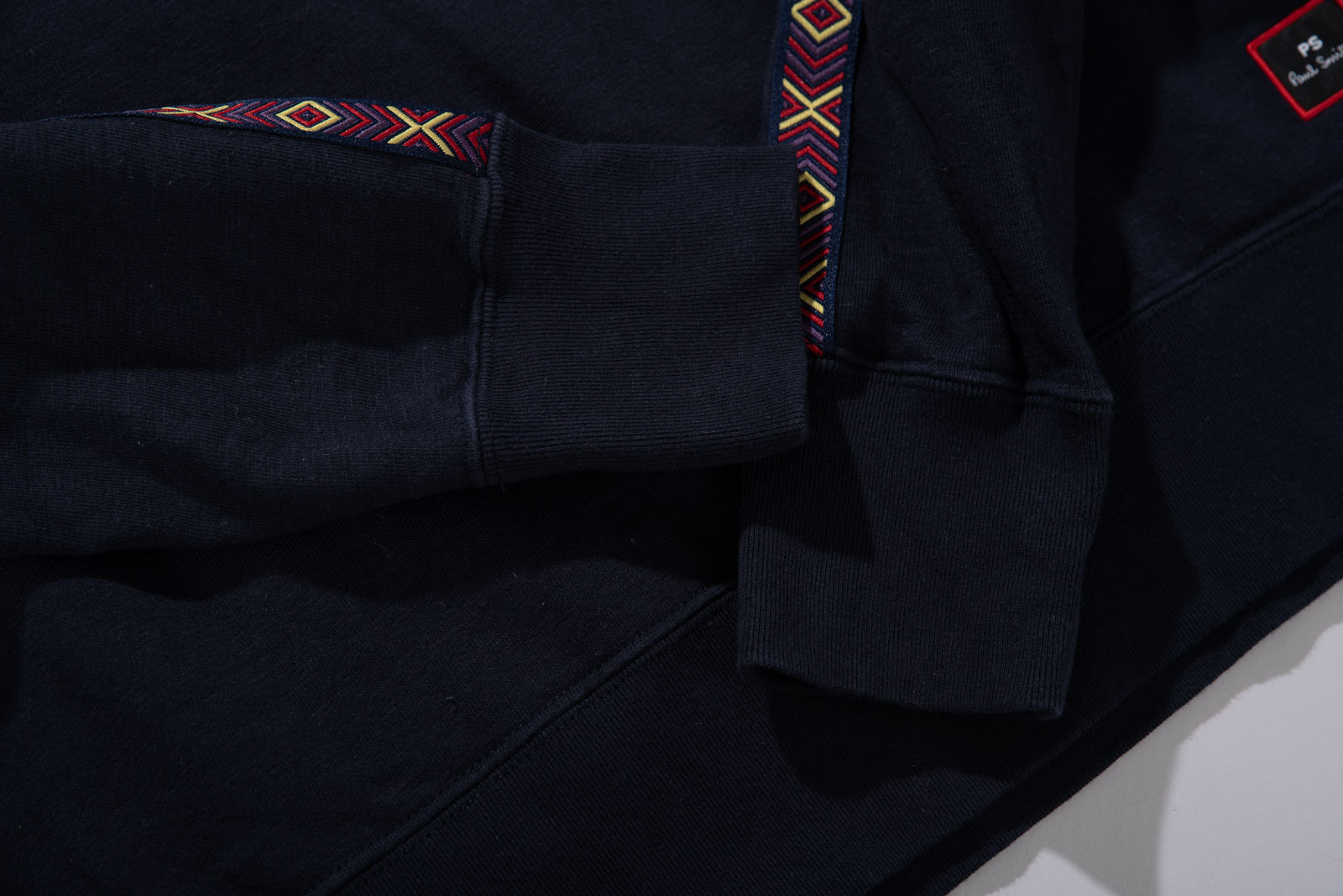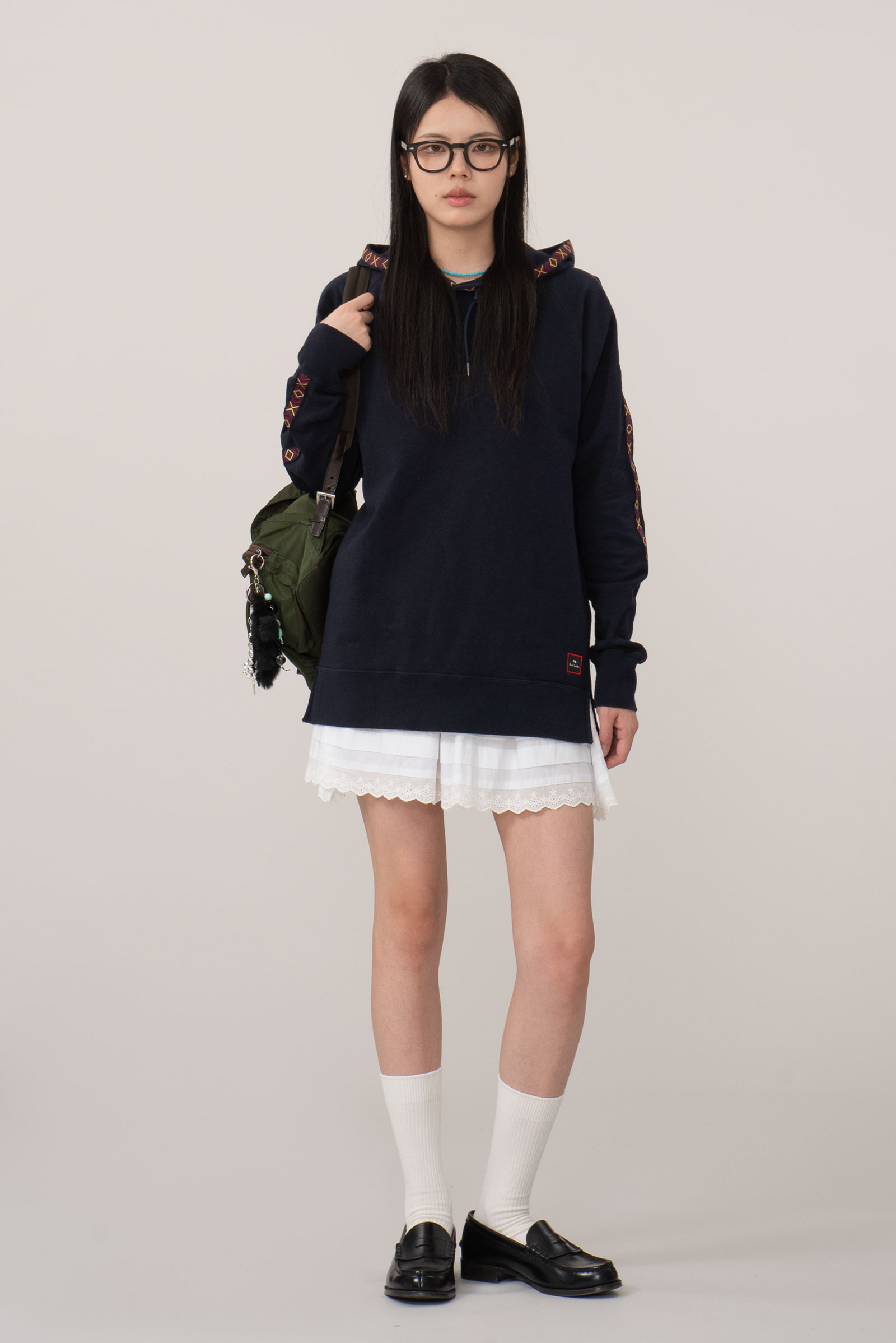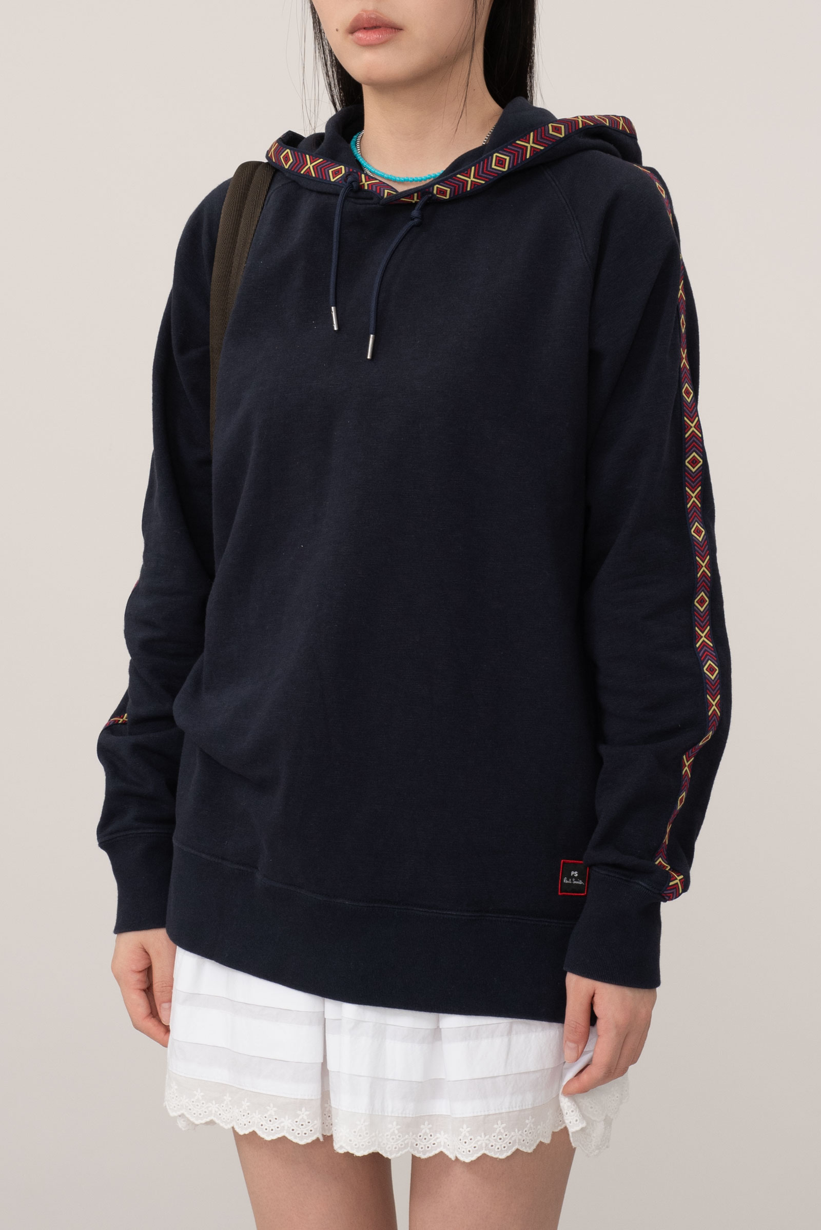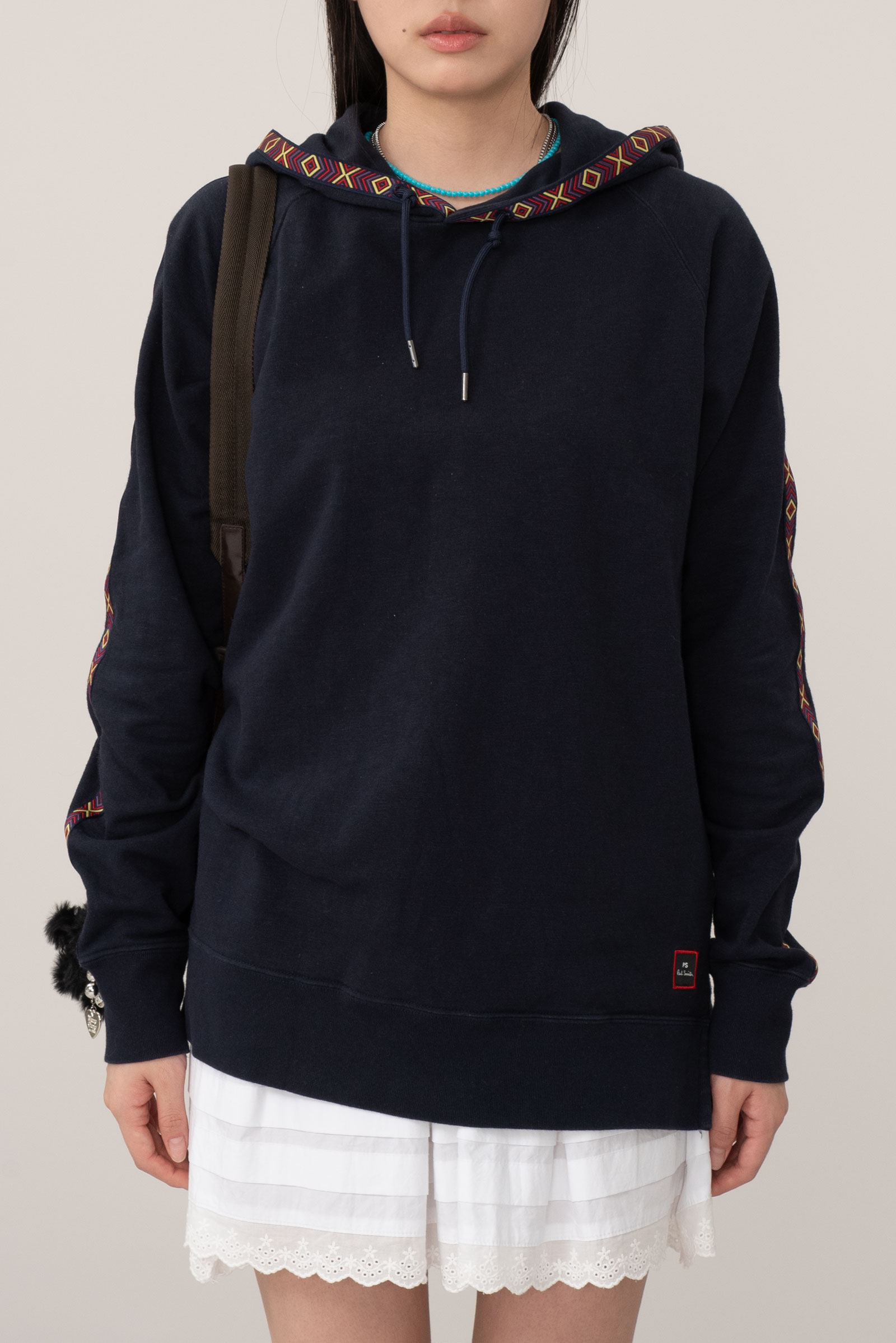 밑단 시보리가 있으나 사이드가 트여 있는 디자인이라 좀 더 여유 있는 느낌으로 입을 수 있고 무엇보다 팔과 후드에 파이핑 된 아즈택 자수가 너무 예뻐요.