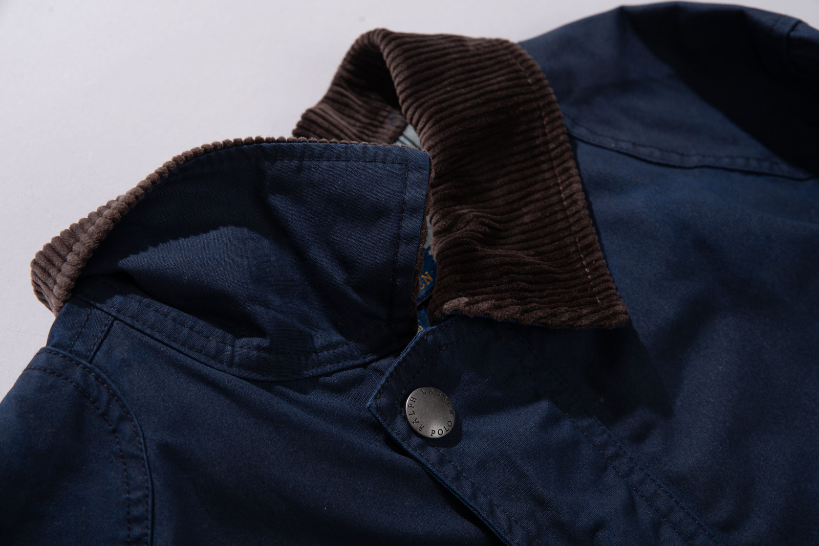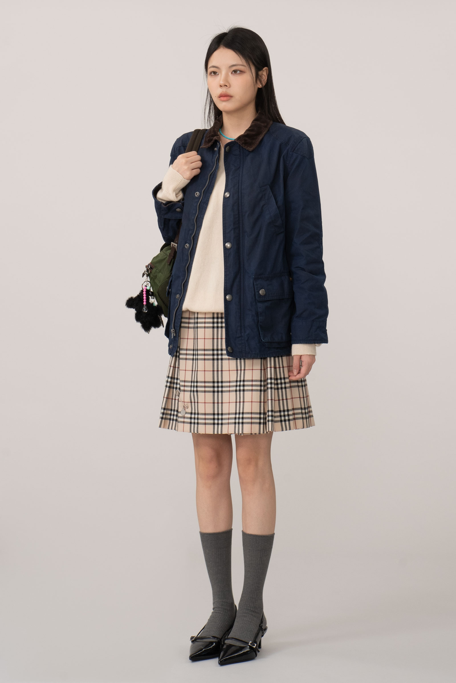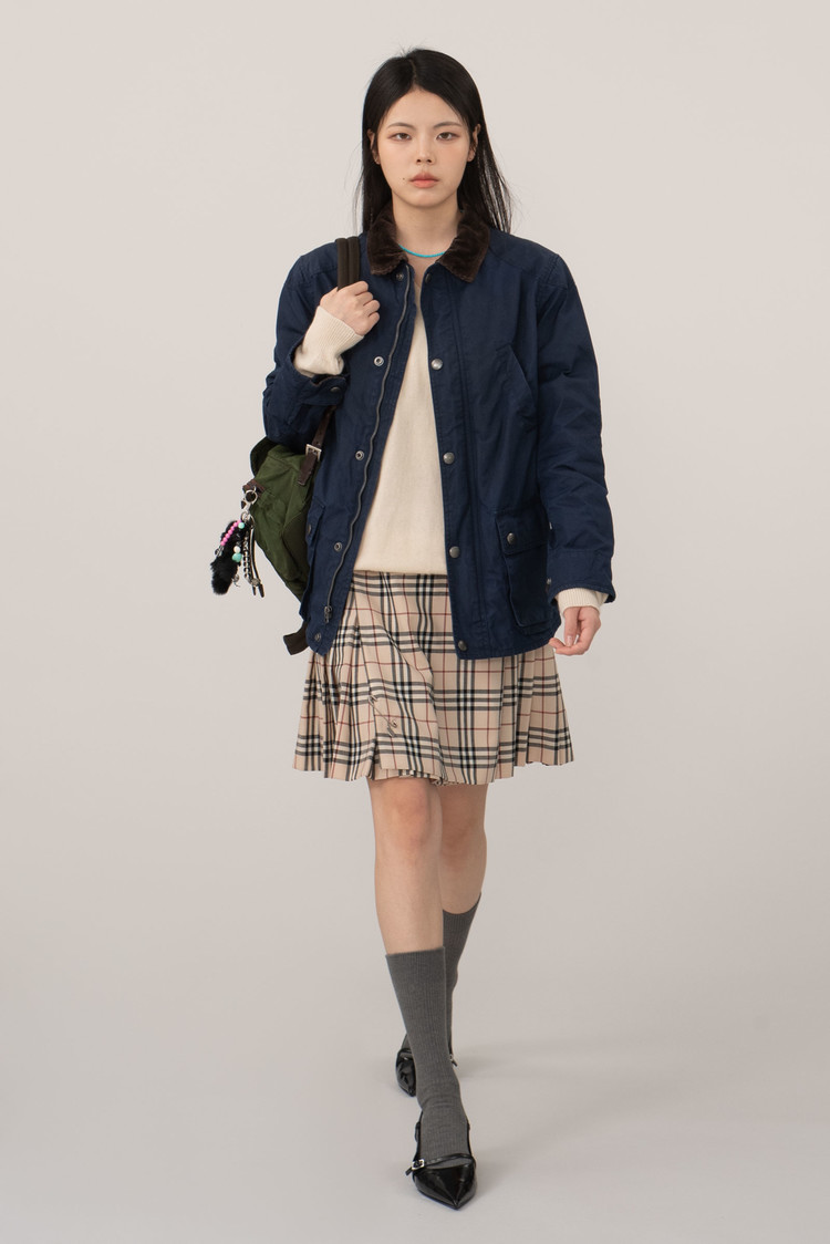 무난하게 착용하기 좋은 네이비 컬러에 헌팅 재킷 고유의 실루엣과 디자인을 벗어나지 않은 클래식함, 밀도 있는 골덴 소재 카라가 돋보이는 아이템인데요.