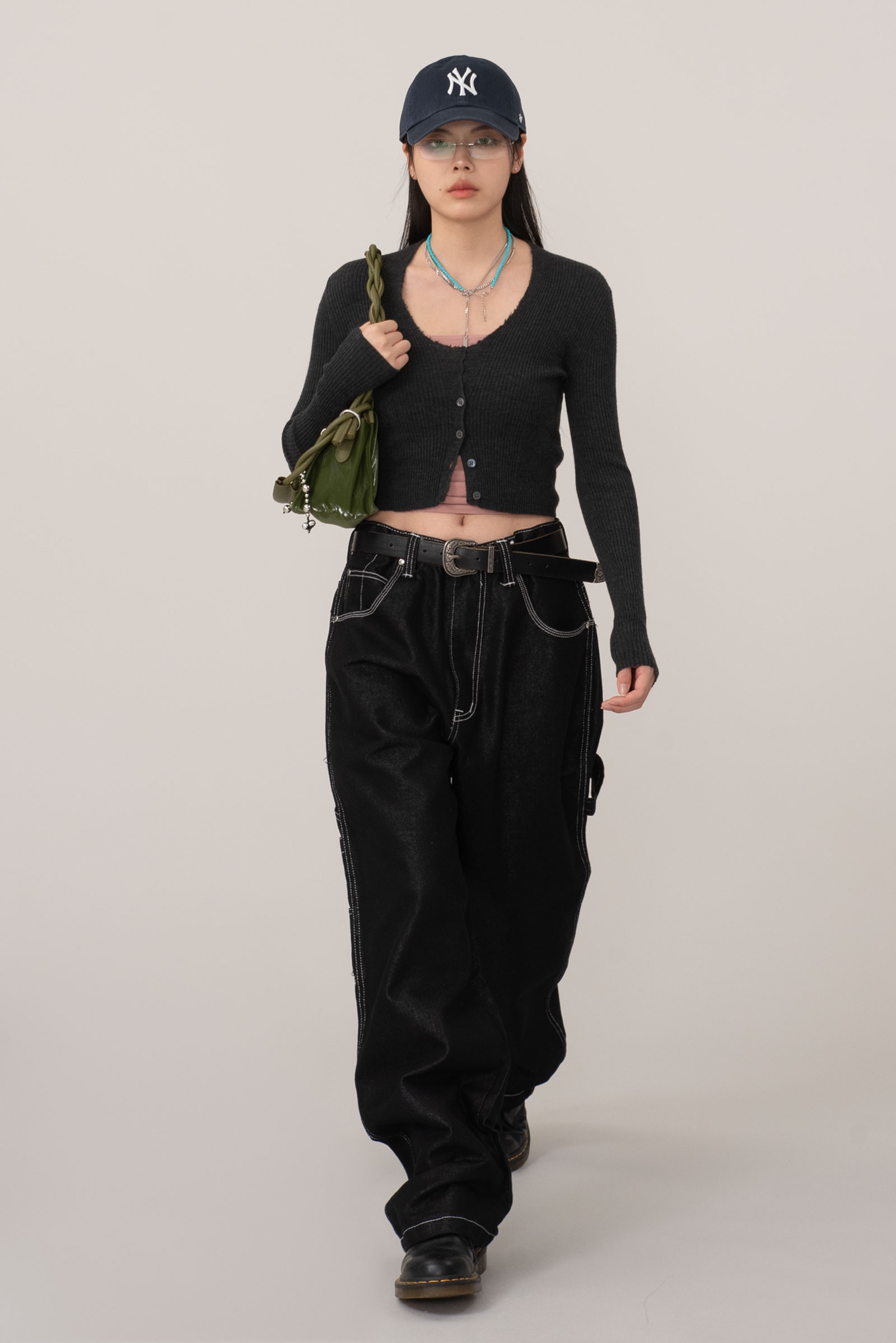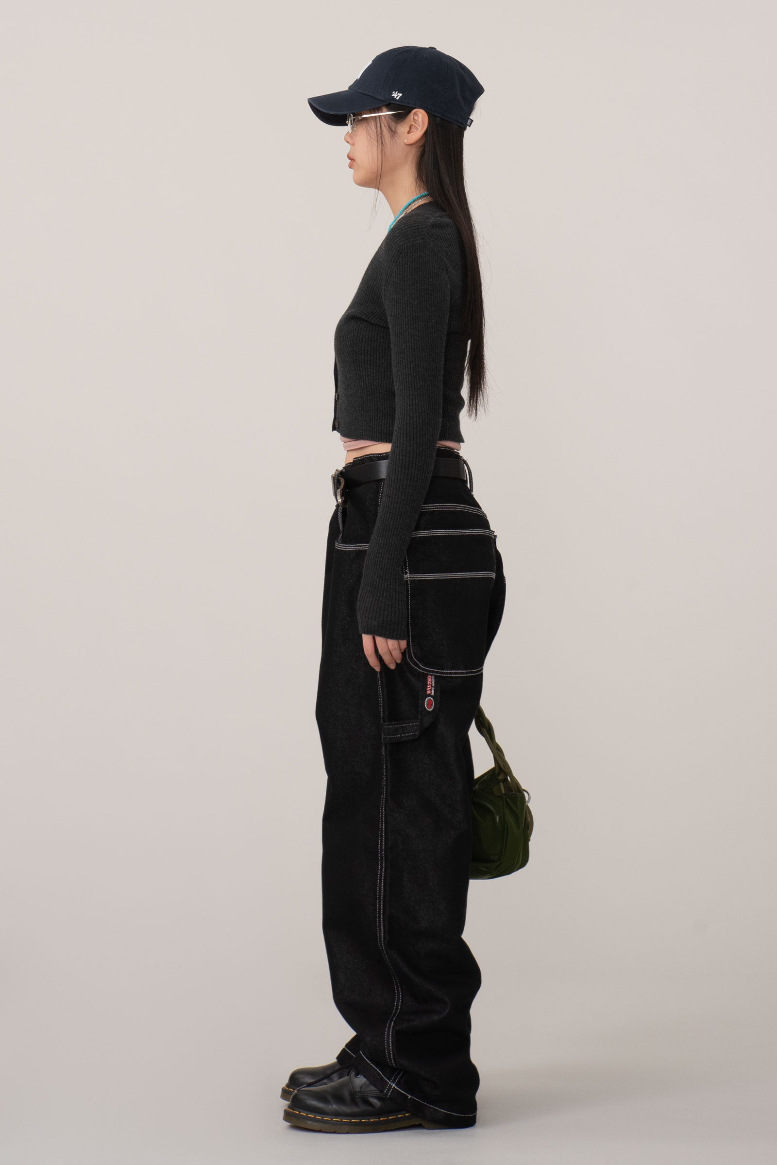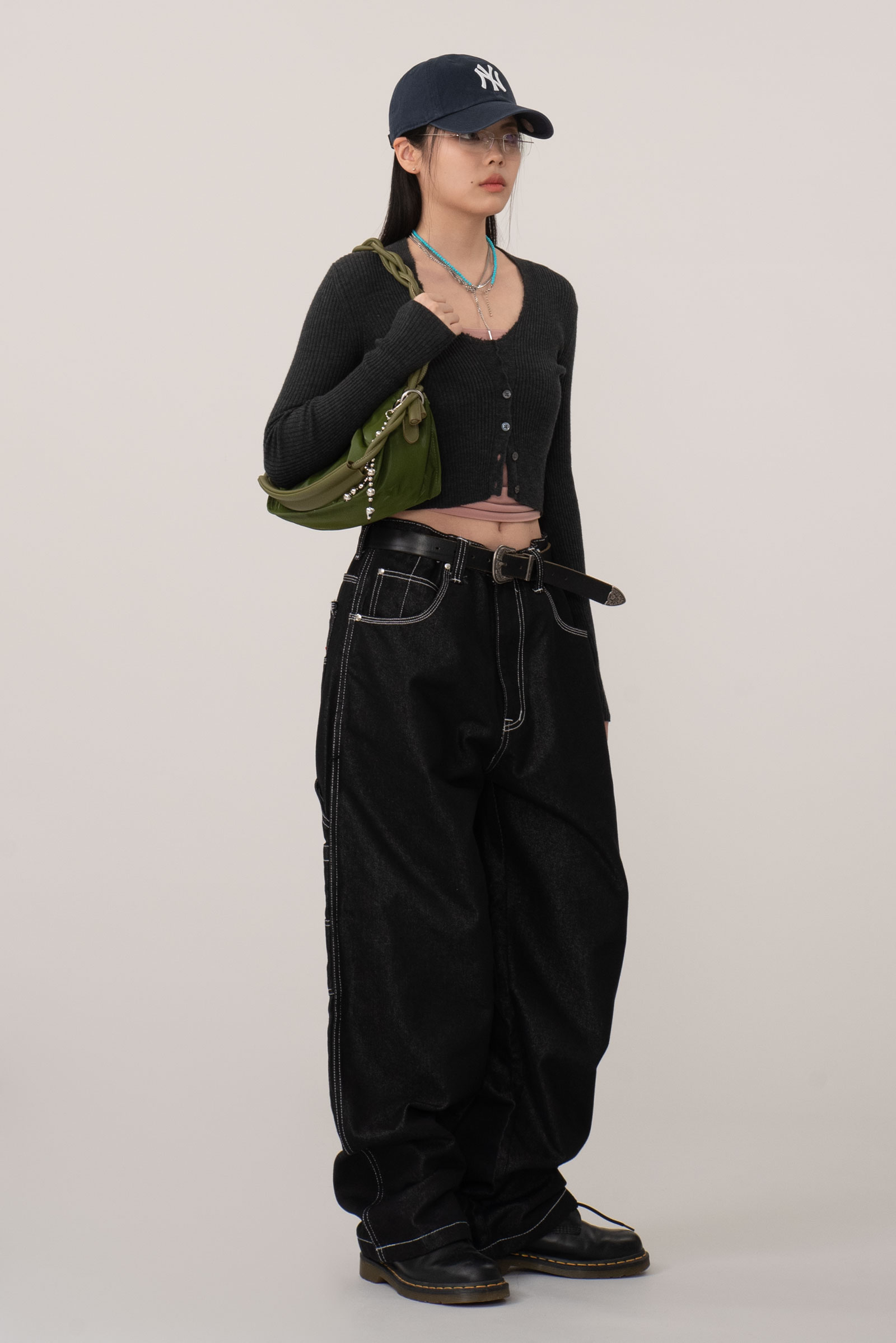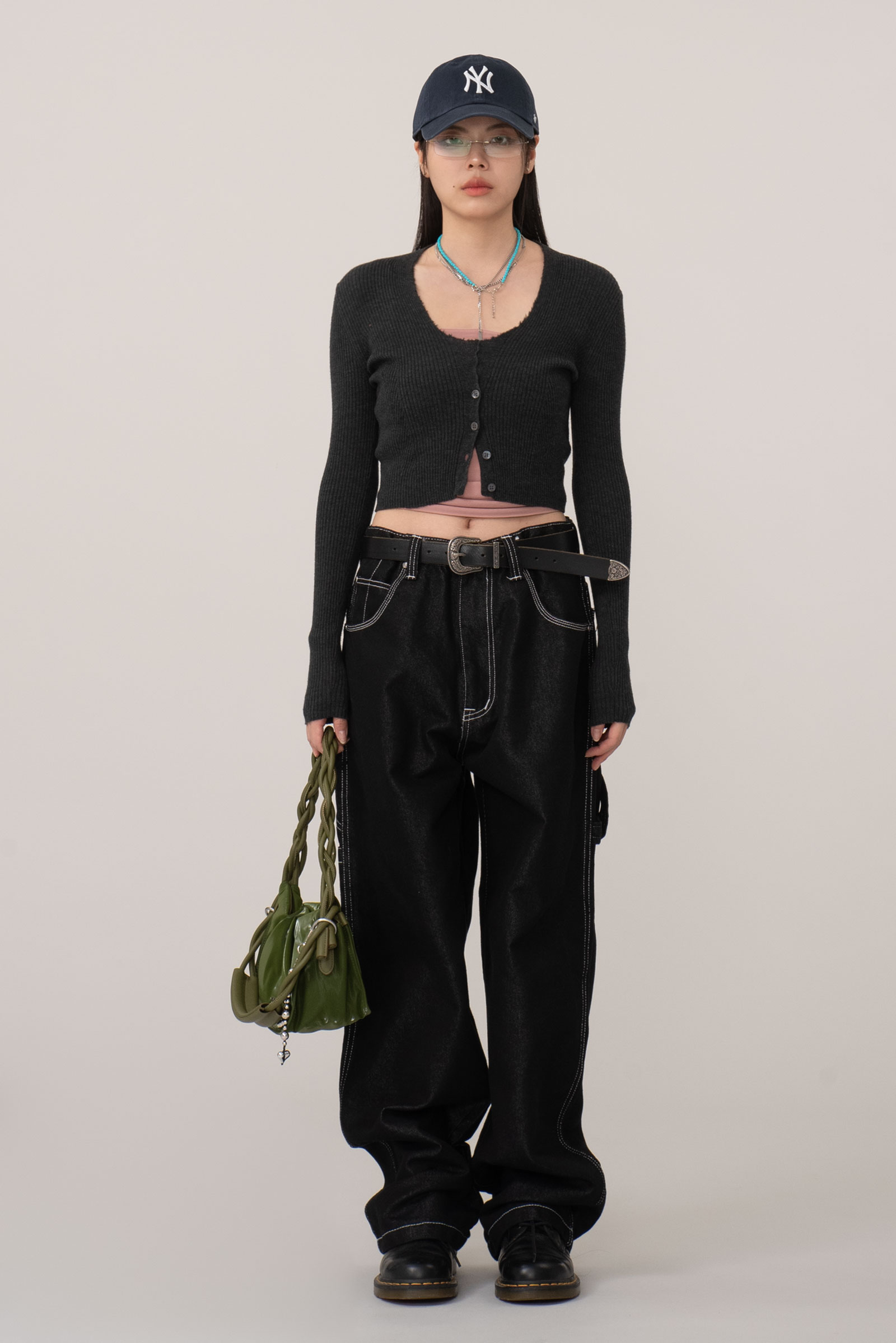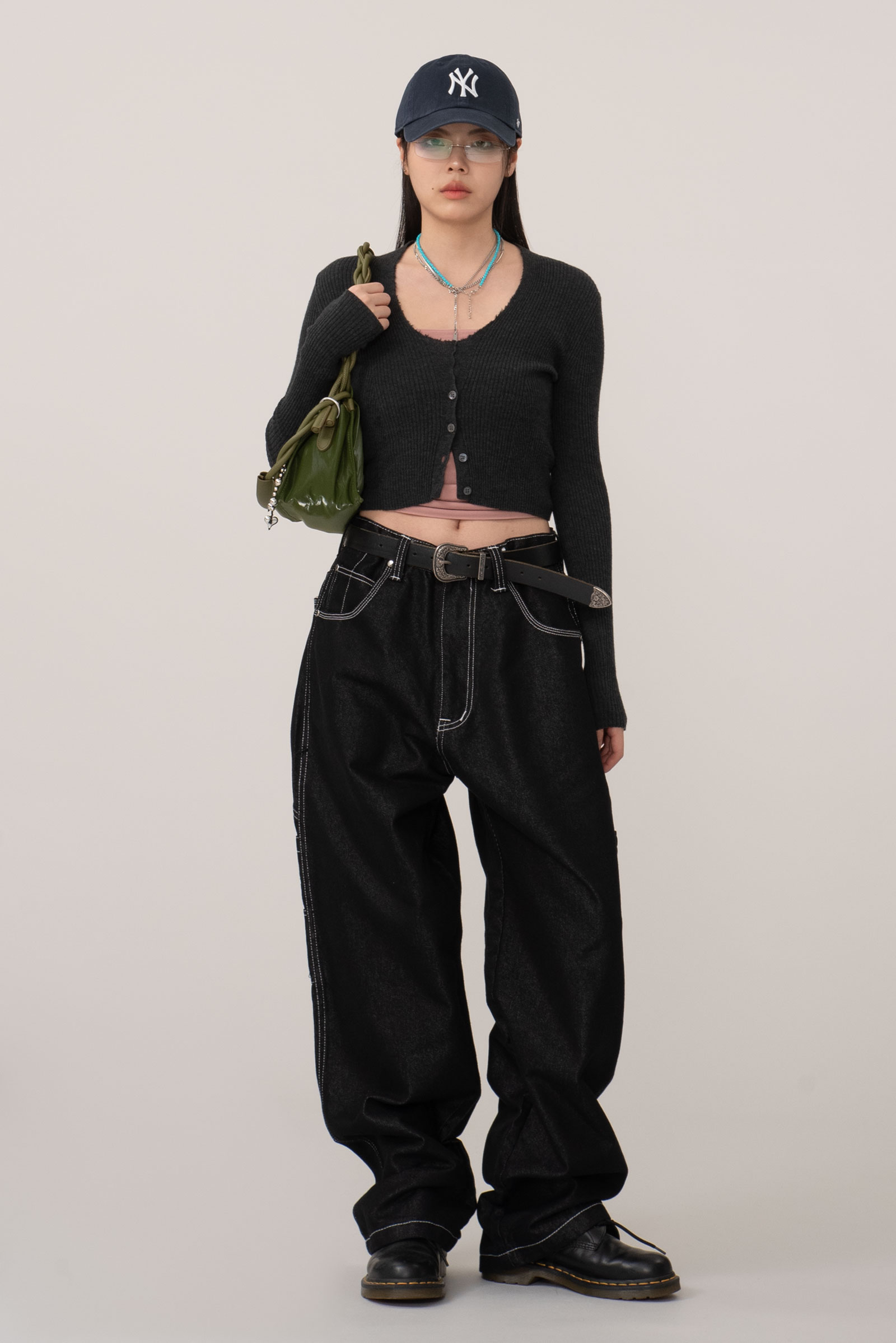 은색 실사가 섞인 러프한 데님 소재, 넉넉하고 여유 있는 널찍한 통으로 질질 끄는 맛으로 입기 좋은 피스랍니다.