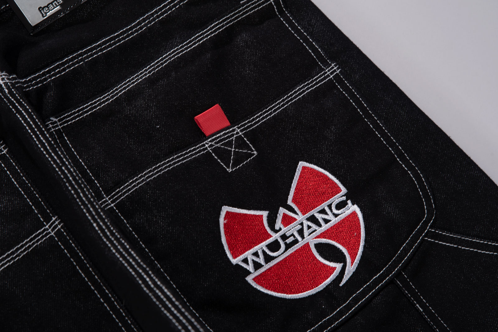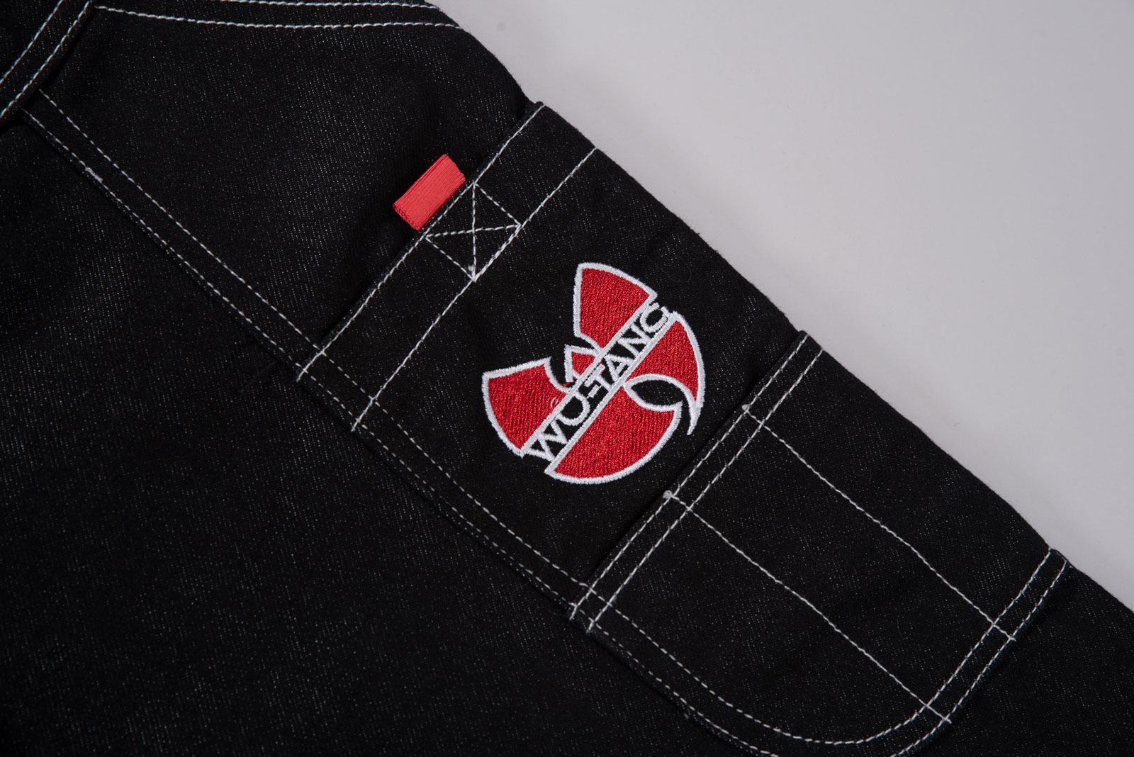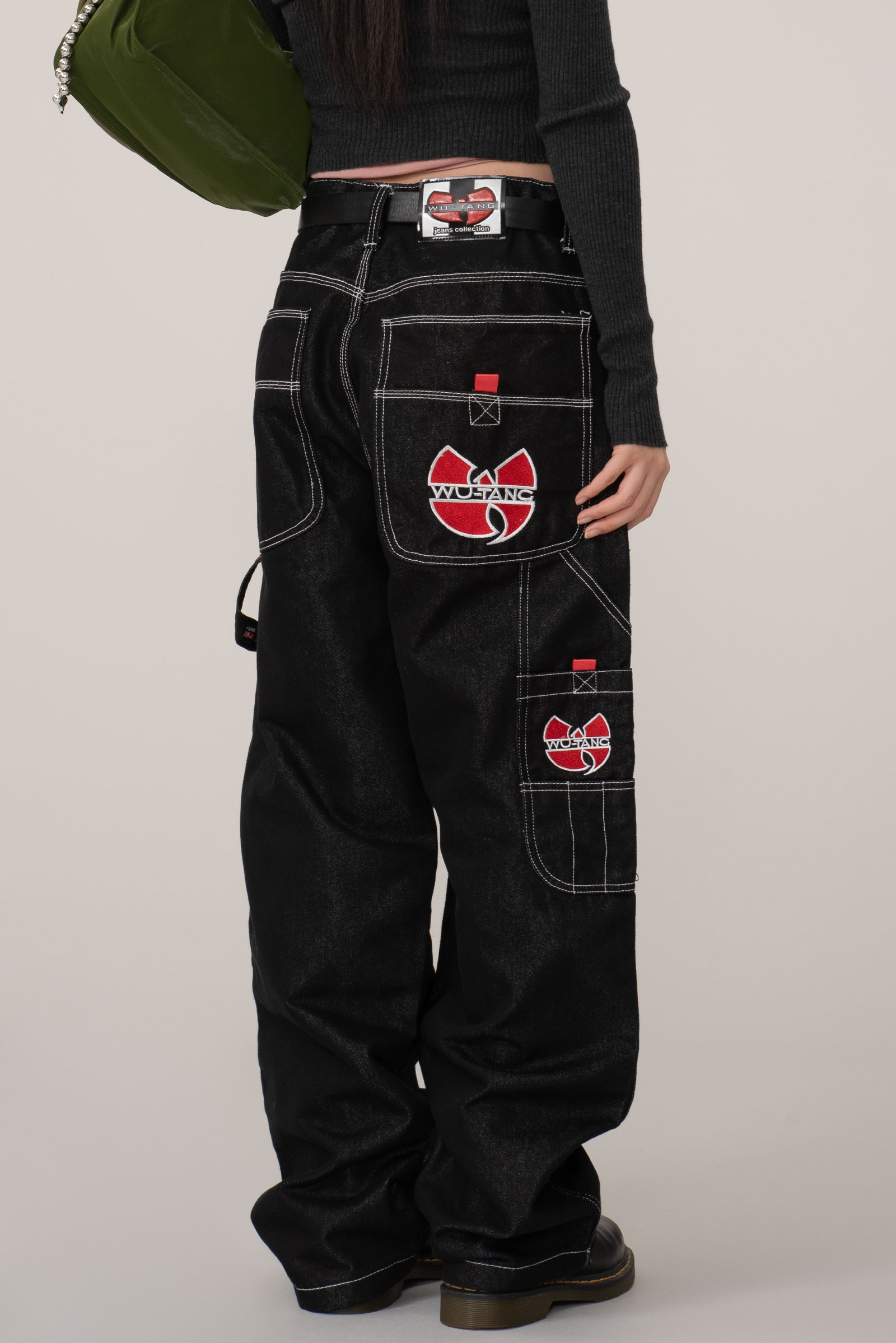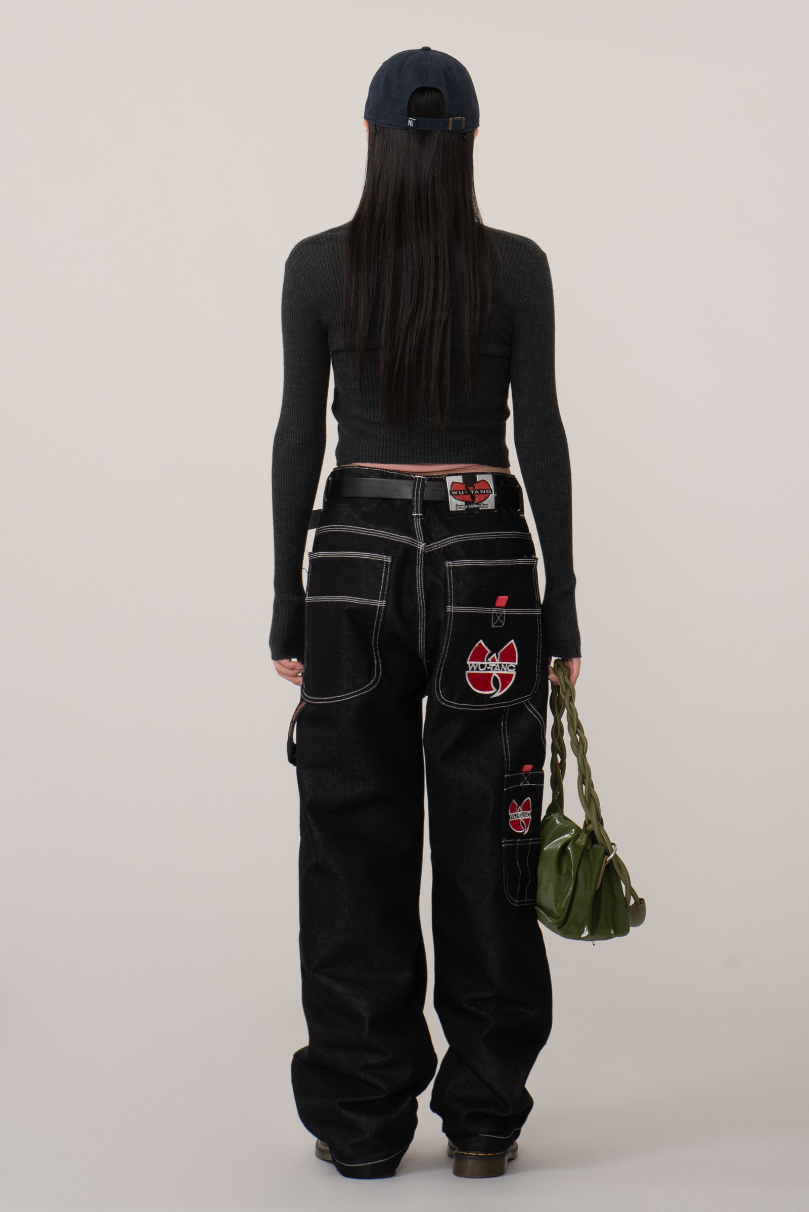 우탱클랜의 시그니처 사인을 로고로 만들어 붙여 백 포켓과 탭, 곳곳에 사용하며 통일감을 주고 검정 바탕에 흰색 스티치를 넣어 컬러 대비를 명확하게 주었고 굉장히 크고 널찍한 백 포켓 역시 눈에 띈답니다.