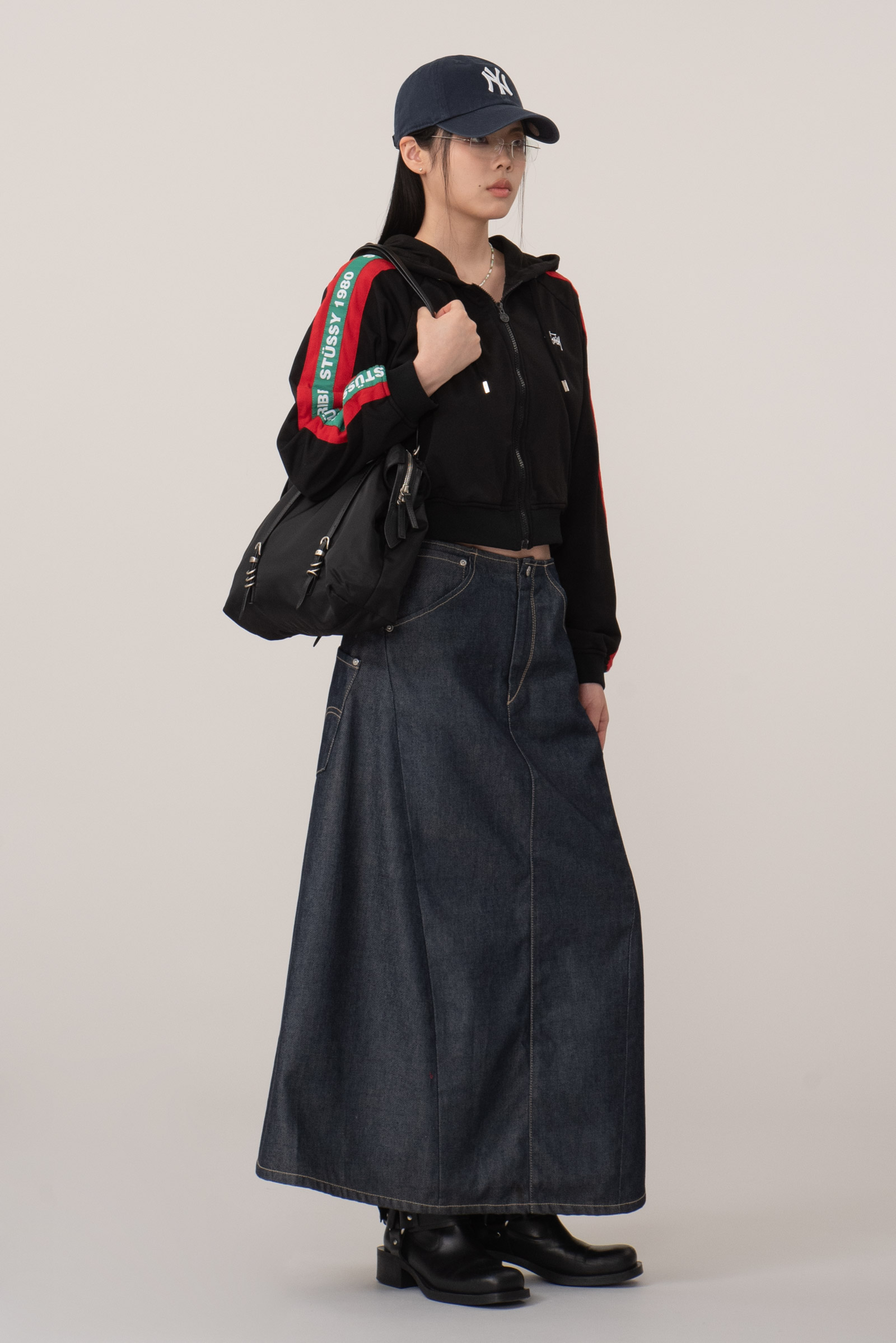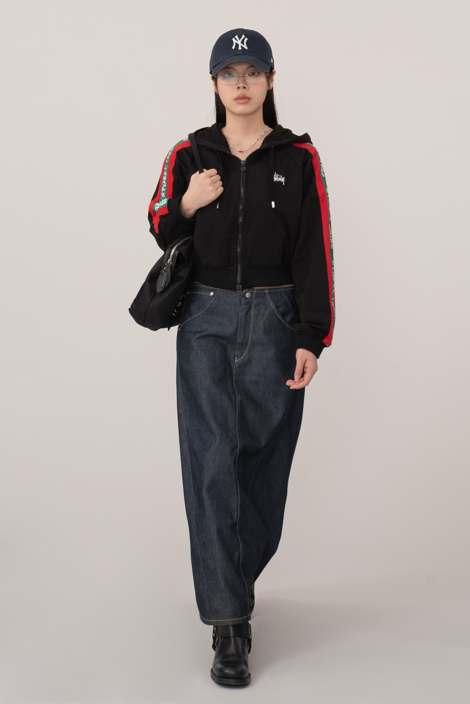 약간 짧은 듯 세미 크롭 기장이라 심심함도 없고 짧은 쇼츠나 트레이닝팬츠와도 합이 좋을듯해요.