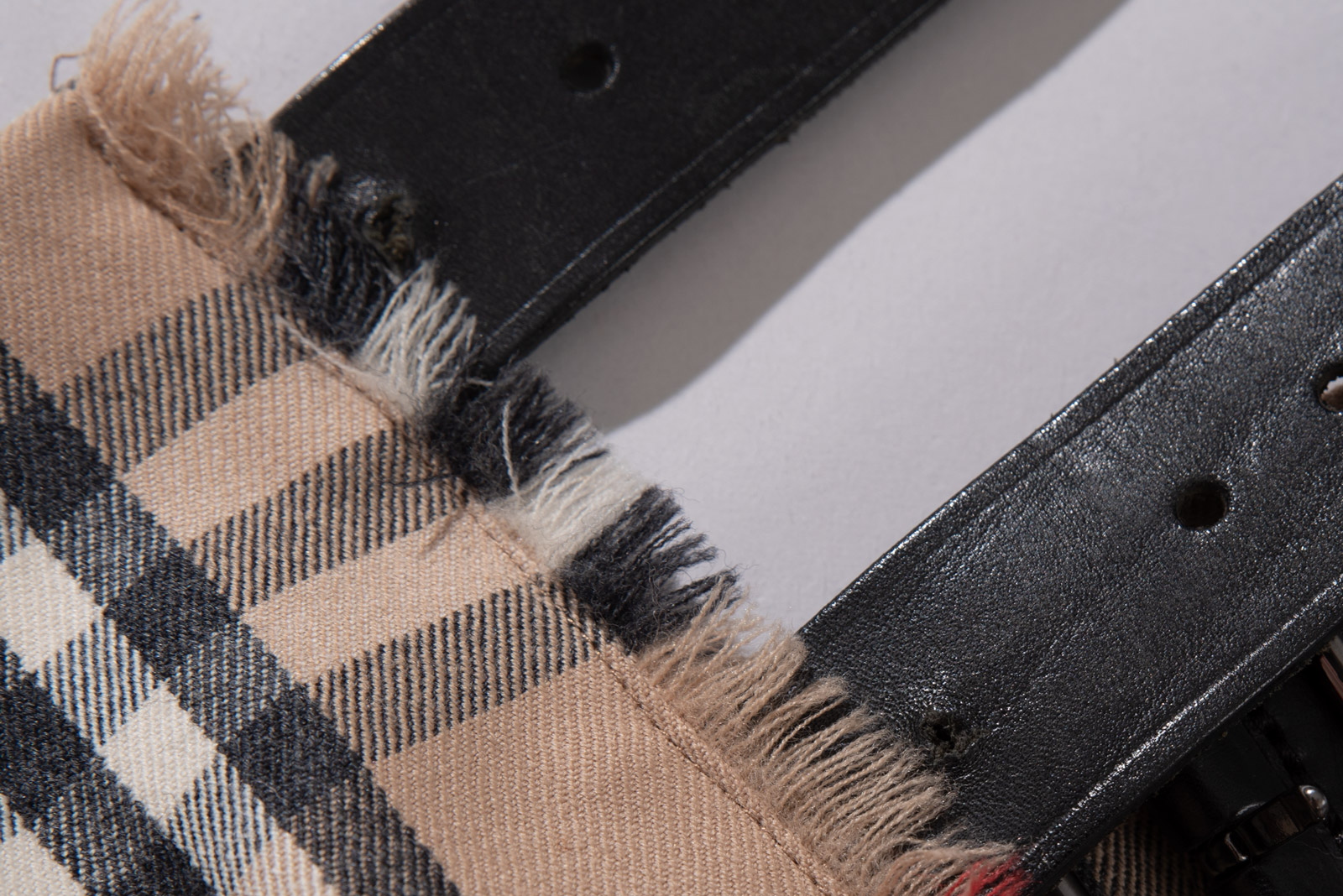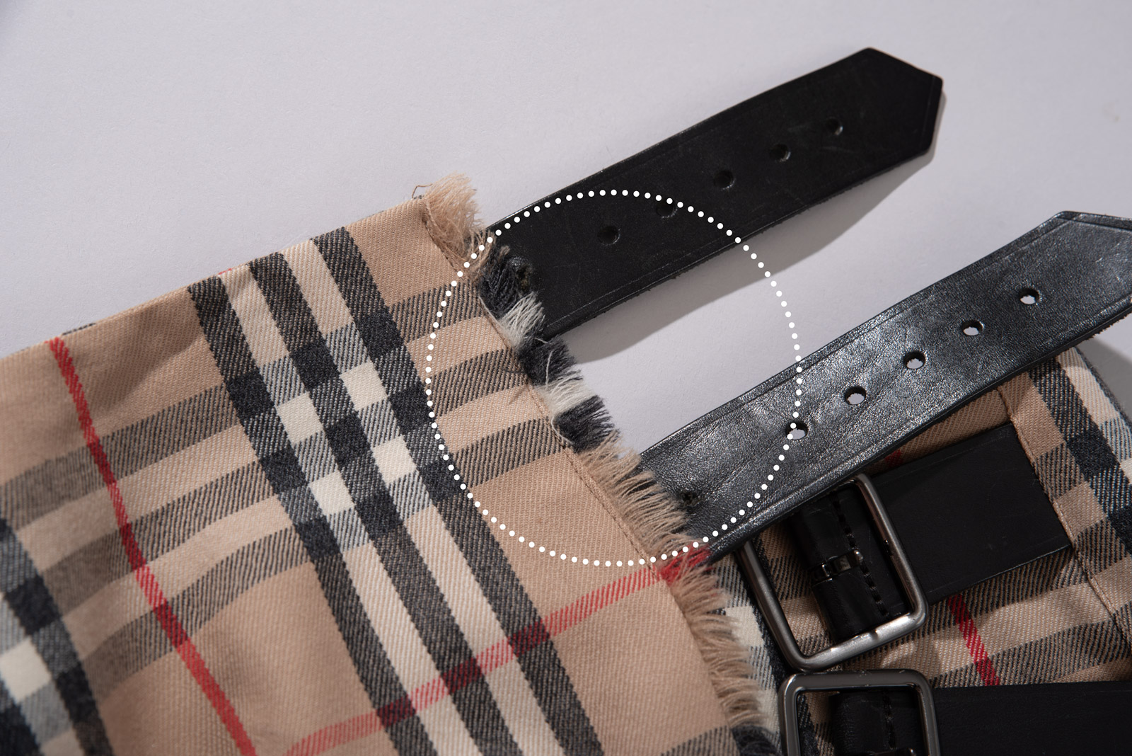 사진으로 보시면 아시겠지만 버클을 끼울 수 있는 가죽에 안쪽으로 구멍을 각 하나씩 더 낸 흔적이 있고 배 안쪽으로 치마를 둘러 가장 먼저 겹쳐지는 부분에 고정 벨크로가 있는데 요 벨크로를 수선한 것 같아요.