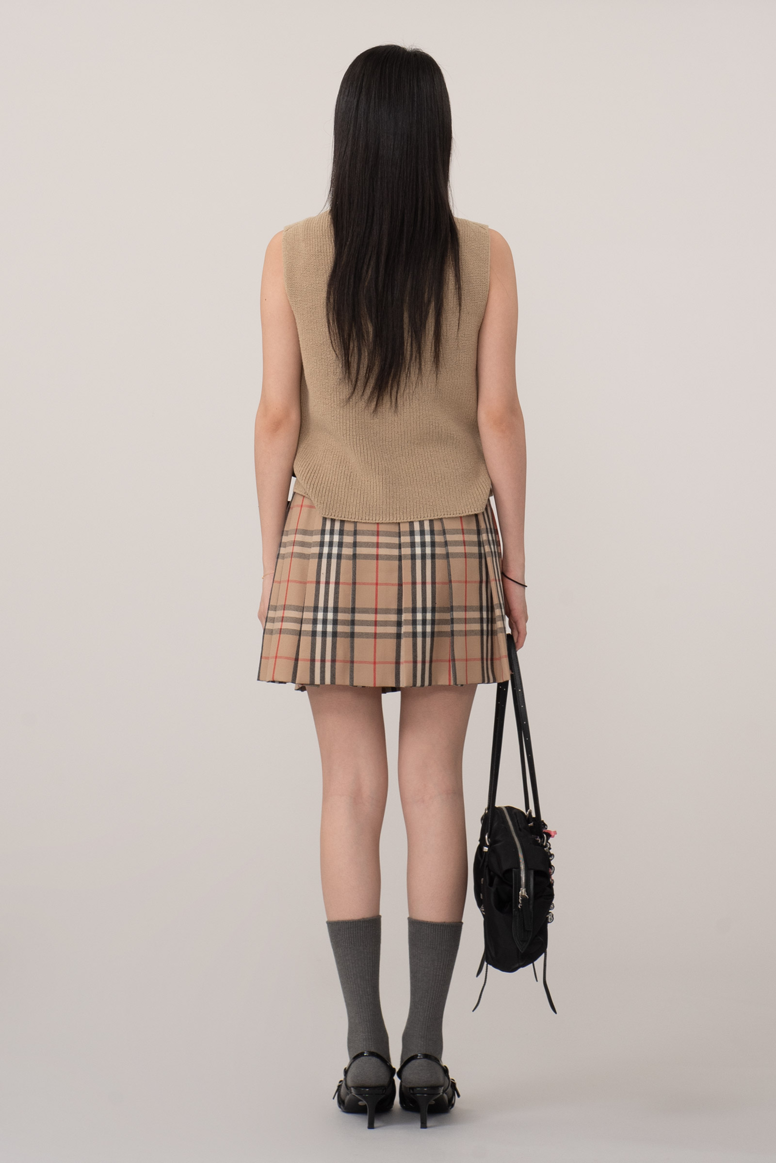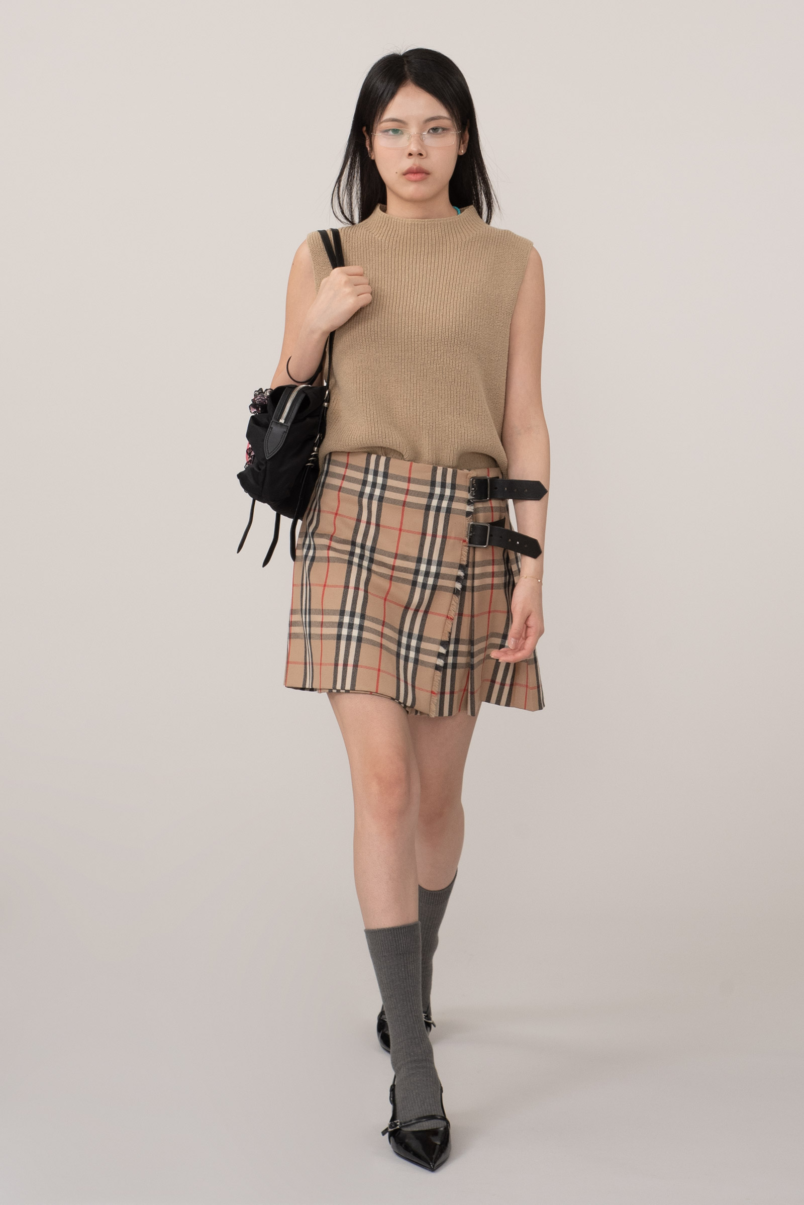 역시나 시그니처 디자인인 커다란 가죽 버클, 후면의 플리츠 주름으로 걸리시하면서도 시크한 무드를 동시에 줄 수 있어 다양한 스타일링에 활용도가 높답니다.