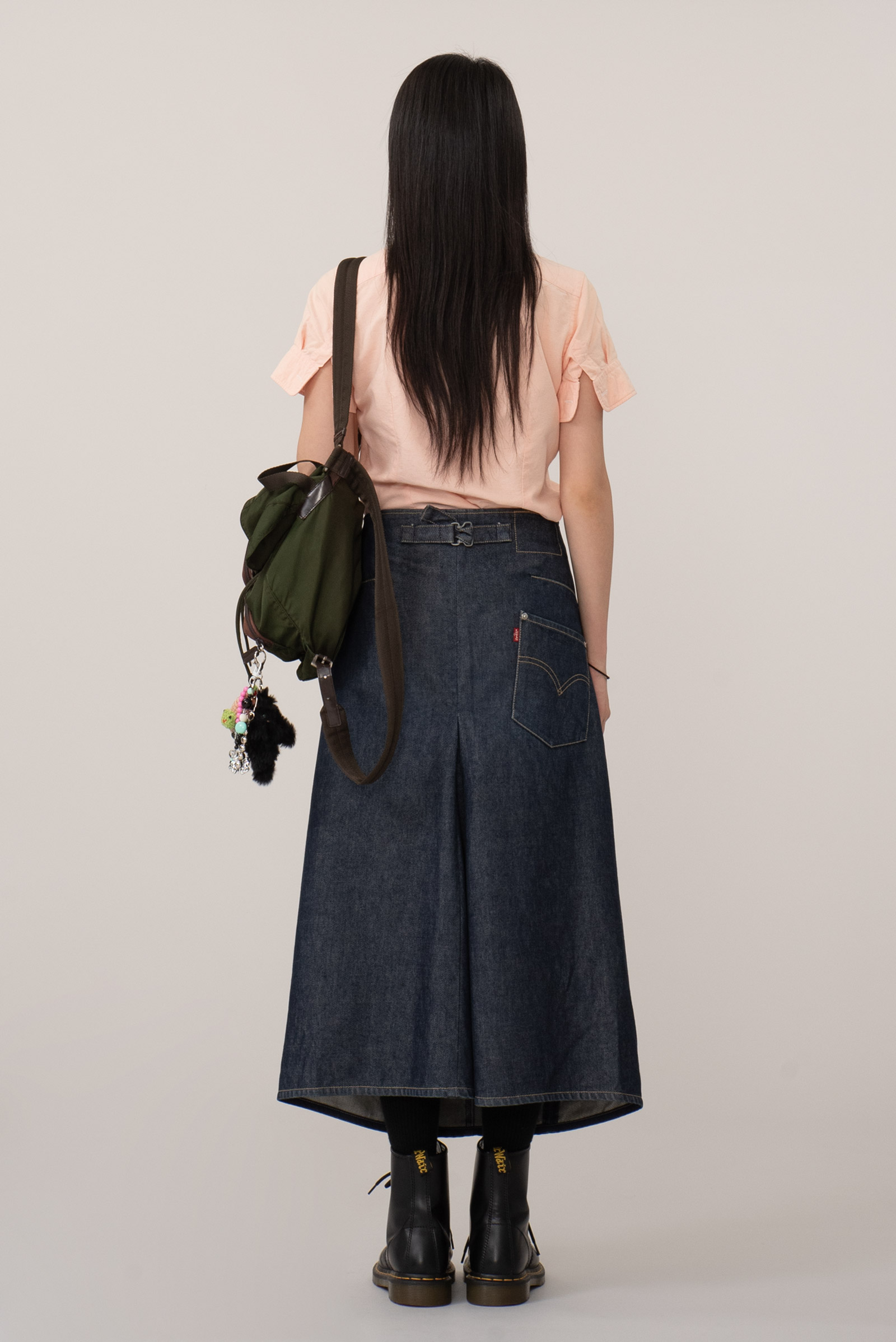 당시 유행했던 엔지니어드 진 스타일은 전통적인 진에 비해 더 실험적이고 독특한 디자인이 특징으로, 이 스커트는 그중에서도 특히 입체적인 실루엣이 눈에 띕니다.