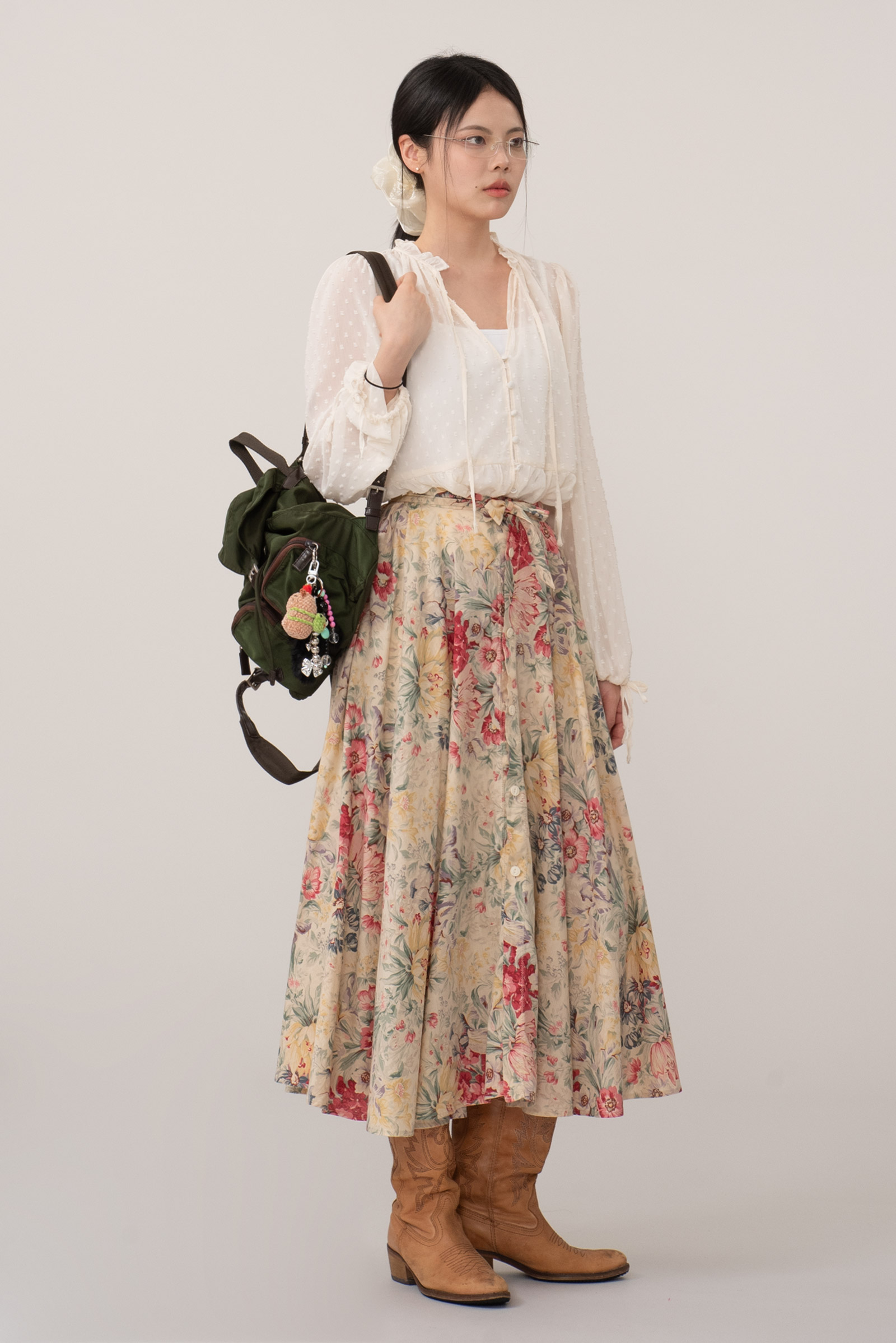 봄, 여름, 가을까지 쾌적하게 착용할 수 있으며 플레어 실루엣과 빈티지 플로럴 프린트의 밸런스가 굉장히 좋아요.