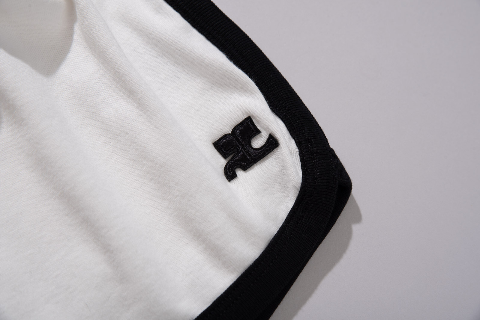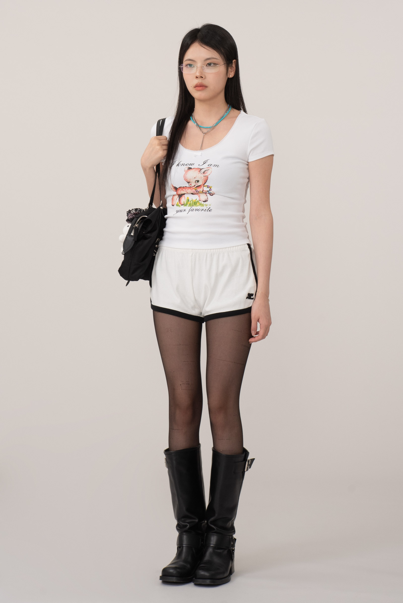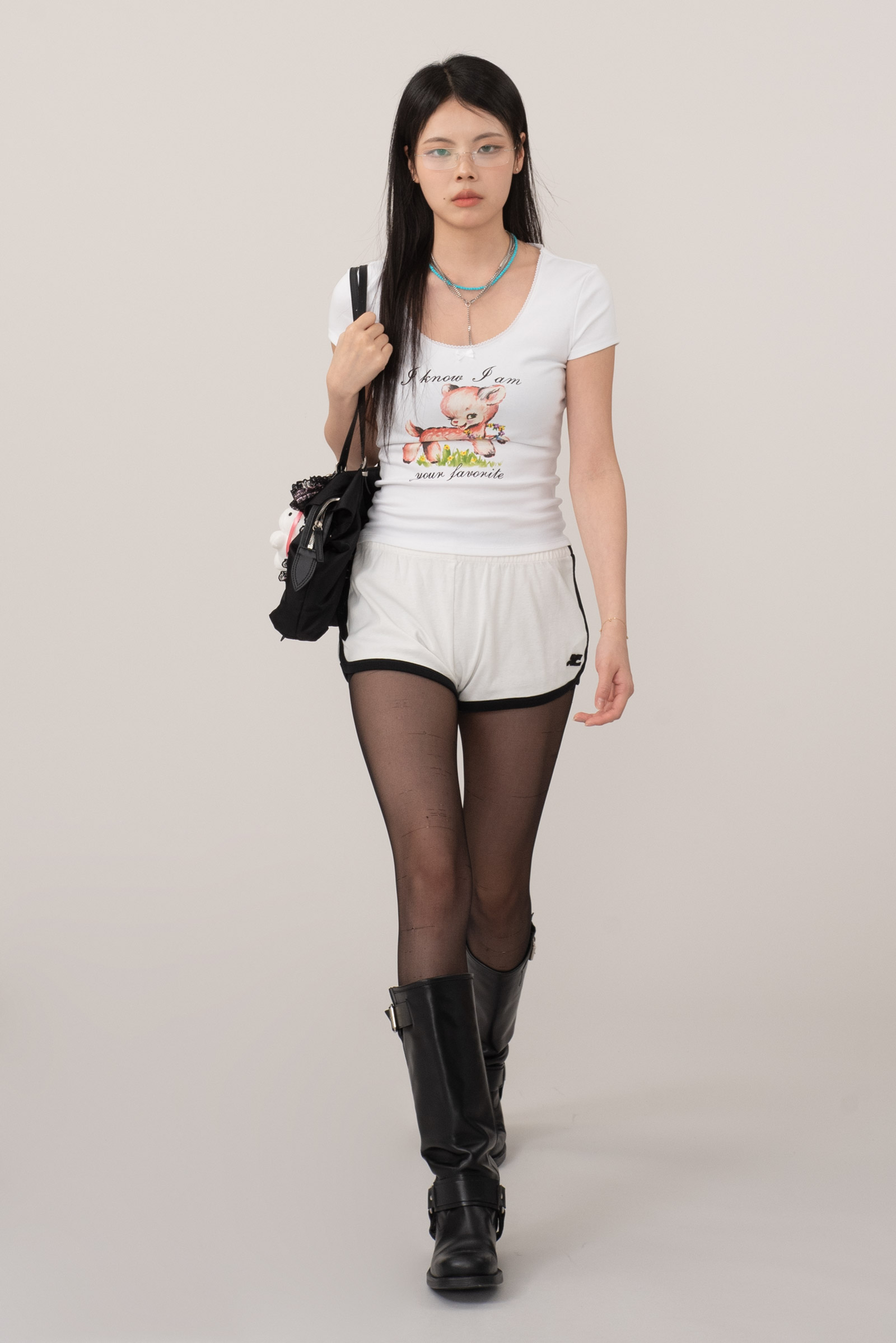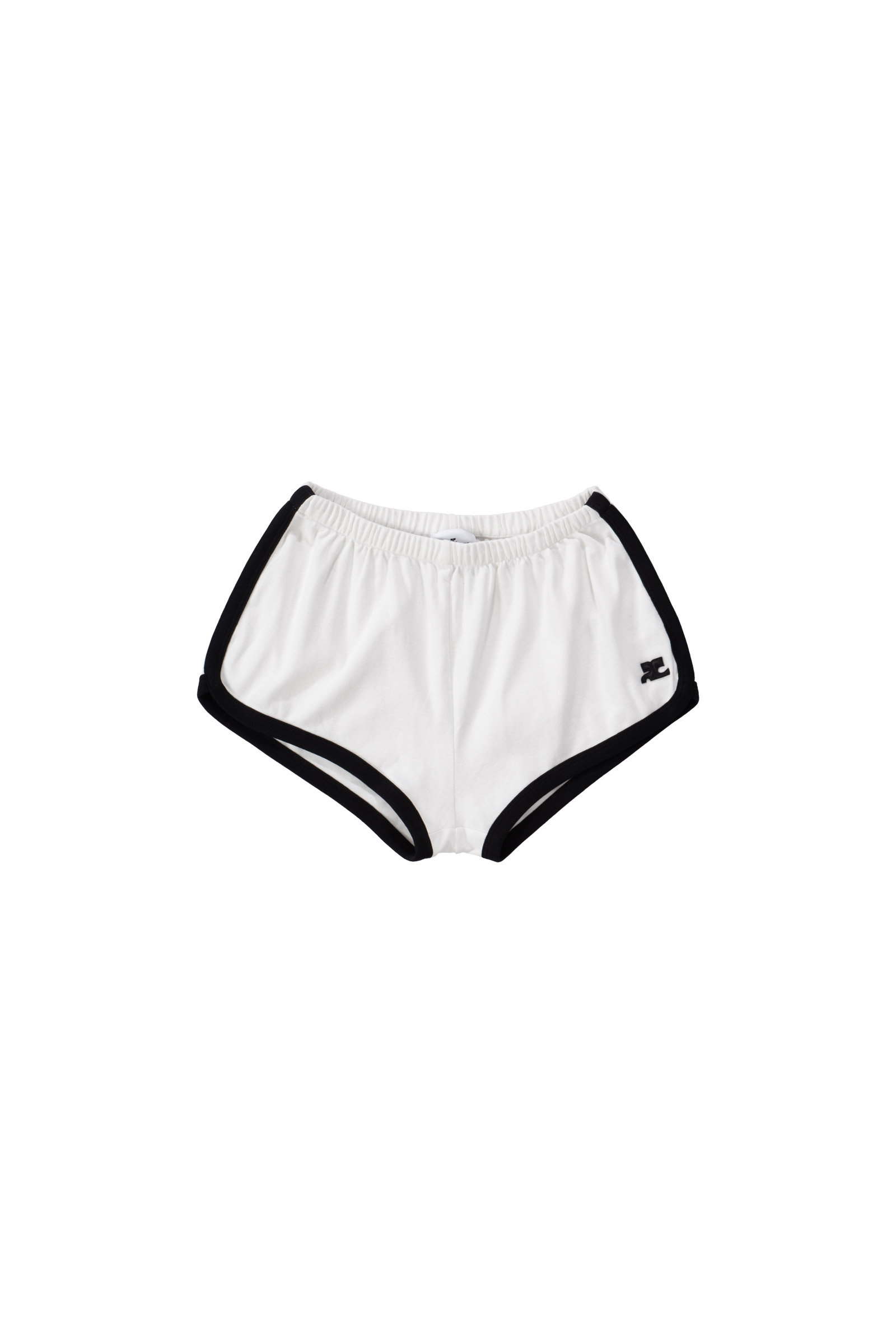 마이크로 팬츠이지만 얇고 비치는 소재의 컬러 스타킹과 함께 매치를 하시면 부담 없이 캐주얼하게 즐기실 수 있고, 부드러운 코튼 소재로 흰색 바디를 감싸는 검정 테두리가 레트로한 대비감과 입체감을 주며 실루엣을 또렷하게 잡아줘서 부한 느낌이 없어요.
