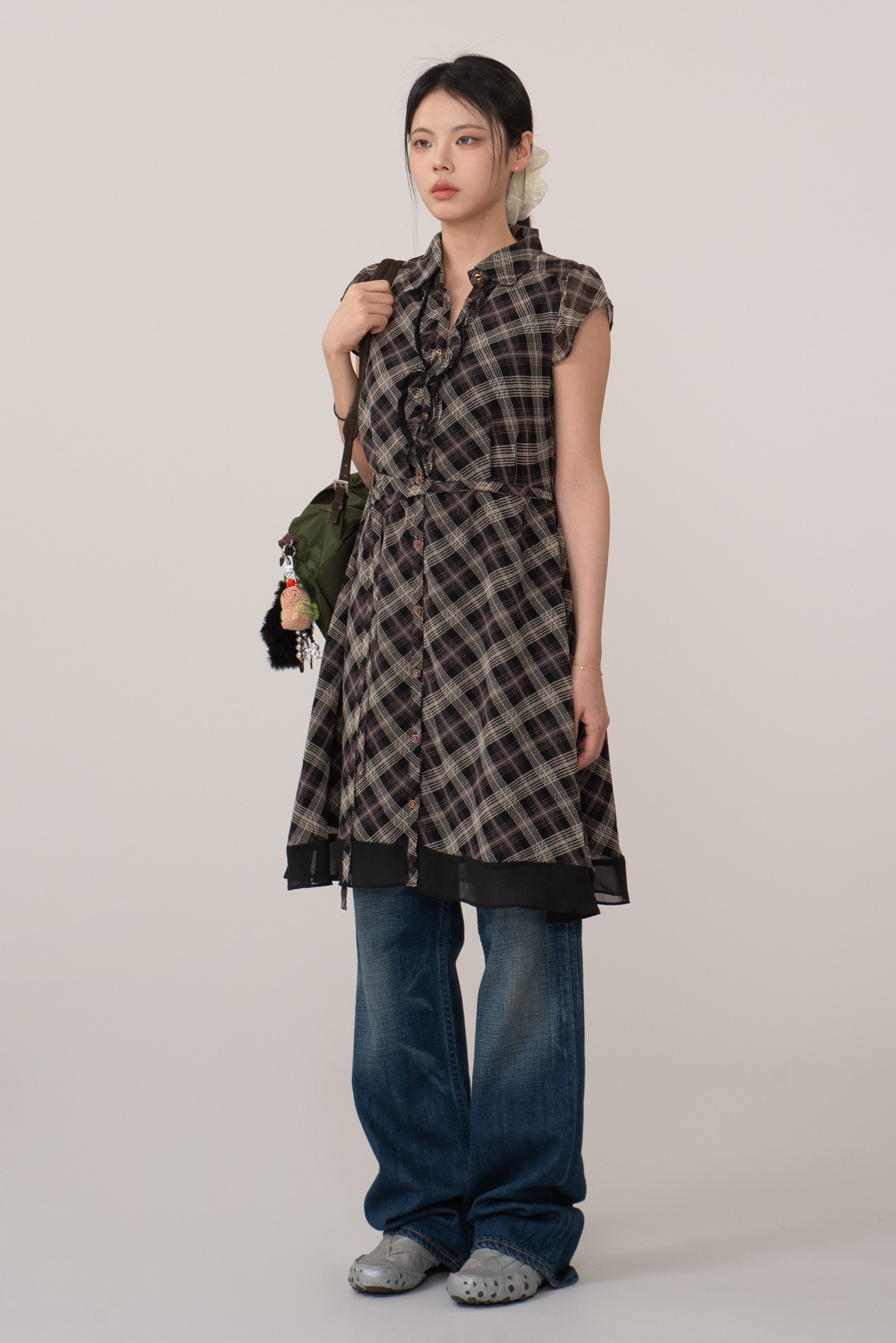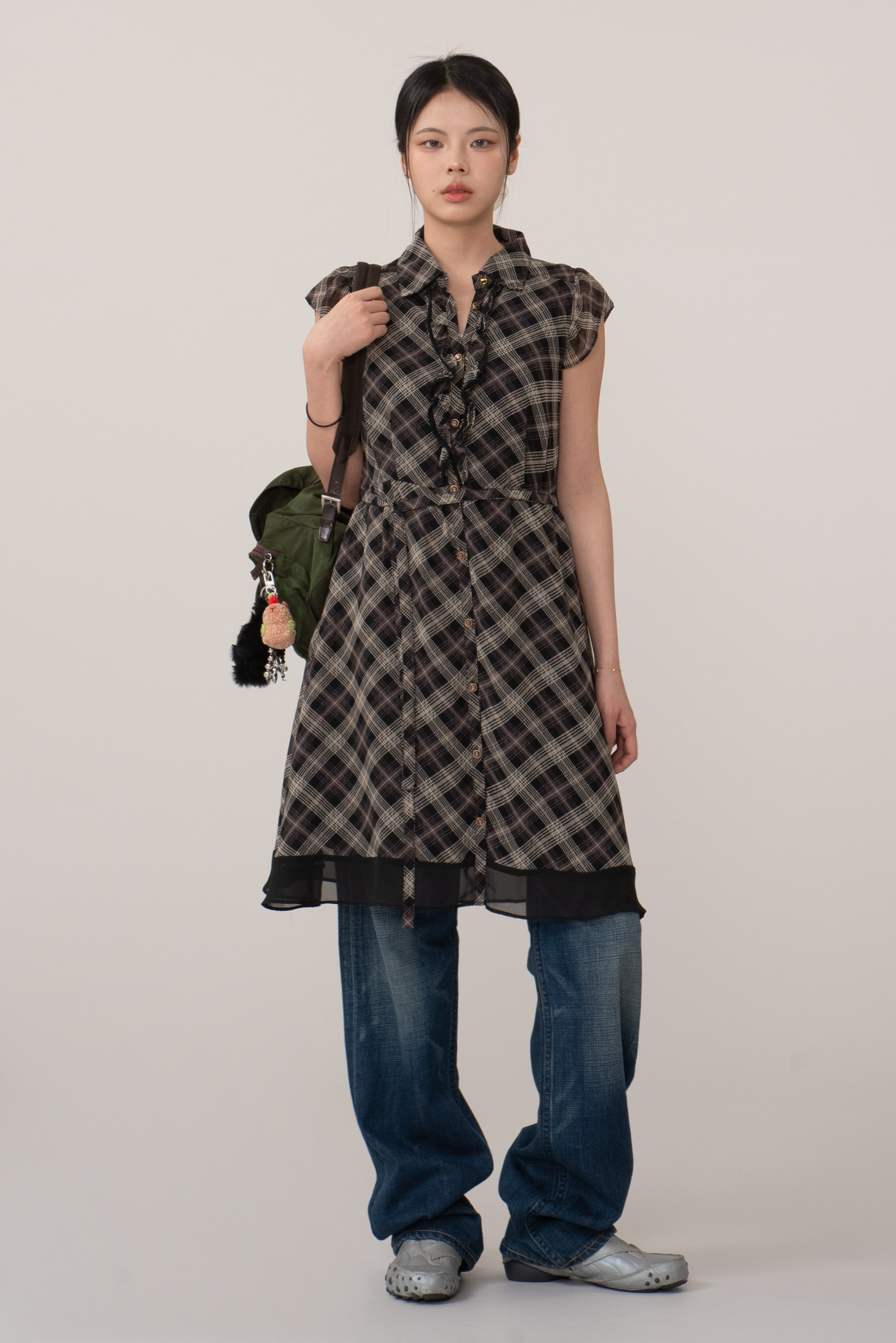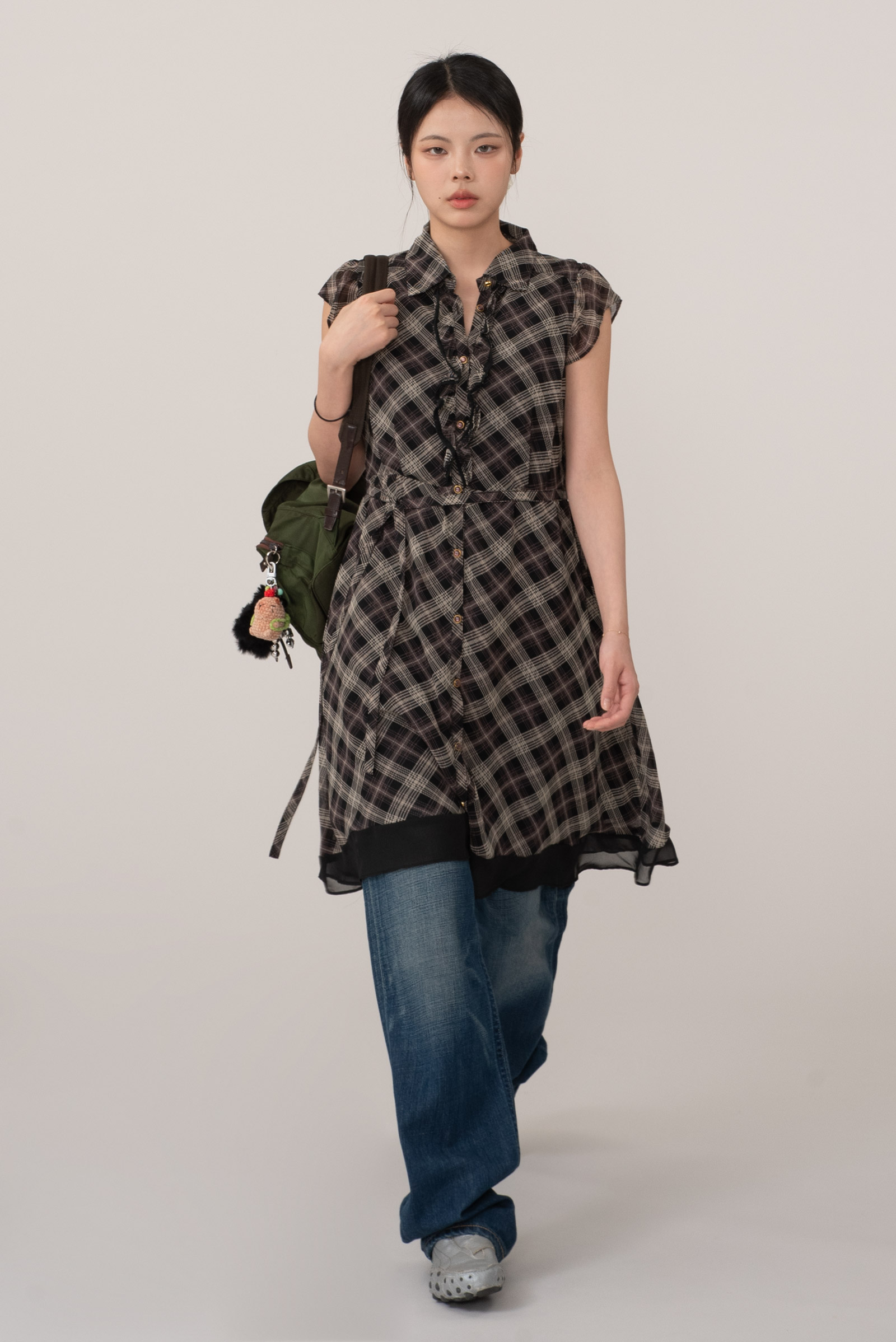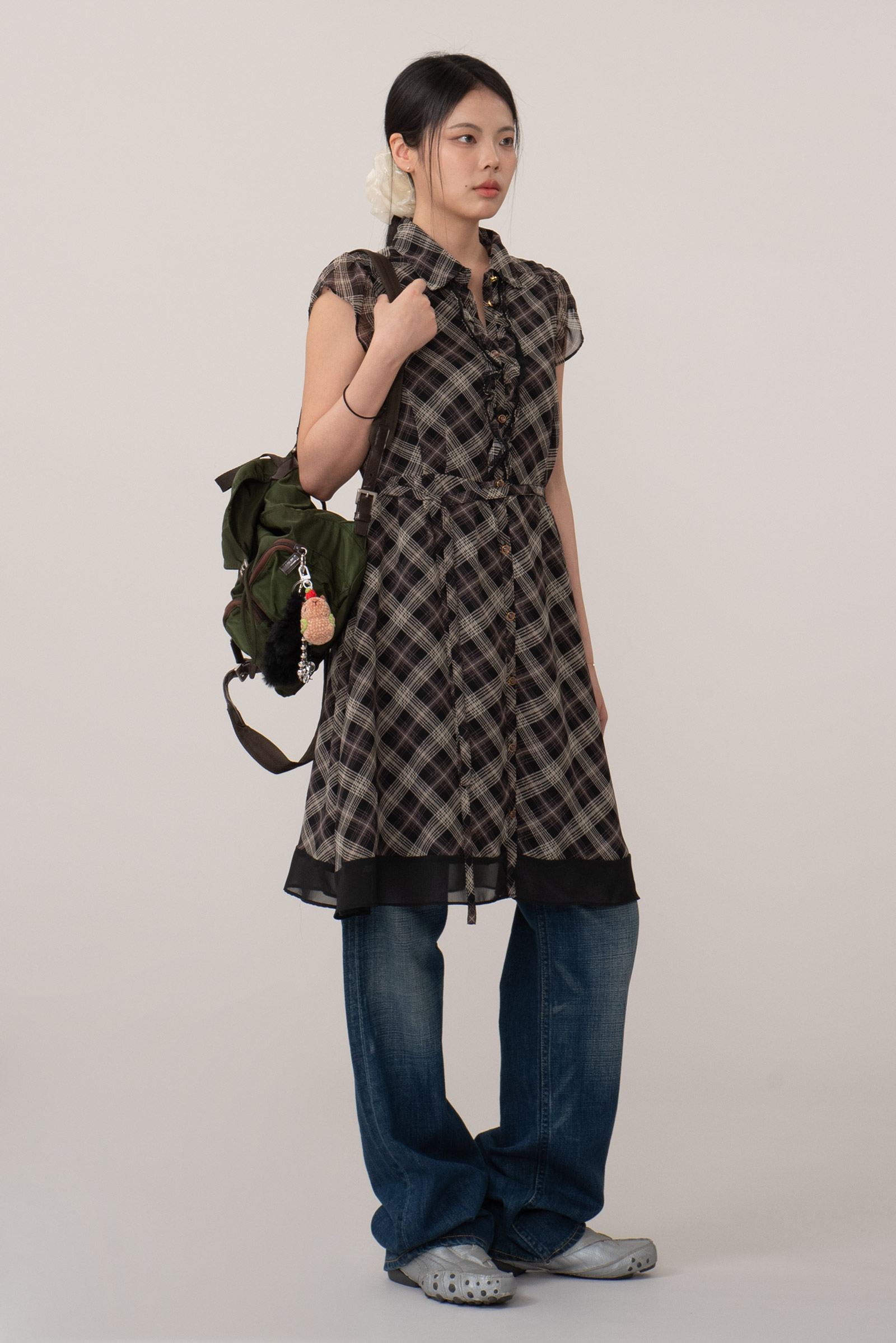 잔잔한 체크 패턴 위로 흐르는 프릴 디테일이 사랑스럽고, 가볍고 얇은 원단 덕분에 여름철 혹은 더운 날씨에도 딱 좋은 아이템이랍니다.